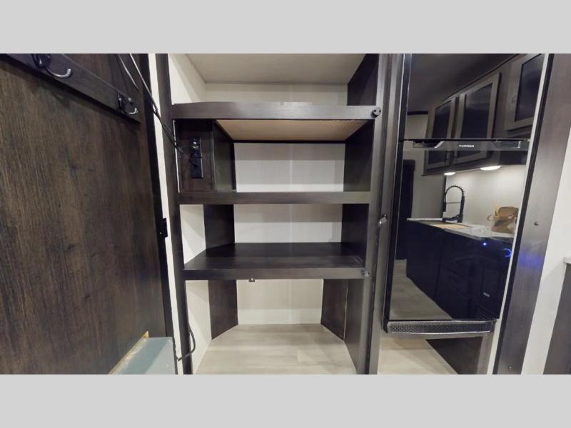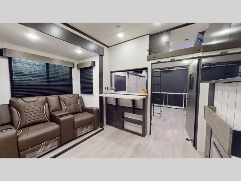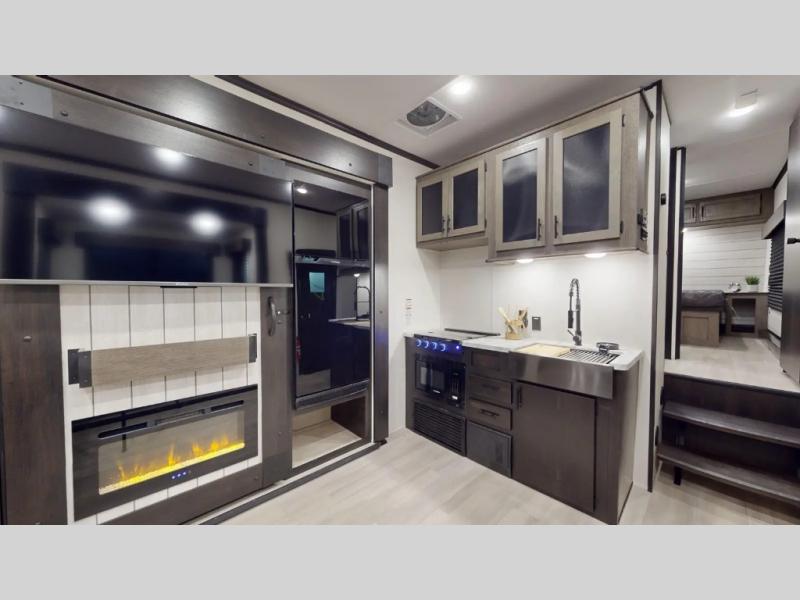 Fun at the campground begins with this toy hauler in tow! There is a 13' separate garage with a loft above for guests plus a patio deck to entertain guests. Your crew can get comfy on the theater seating across from the fireplace, and there is a hidden pantry behind here to keep food stocked. The two flip-up countertops with stools provides a fun place to dine since there is a window between, or you can head outdoors to enjoy some fresh air under the two power awnings. A full bath lets you freshen up after a trail ride, and the front private bedroom gives you your own space at night. This unit also features washer and dryer prep in the bedroom so you can add those appliances if you wish!