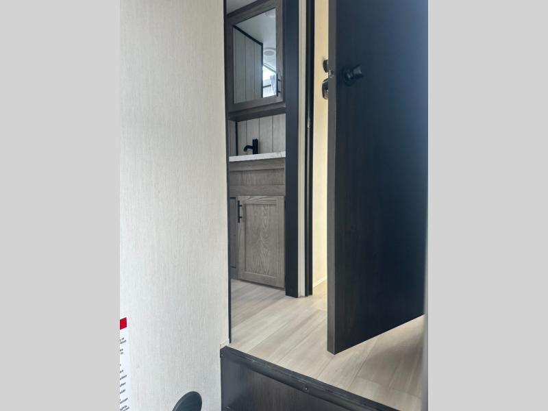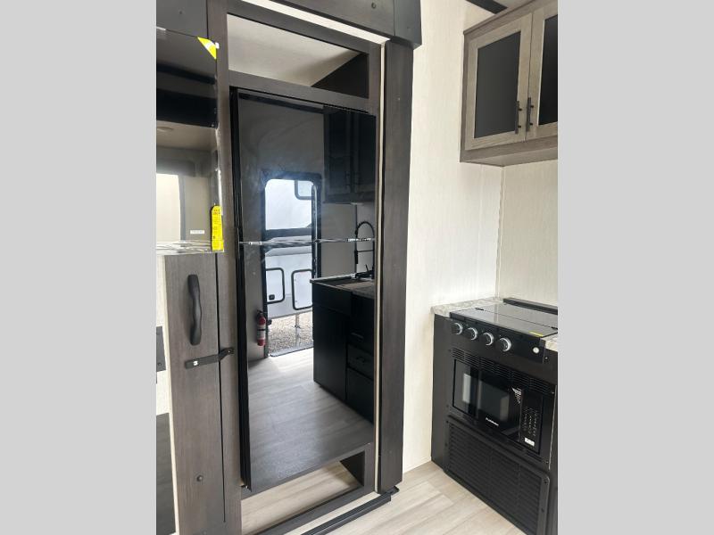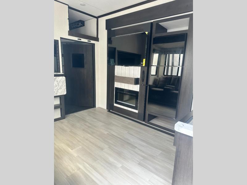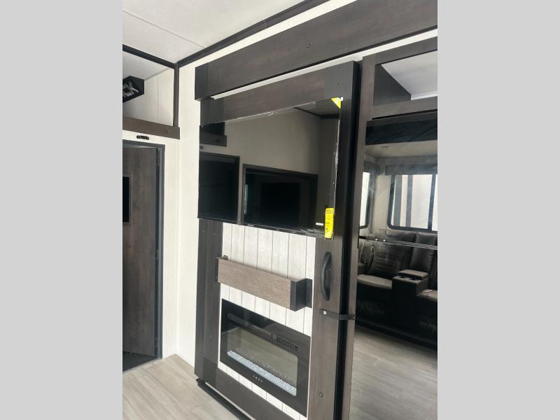 Fun at the campground begins with this toy hauler in tow! There is a 13' separate garage with a loft above for guests plus a patio deck to entertain guests. Your crew can get comfy on the theater seating across from the fireplace, and there is a hidden pantry behind to keep food stocked. The two flip-up countertops with stools provides a fun place to dine since there is a window between, or you can head outdoors to enjoy some fresh air under the two power awnings. A full bath lets you freshen up after a trail ride, and the front private bedroom gives you your own space at night. This unit also features washer and dryer prep in the bedroom so you can add those appliances if you wish!