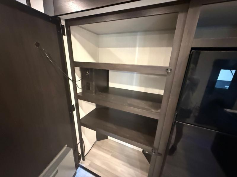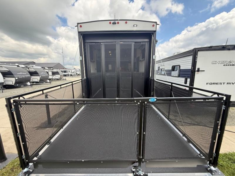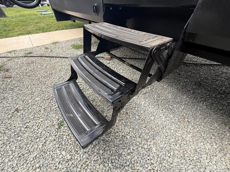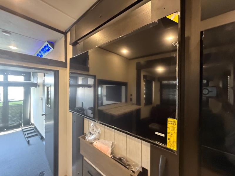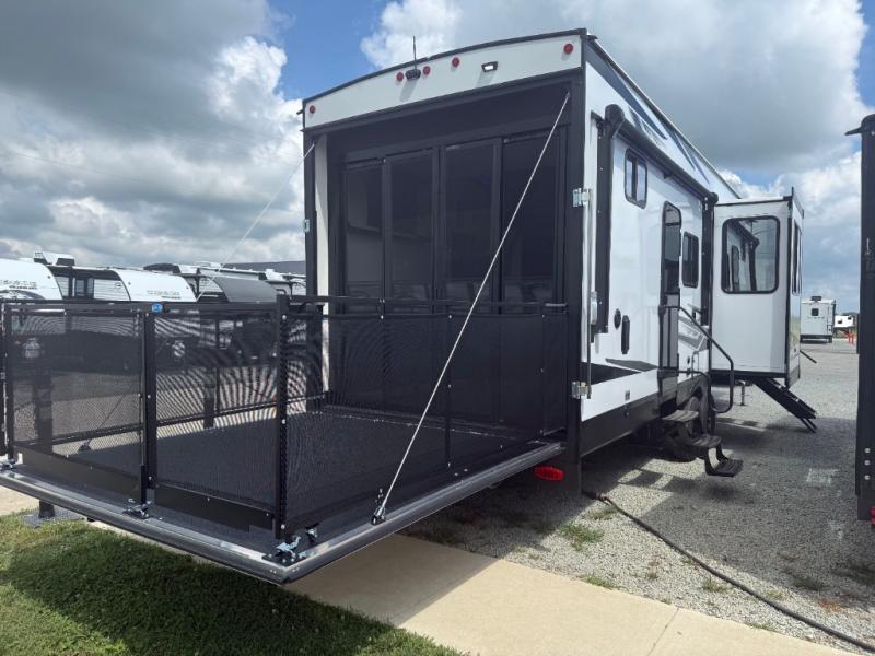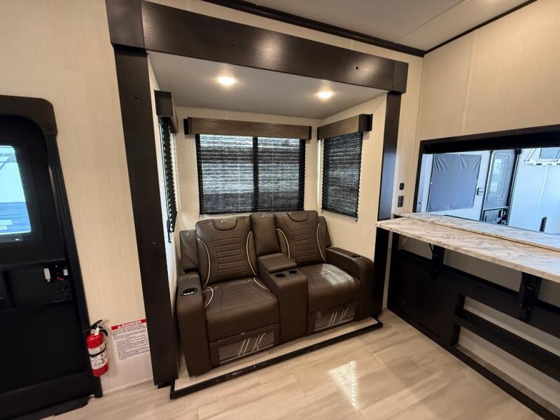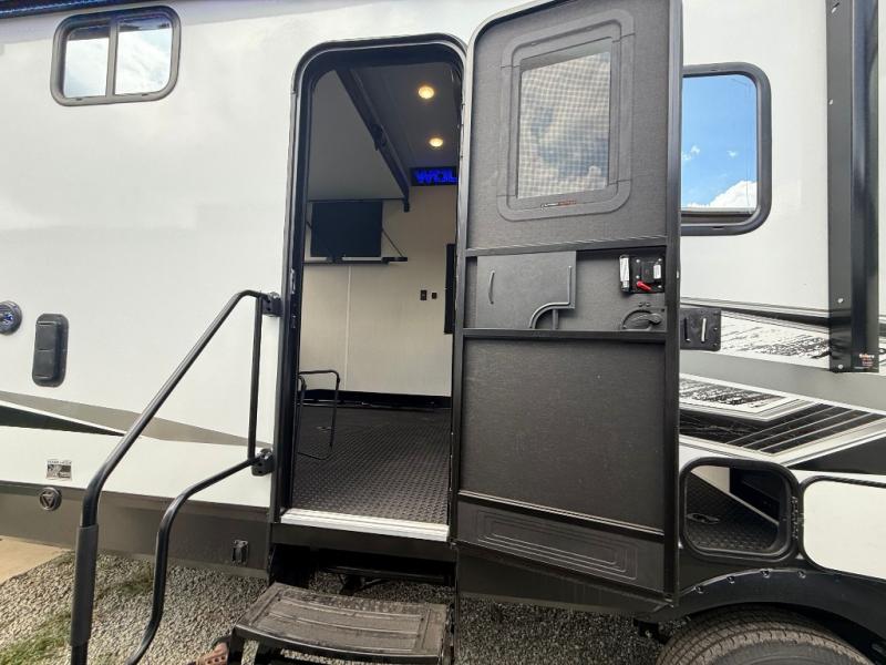 Fun at the campground begins with this toy hauler in tow! There is a 13' separate garage with a loft above for guests plus a patio deck to entertain guests. Your crew can get comfy on the theater seating across from the fireplace, and there is a hidden pantry behind to keep food stocked. The two flip-up countertops with stools provides a fun place to dine since there is a window between, or you can head outdoors to enjoy some fresh air under the two power awnings. A full bath lets you freshen up after a trail ride, and the front private bedroom gives you your own space at night. This unit also features washer and dryer prep in the bedroom so you can add those appliances if you wish!