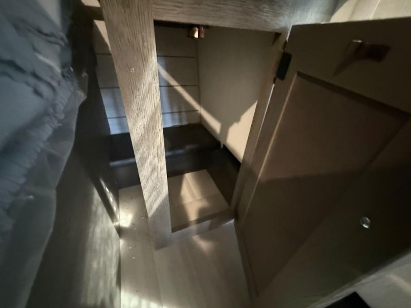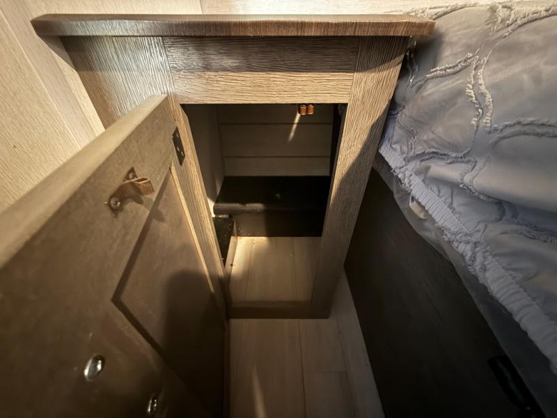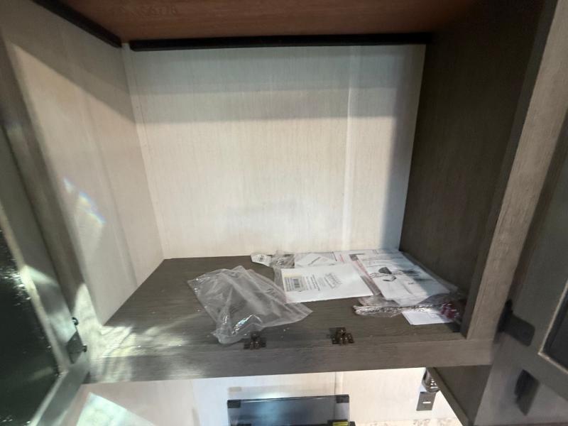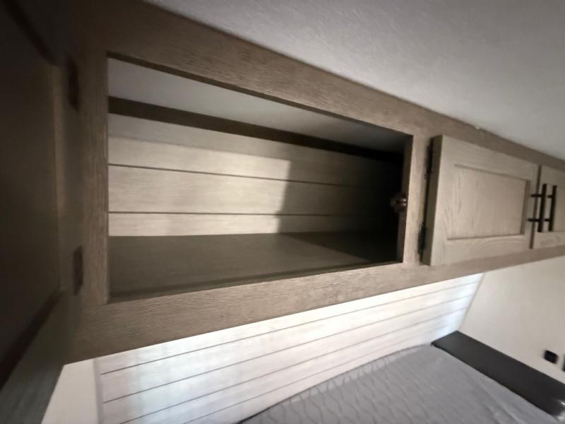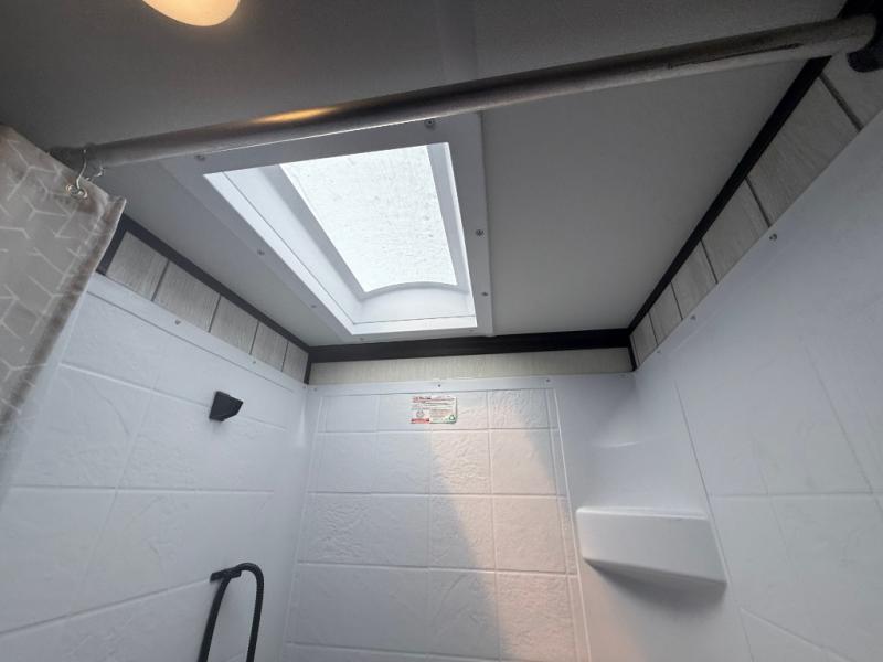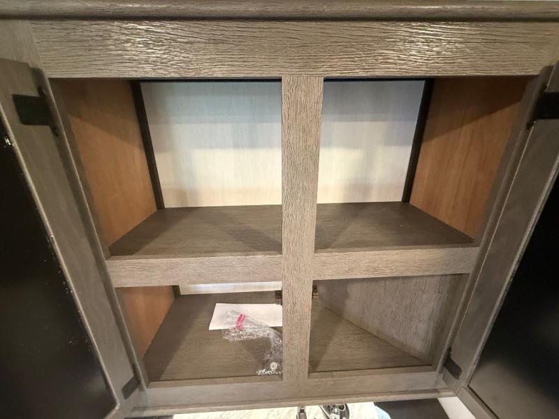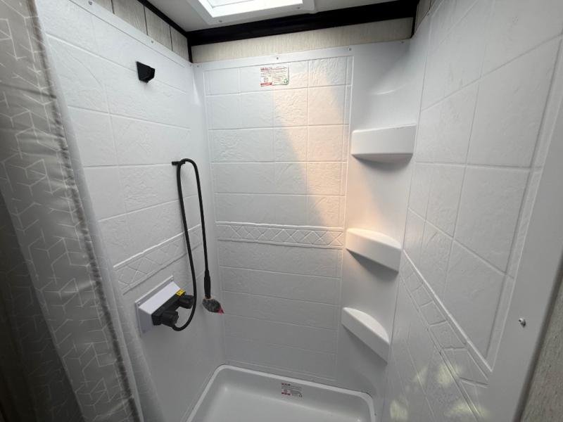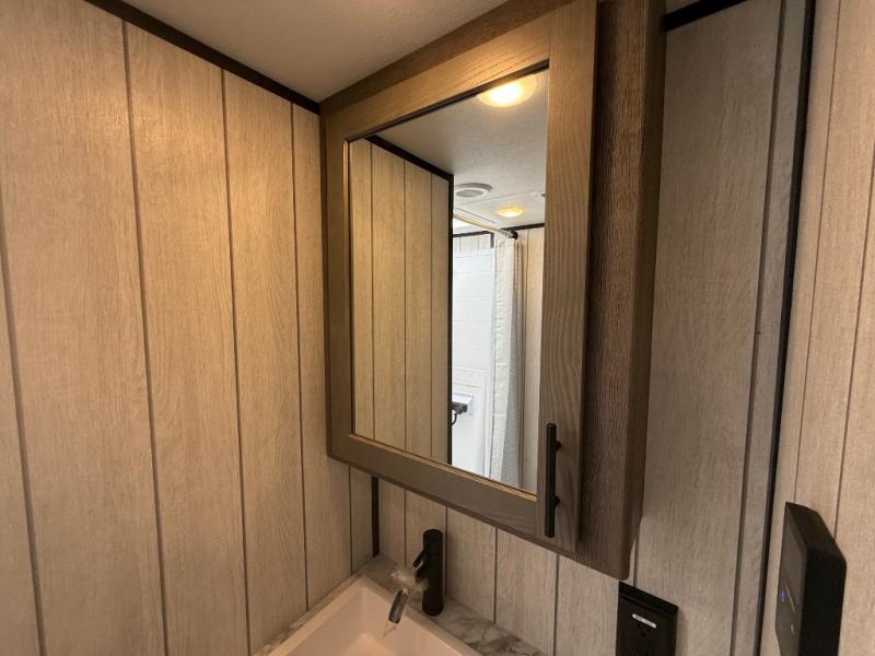 Fun at the campground begins with this toy hauler in tow! There is a 13' separate garage with a loft above for guests plus a patio deck to entertain guests. Your crew can get comfy on the theater seating across from the fireplace, and there is a hidden pantry behind to keep food stocked. The two flip-up countertops with stools provides a fun place to dine since there is a window between, or you can head outdoors to enjoy some fresh air under the two power awnings. A full bath lets you freshen up after a trail ride, and the front private bedroom gives you your own space at night. This unit also features washer and dryer prep in the bedroom so you can add those appliances if you wish!