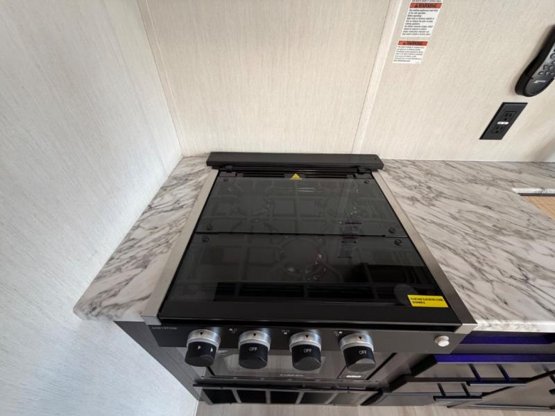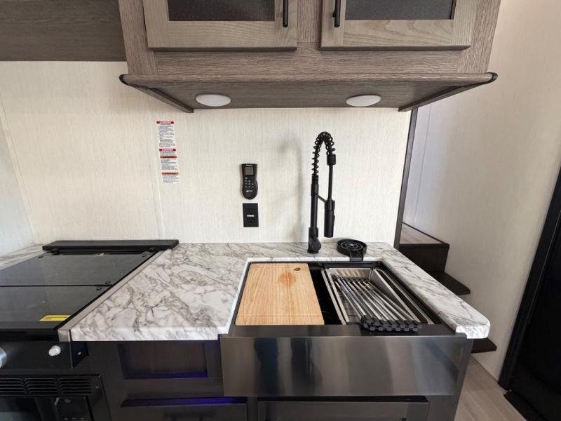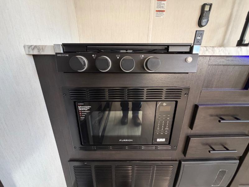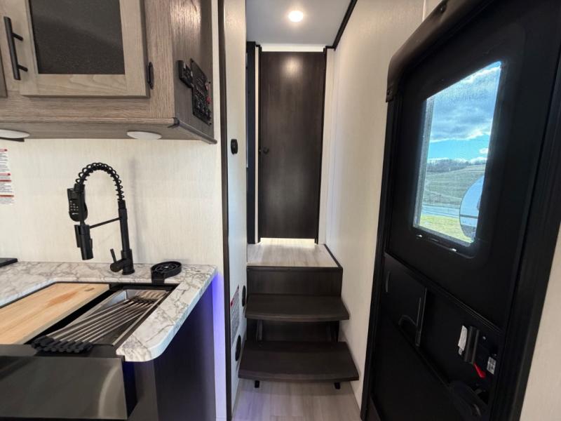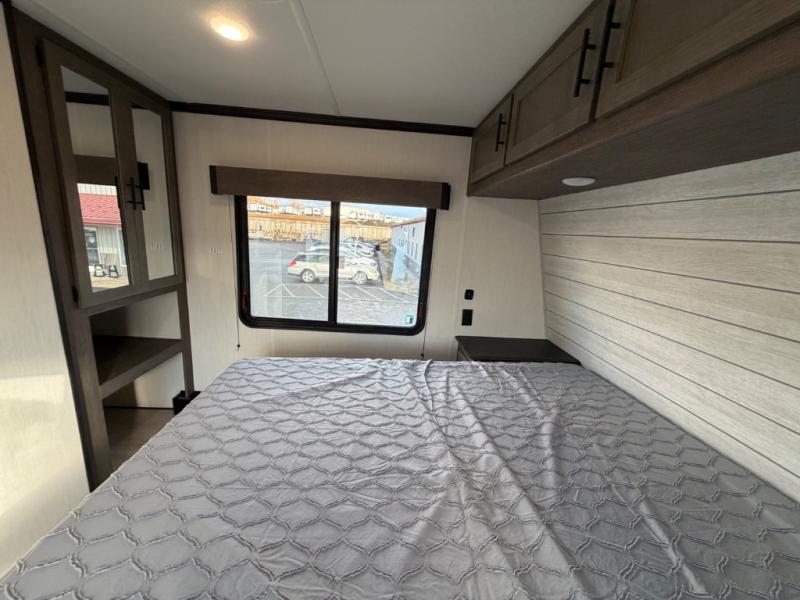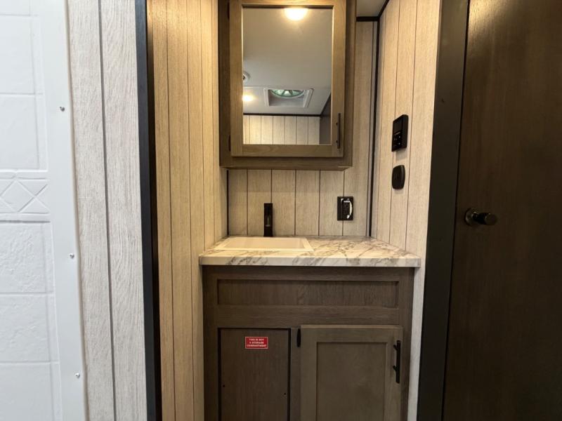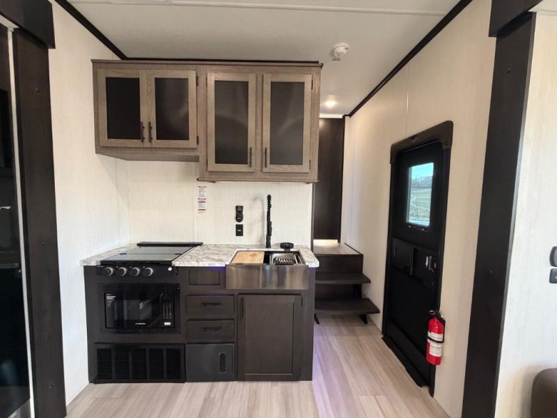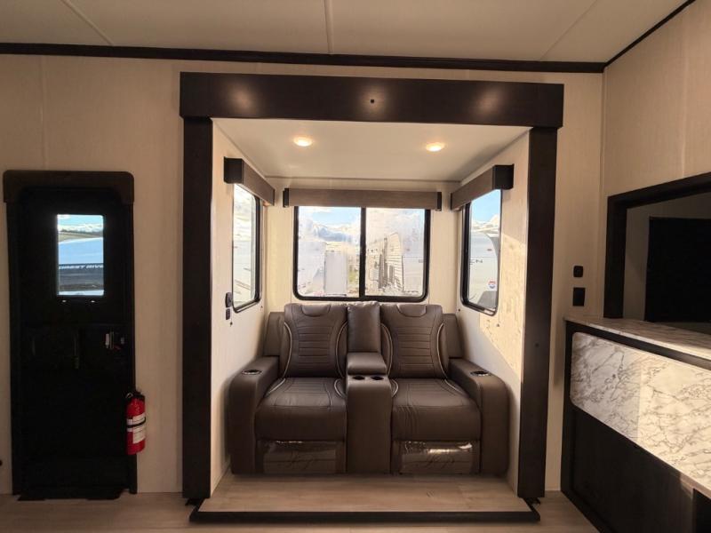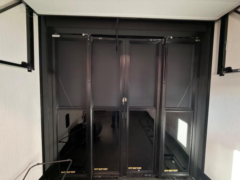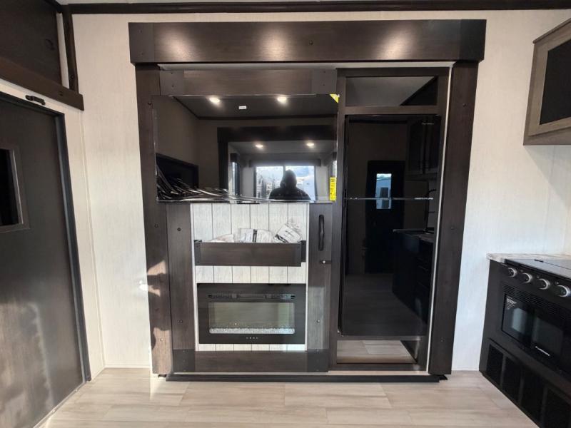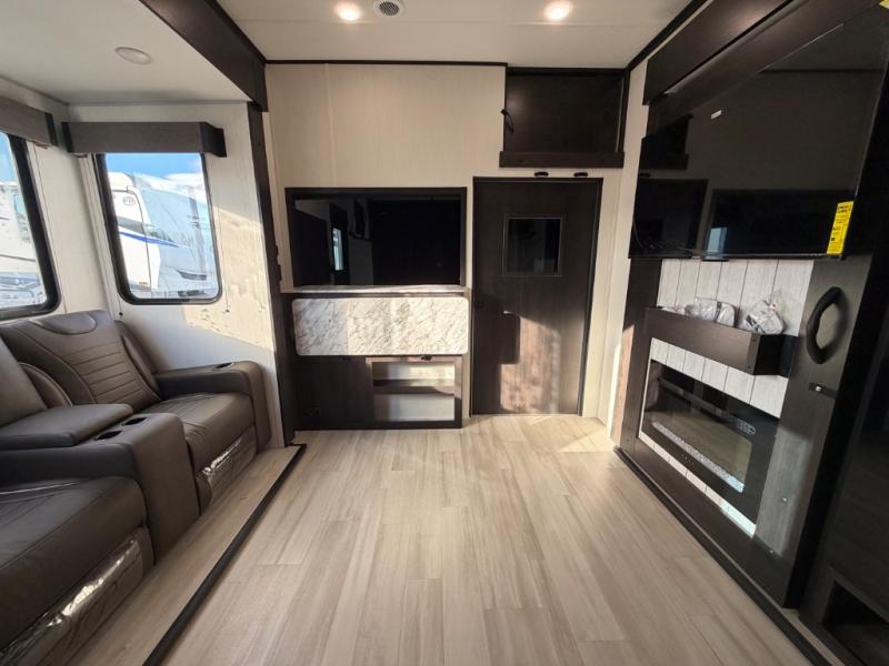Fun at the campground begins with this toy hauler in tow! There is a 13' separate garage with a loft above for guests plus a patio deck to entertain guests. You'll also find a quick set bed system for additional sleeping space. Your crew can get comfy on the theater seating across from the fireplace, and there is an XL hidden pantry behind to keep food stocked. The two flip-up countertops with stools provides a fun place to dine since there is a window between, or you can head outdoors to enjoy some fresh air under the two power awnings. A full bath lets you freshen up after a trail ride, and the front private bedroom gives you your own space at night. This unit also features washer and dryer prep in the bedroom so you can add those appliances if you wish!
