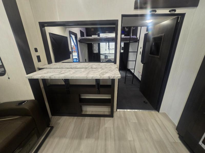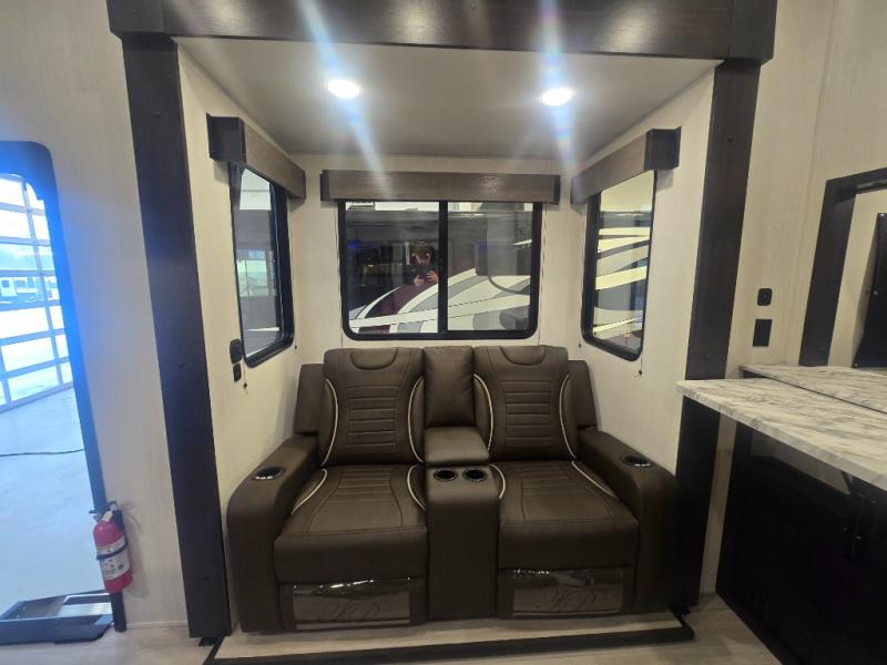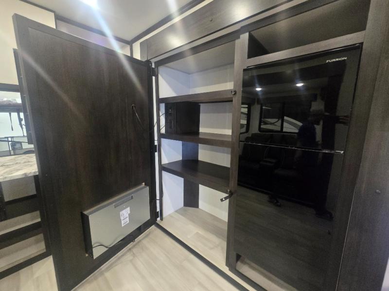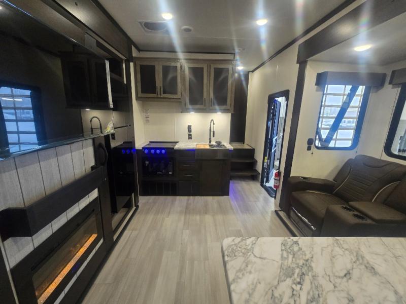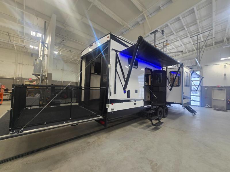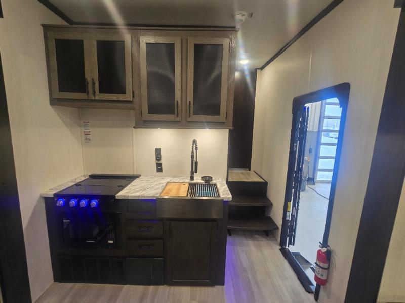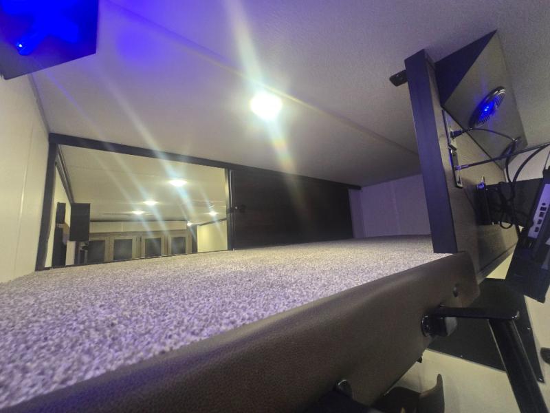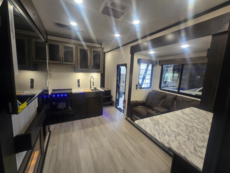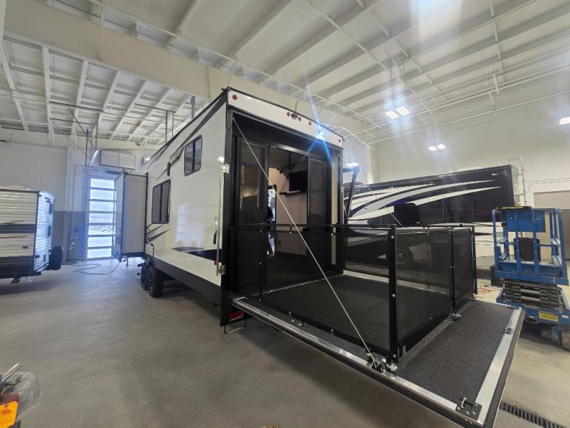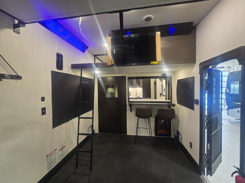 Fun at the campground begins with this toy hauler in tow! There is a 13' separate garage with a loft above for guests plus a patio deck to entertain guests. You'll also find a quick set bed system for additional sleeping space. Your crew can get comfy on the theater seating across from the fireplace, and there is an XL hidden pantry behind to keep food stocked. The two flip-up countertops with stools provides a fun place to dine since there is a window between, or you can head outdoors to enjoy some fresh air under the two power awnings. A full bath lets you freshen up after a trail ride, and the front private bedroom gives you your own space at night. This unit also features washer and dryer prep in the bedroom so you can add those appliances if you wish!