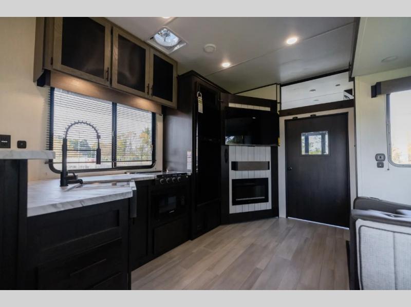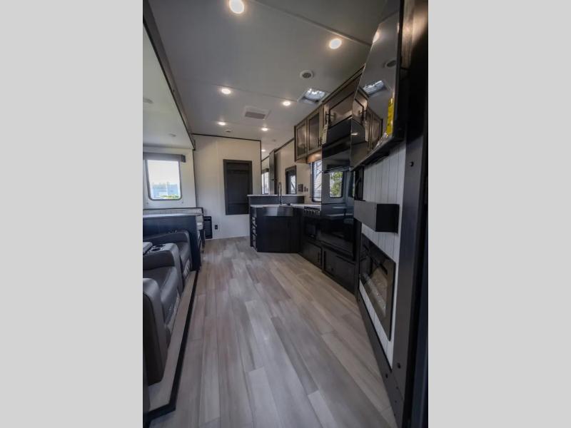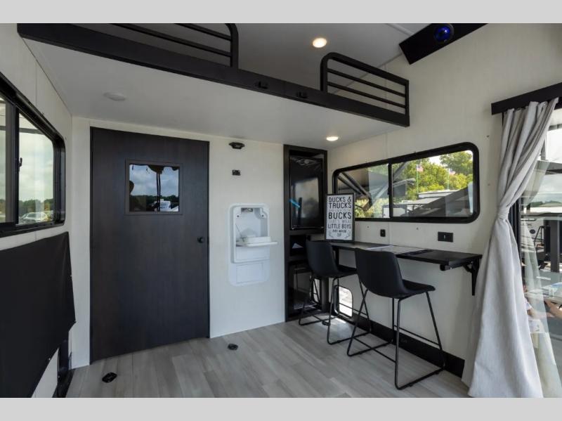 Fun at the campground begins with this dual entry toy hauler in tow! There is a 15' separate garage with glass patio doors, a loft above for guests, plus a patio deck to entertain guests. Your crew can get comfy on the theater seating or booth dinette, and there is an entertainment center with a fireplace and a hidden pantry for snacks. The chef of your group will love the full interior kitchen, along with an outdoor kitchen when the weather is nice. A full bath lets you freshen up after a trail ride, and the front private bedroom gives you your own space at night. This unit also features washer and dryer prep in the bedroom so you can add those appliances if you wish!