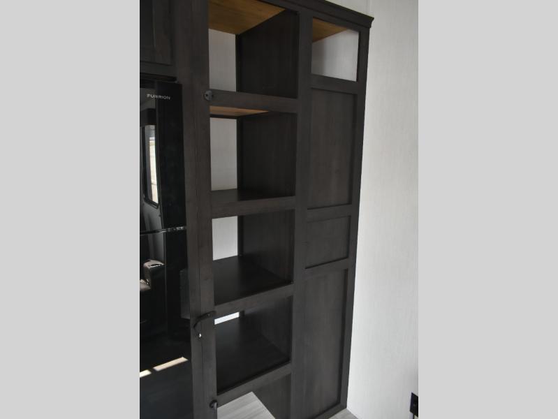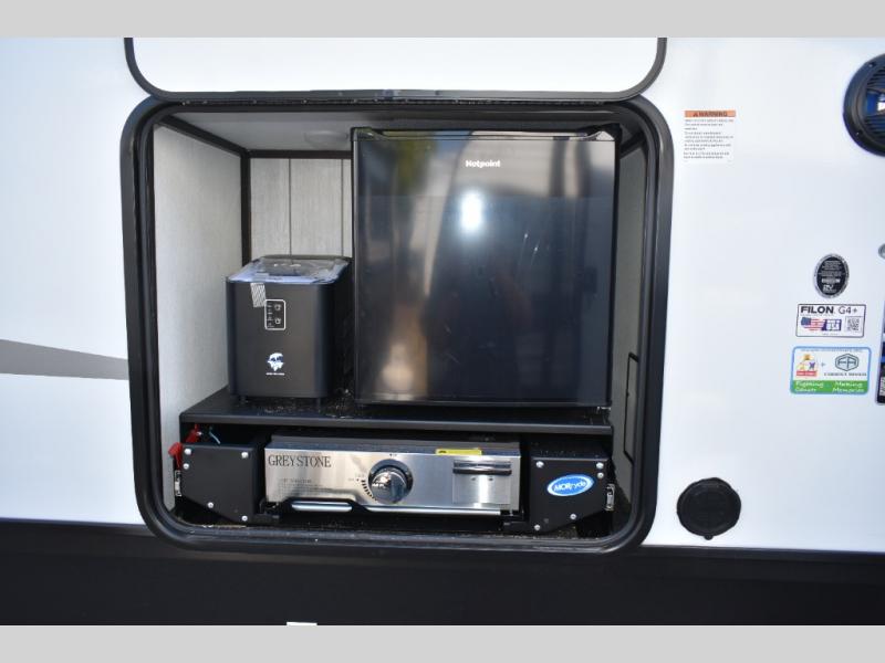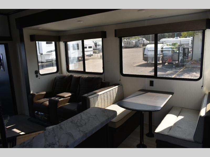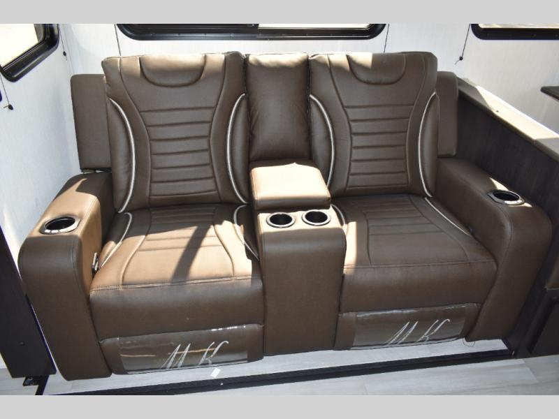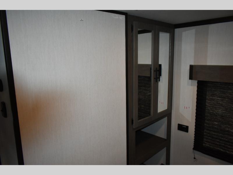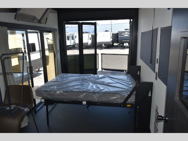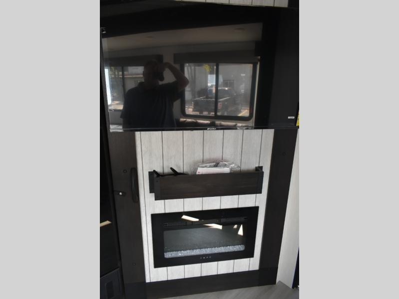 Fun at the campground begins with this dual entry toy hauler in tow! There is a 15' separate garage, a loft above for guests, plus a patio deck to entertain guests. There is also an optional Murphy bed system in the garage if you need additional sleeping space! Your crew can get comfy on the theater seating or booth dinette, and there is an entertainment center with a fireplace and a hidden XL pantry for snacks. The chef of your group will love the full interior kitchen, along with an outdoor mini kitchen when the weather is nice. A full bath lets you freshen up after a trail ride, and the front private bedroom gives you your own space at night. This unit also features washer and dryer prep in the bedroom so you can add those appliances if you wish!