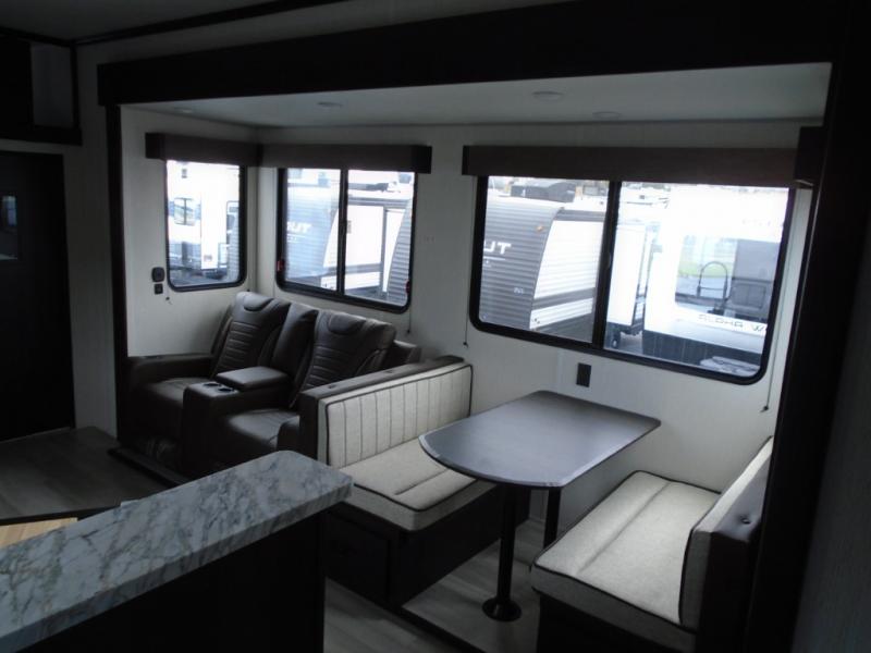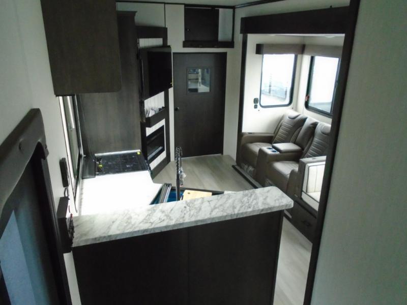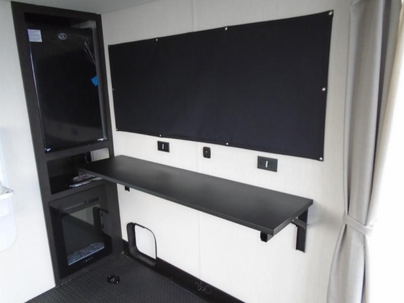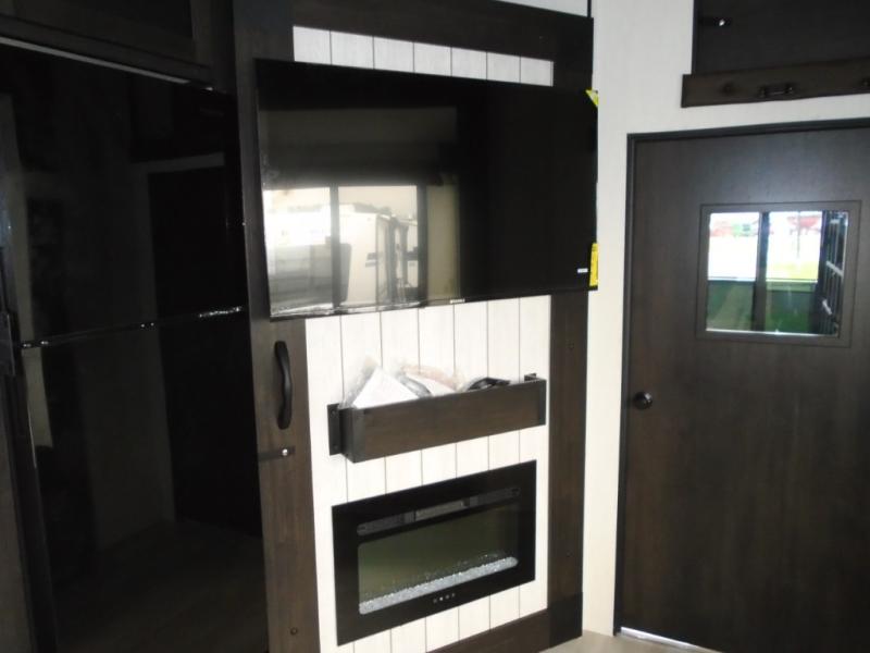 Fun at the campground begins with this dual entry toy hauler in tow! There is a 15' separate garage, a loft above for guests, plus a patio deck to entertain guests. There is also an optional Murphy bed system in the garage if you need additional sleeping space! Your crew can get comfy on the theater seating or booth dinette, and there is an entertainment center with a fireplace and a hidden XL pantry for snacks. The chef of your group will love the full interior kitchen, along with an outdoor mini kitchen when the weather is nice. A full bath lets you freshen up after a trail ride, and the front private bedroom gives you your own space at night. This unit also features washer and dryer prep in the bedroom so you can add those appliances if you wish!