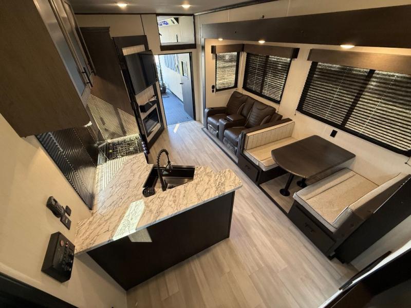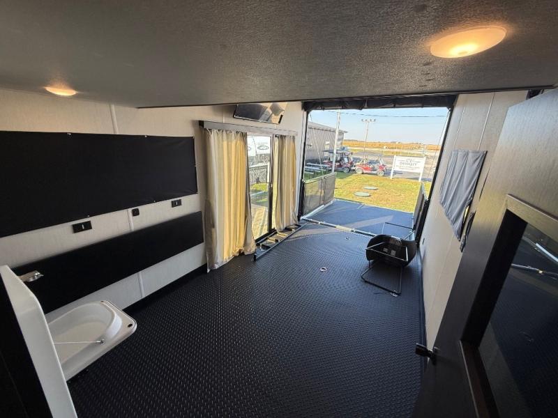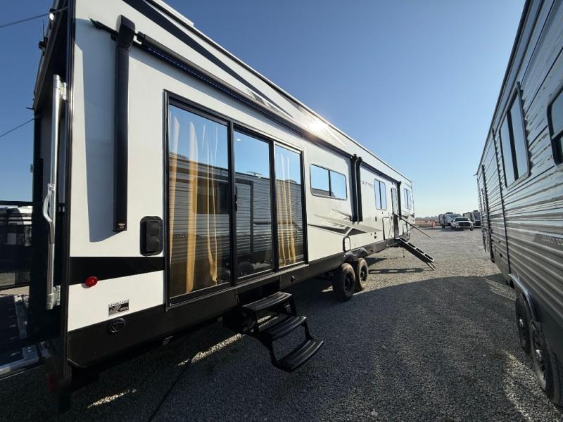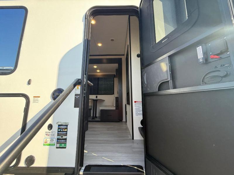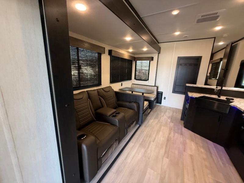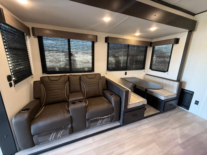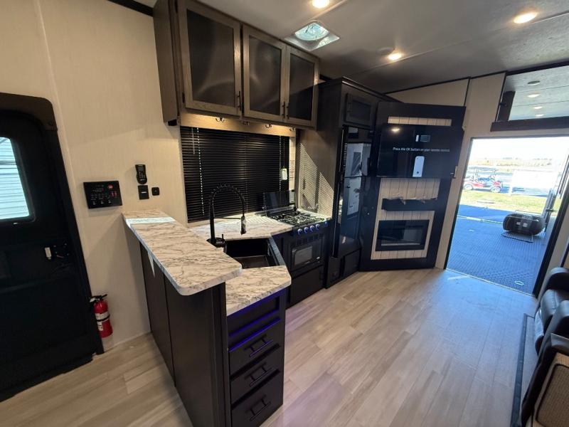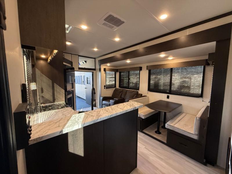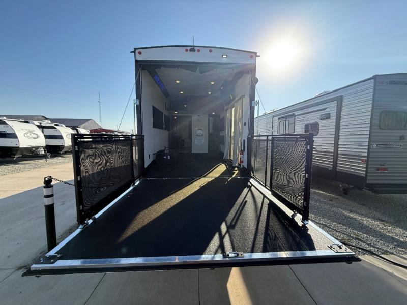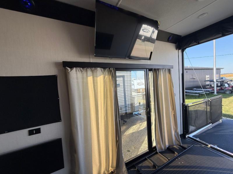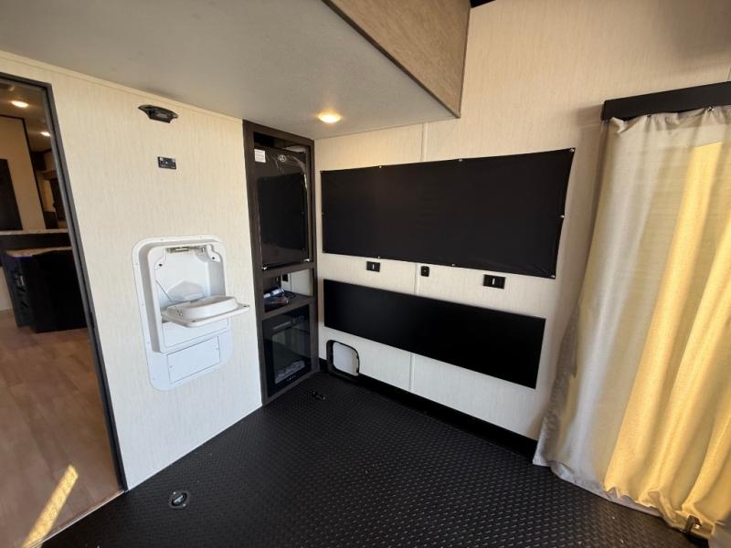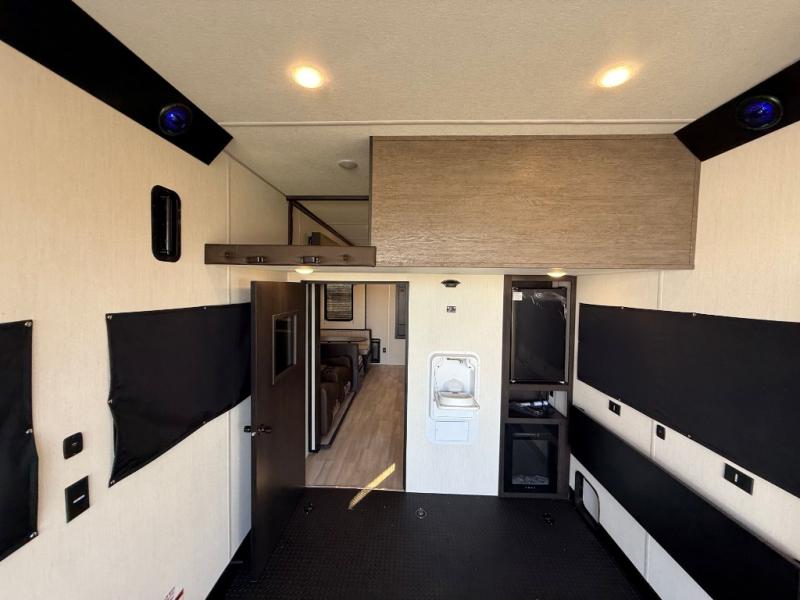 Fun at the campground begins with this dual entry toy hauler in tow! There is a 15' separate garage, a loft above for guests, plus a patio deck to entertain guests. There is also an optional Murphy bed system in the garage if you need additional sleeping space! Your crew can get comfy on the theater seating or booth dinette, and there is an entertainment center with a fireplace and a hidden XL pantry for snacks. The chef of your group will love the full interior kitchen, along with an outdoor mini kitchen when the weather is nice. A full bath lets you freshen up after a trail ride, and the front private bedroom gives you your own space at night. This unit also features washer and dryer prep in the bedroom so you can add those appliances if you wish!
