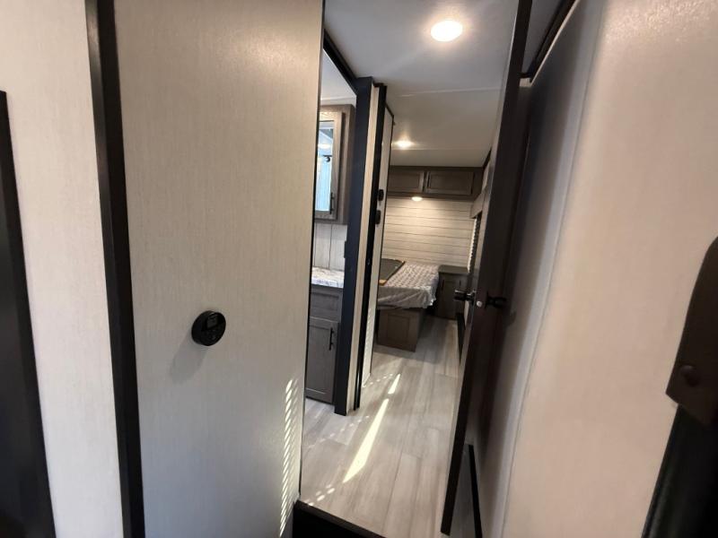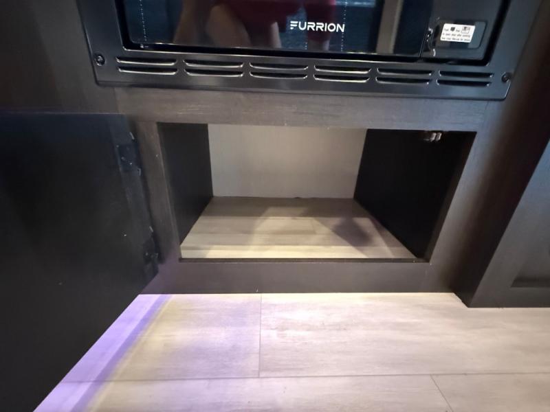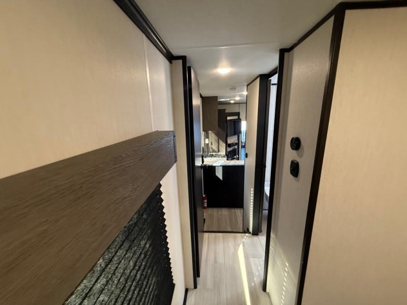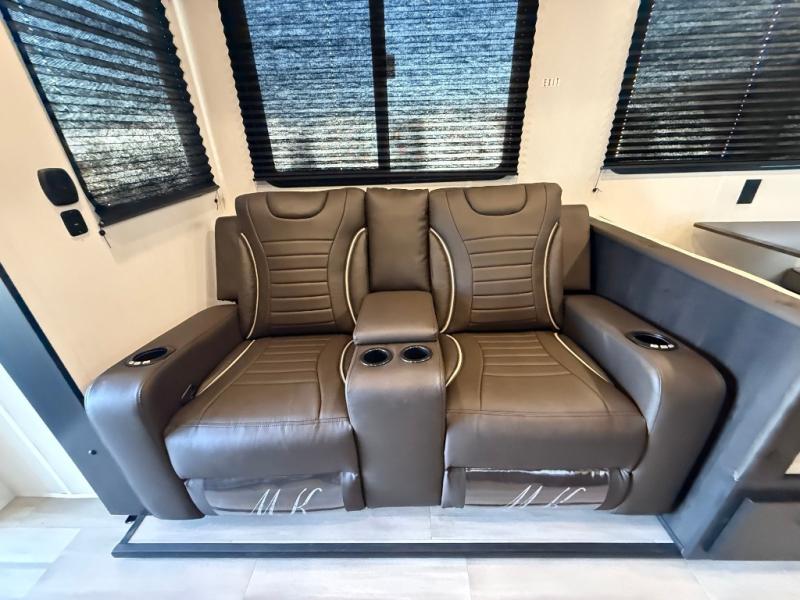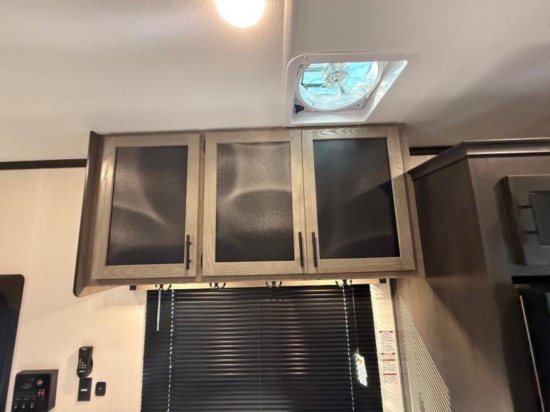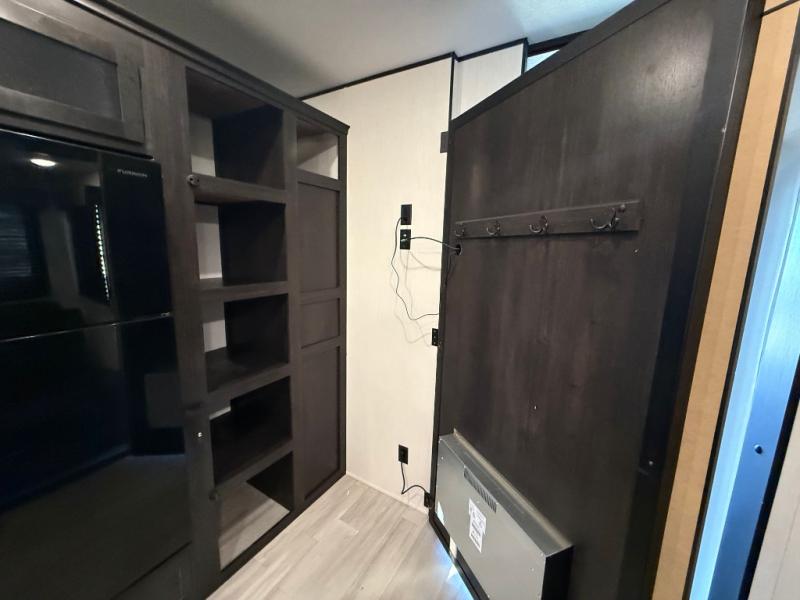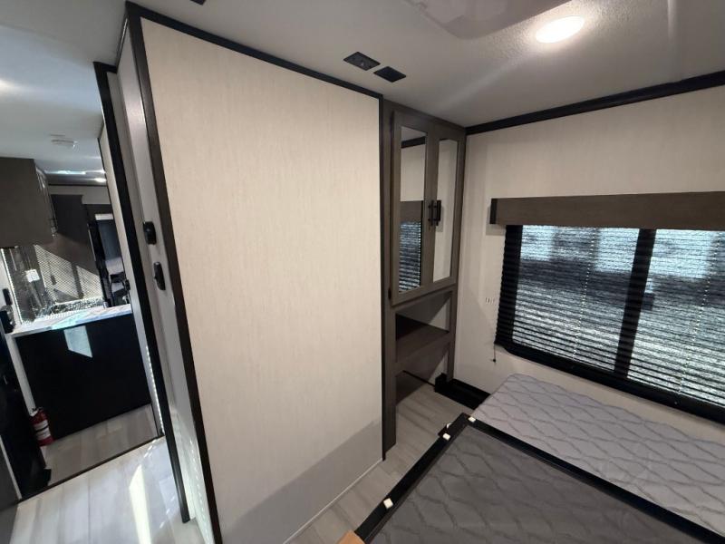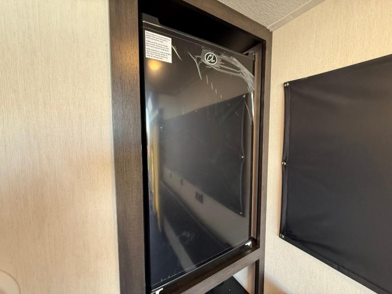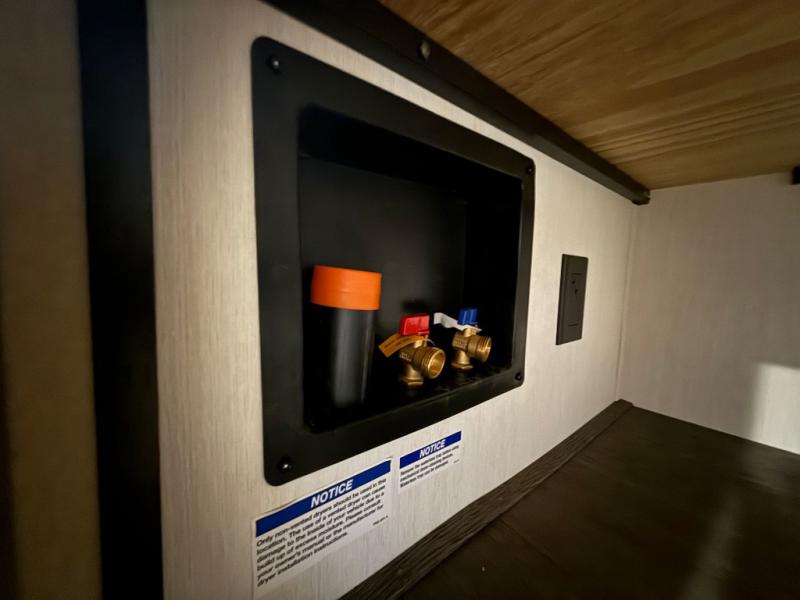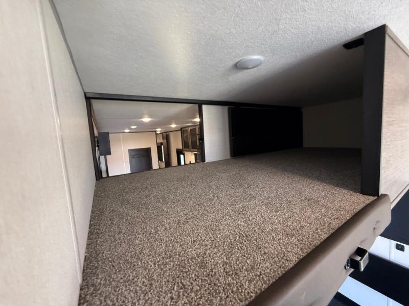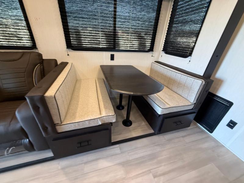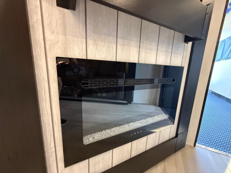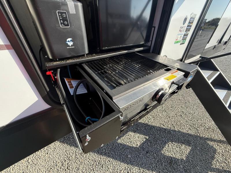 Fun at the campground begins with this dual entry toy hauler in tow! There is a 15' separate garage, a loft above for guests, plus a patio deck to entertain guests. There is also an optional Murphy bed system in the garage if you need additional sleeping space! Your crew can get comfy on the theater seating or booth dinette, and there is an entertainment center with a fireplace and a hidden XL pantry for snacks. The chef of your group will love the full interior kitchen, along with an outdoor mini kitchen when the weather is nice. A full bath lets you freshen up after a trail ride, and the front private bedroom gives you your own space at night. This unit also features washer and dryer prep in the bedroom so you can add those appliances if you wish!