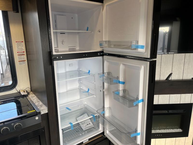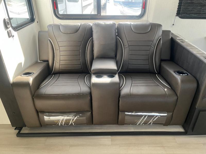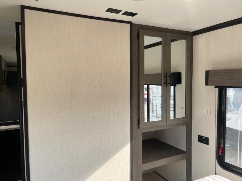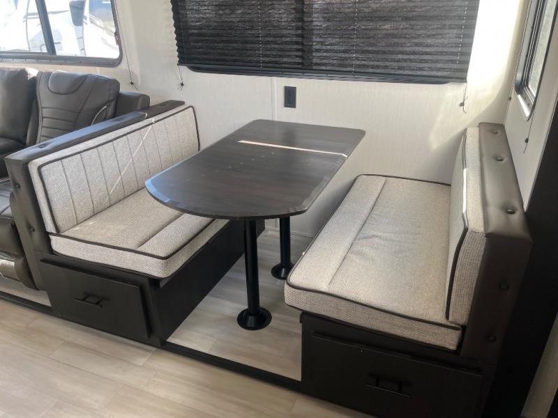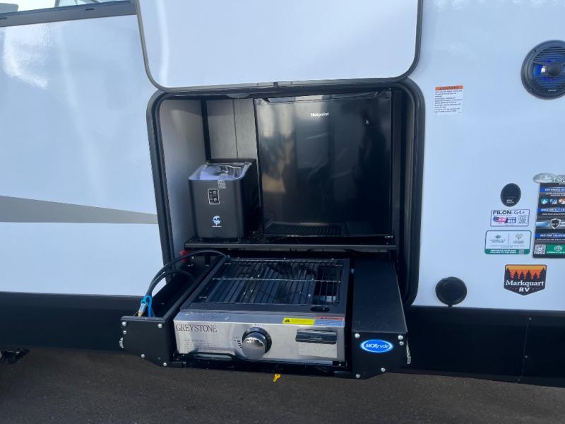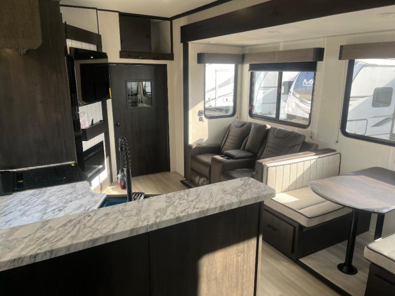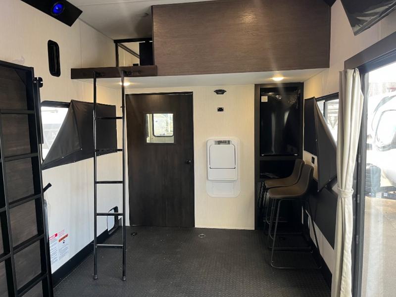 Fun at the campground begins with this dual entry toy hauler in tow! There is a 15' separate garage, a loft above for guests, plus a patio deck to entertain guests. There is also an optional Murphy bed system in the garage if you need additional sleeping space! Your crew can get comfy on the theater seating or booth dinette, and there is an entertainment center with a fireplace and a hidden XL pantry for snacks. The chef of your group will love the full interior kitchen, along with an outdoor mini kitchen when the weather is nice. A full bath lets you freshen up after a trail ride, and the front private bedroom gives you your own space at night. This unit also features washer and dryer prep in the bedroom so you can add those appliances if you wish!