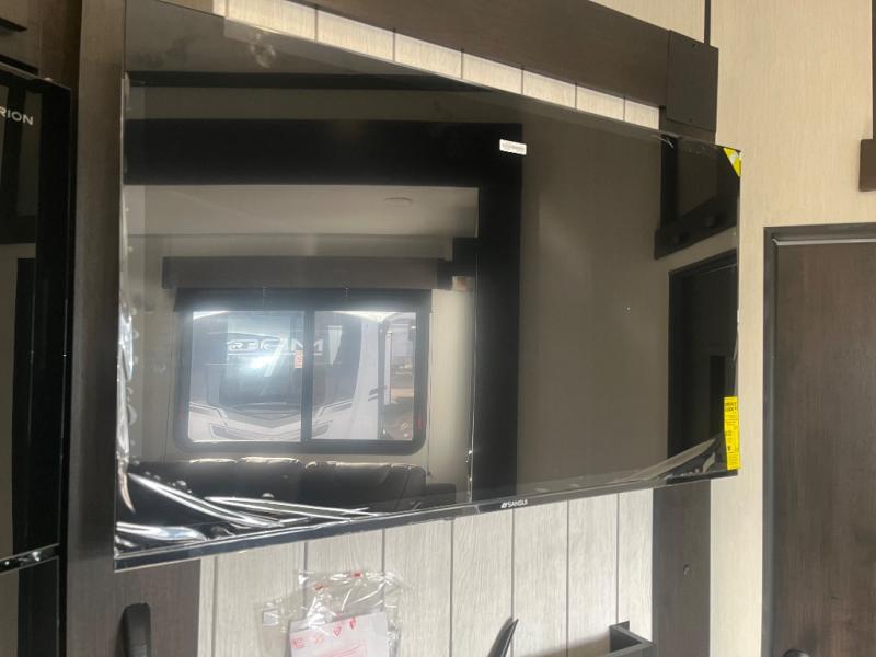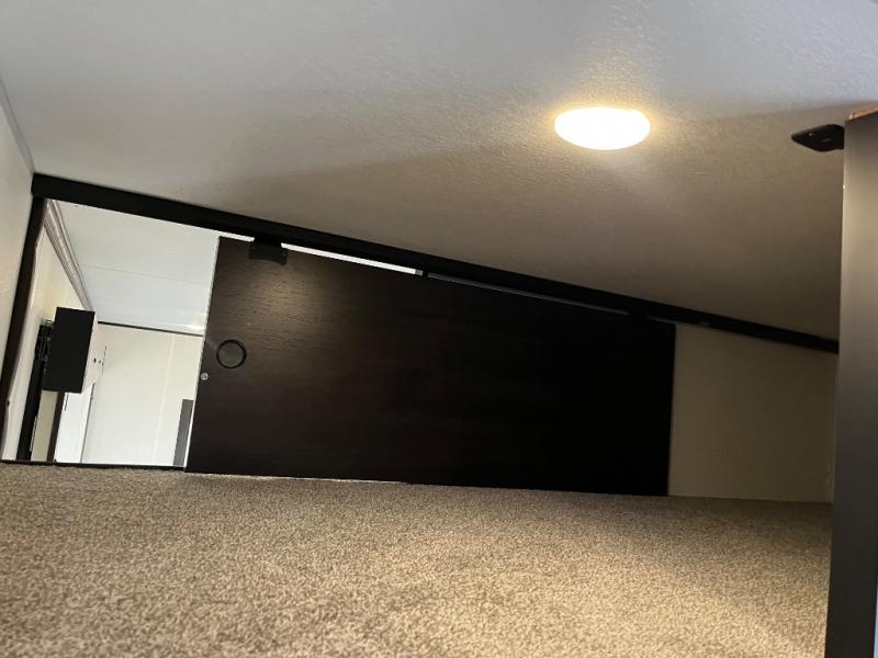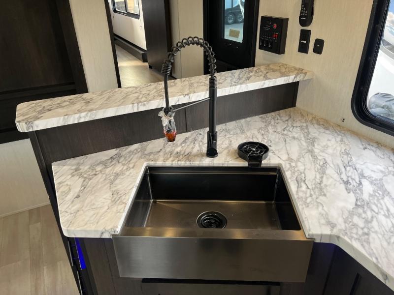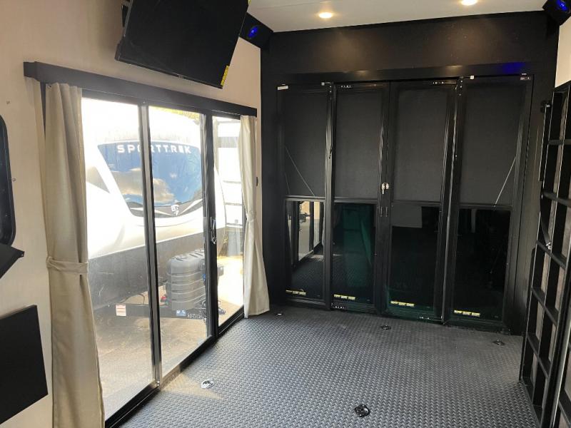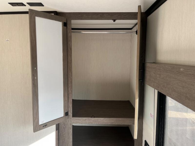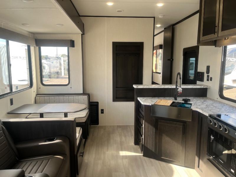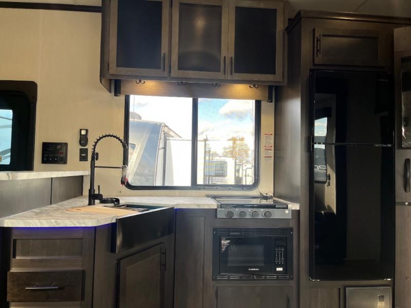 Fun at the campground begins with this dual entry toy hauler in tow! There is a 15' separate garage, a loft above for guests, plus a patio deck to entertain guests. There is also an optional Murphy bed system in the garage if you need additional sleeping space! Your crew can get comfy on the theater seating or booth dinette, and there is an entertainment center with a fireplace and a hidden XL pantry for snacks. The chef of your group will love the full interior kitchen, along with an outdoor mini kitchen when the weather is nice. A full bath lets you freshen up after a trail ride, and the front private bedroom gives you your own space at night. This unit also features washer and dryer prep in the bedroom so you can add those appliances if you wish!