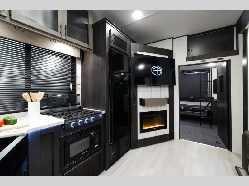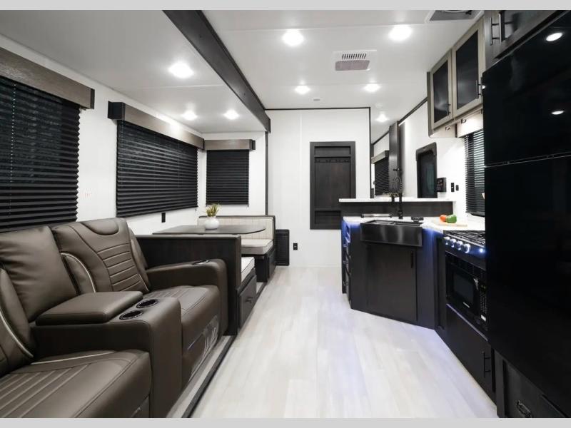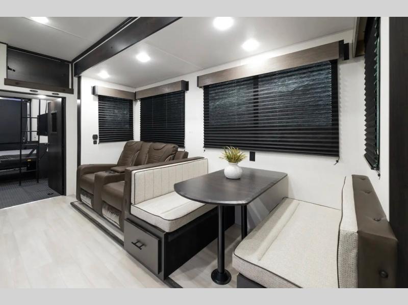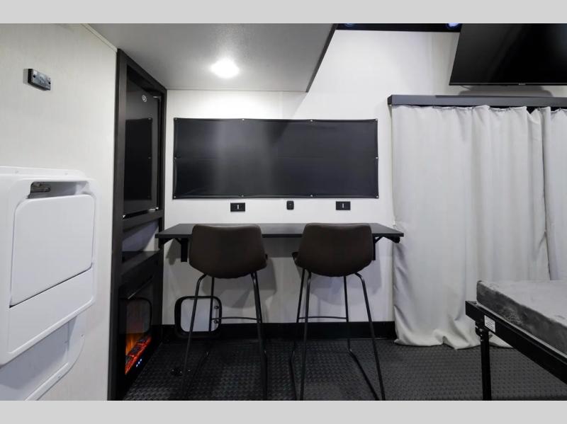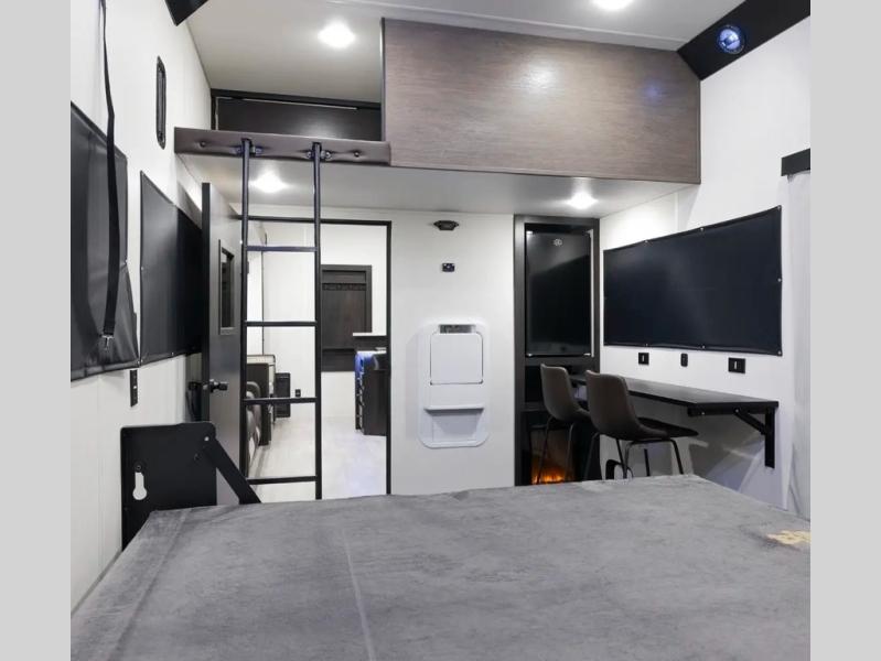 Fun at the campground begins with this dual entry toy hauler in tow! There is a 15' separate garage, a loft above for guests, plus a patio deck to entertain guests. There is also an optional Murphy bed system in the garage if you need additional sleeping space! Your crew can get comfy on the theater seating or booth dinette, and there is an entertainment center with a fireplace and a hidden XL pantry for snacks. The chef of your group will love the full interior kitchen, along with an outdoor mini kitchen when the weather is nice. A full bath lets you freshen up after a trail ride, and the front private bedroom gives you your own space at night. This unit also features washer and dryer prep in the bedroom so you can add those appliances if you wish!
