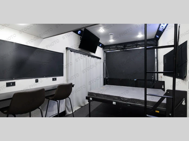 Fun at the campground begins with this dual entry toy hauler in tow! There is a 15' separate garage, a loft above for guests, plus a patio deck to entertain guests. There is also an optional Murphy bed system in the garage if you need additional sleeping space! Your crew can get comfy on the theater seating or booth dinette, and there is an entertainment center with a fireplace and a hidden XL pantry for snacks. The chef of your group will love the full interior kitchen, along with an outdoor mini kitchen when the weather is nice. A full bath lets you freshen up after a trail ride, and the front private bedroom gives you your own space at night. This unit also features washer and dryer prep in the bedroom so you can add those appliances if you wish!