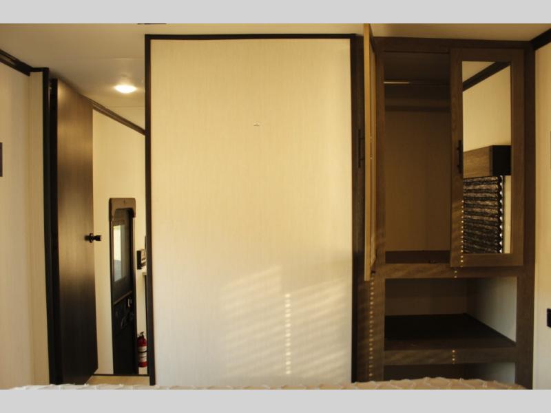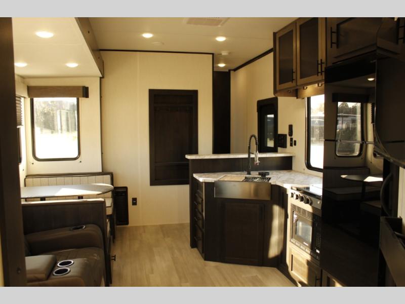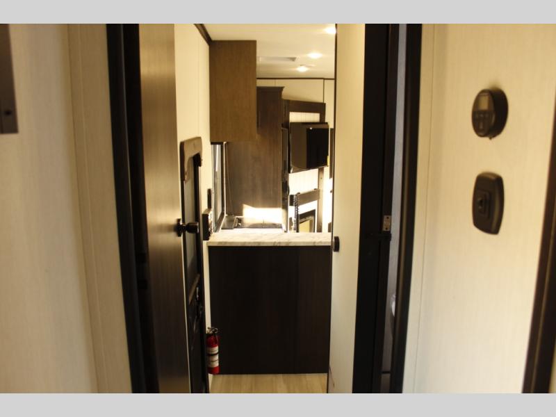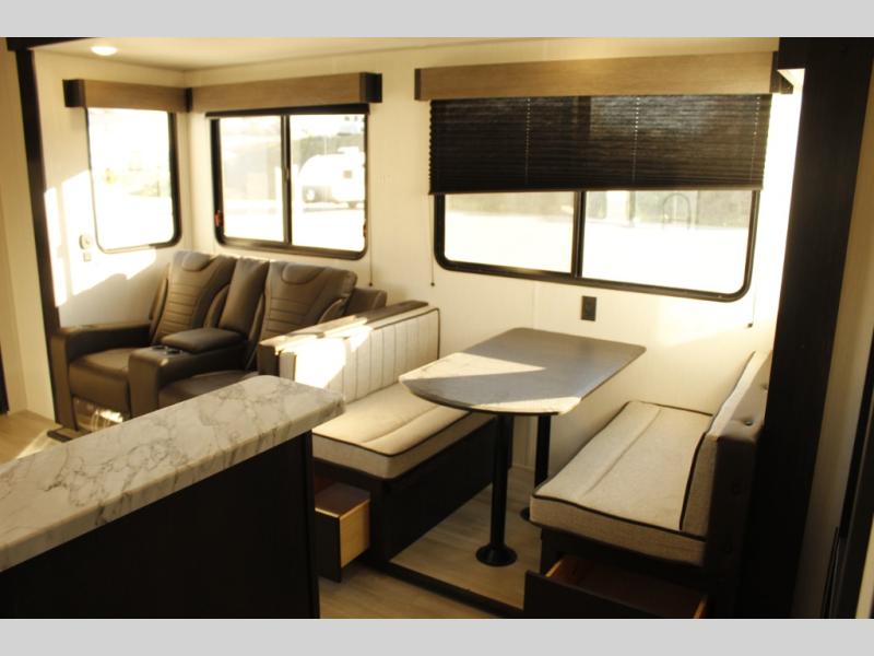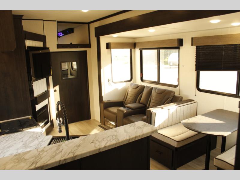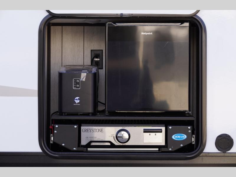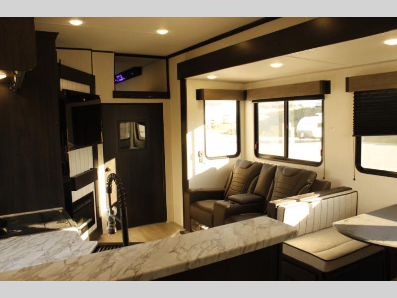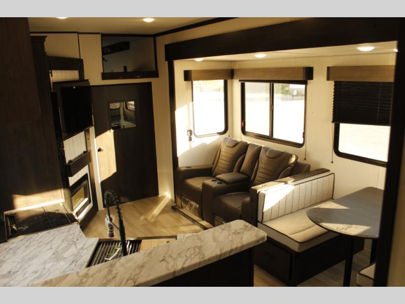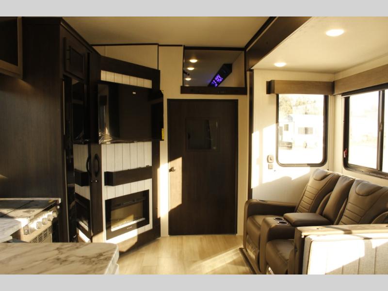 Fun at the campground begins with this dual entry toy hauler in tow! There is a 15' separate garage, a loft above for guests, plus a patio deck to entertain guests. There is also an optional Murphy bed system in the garage if you need additional sleeping space! Your crew can get comfy on the theater seating or booth dinette, and there is an entertainment center with a fireplace and a hidden XL pantry for snacks. The chef of your group will love the full interior kitchen, along with an outdoor mini kitchen when the weather is nice. A full bath lets you freshen up after a trail ride, and the front private bedroom gives you your own space at night. This unit also features washer and dryer prep in the bedroom so you can add those appliances if you wish!