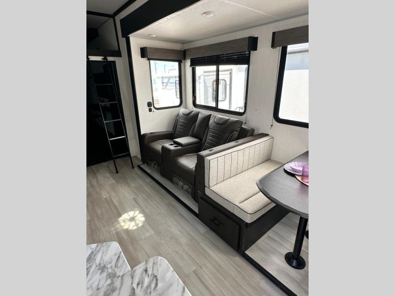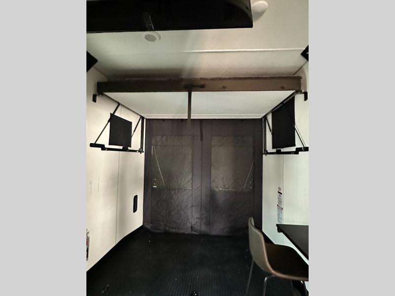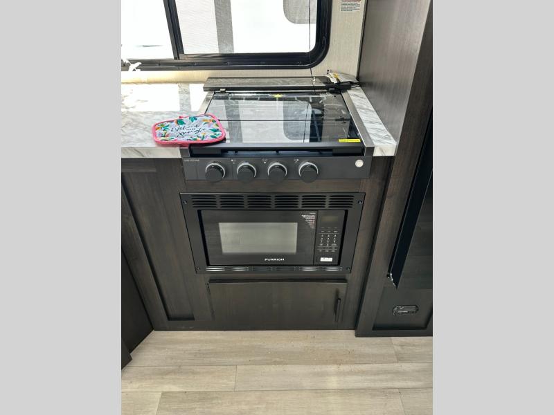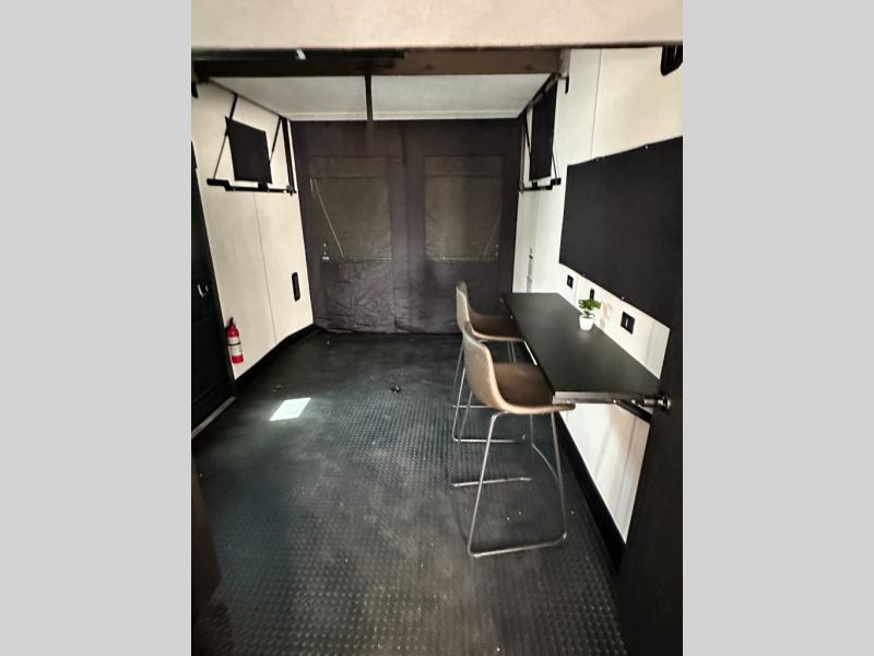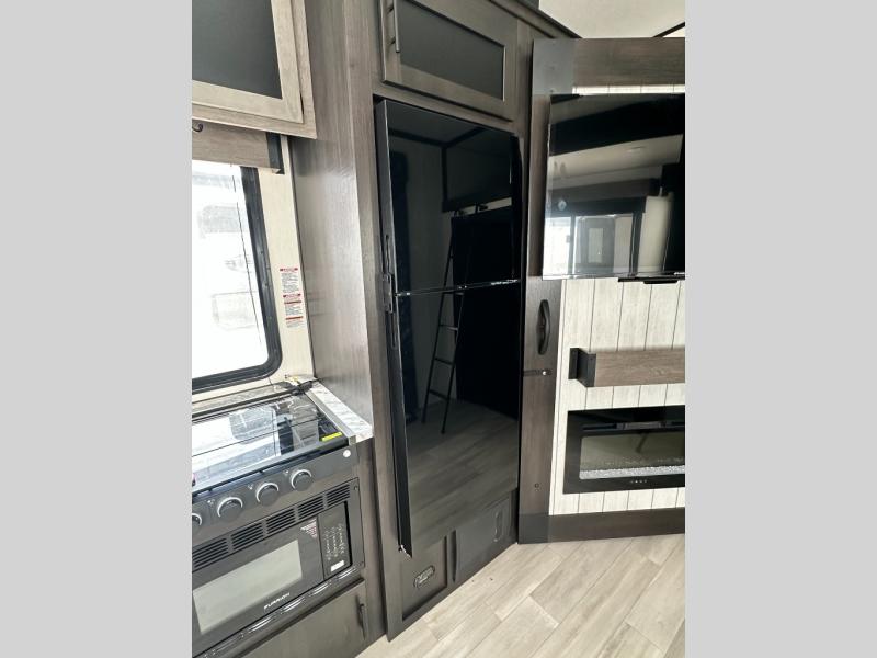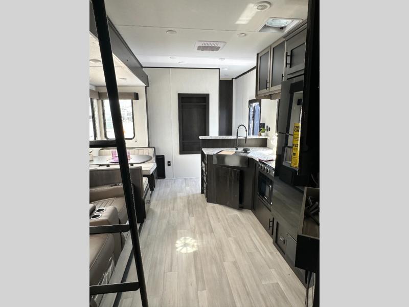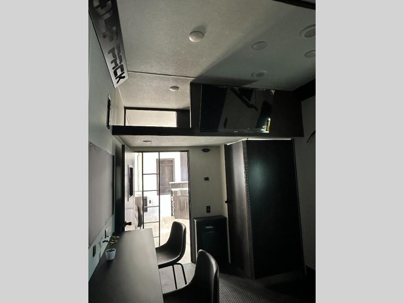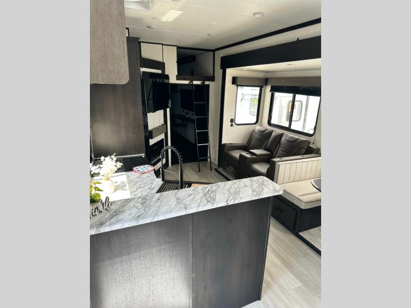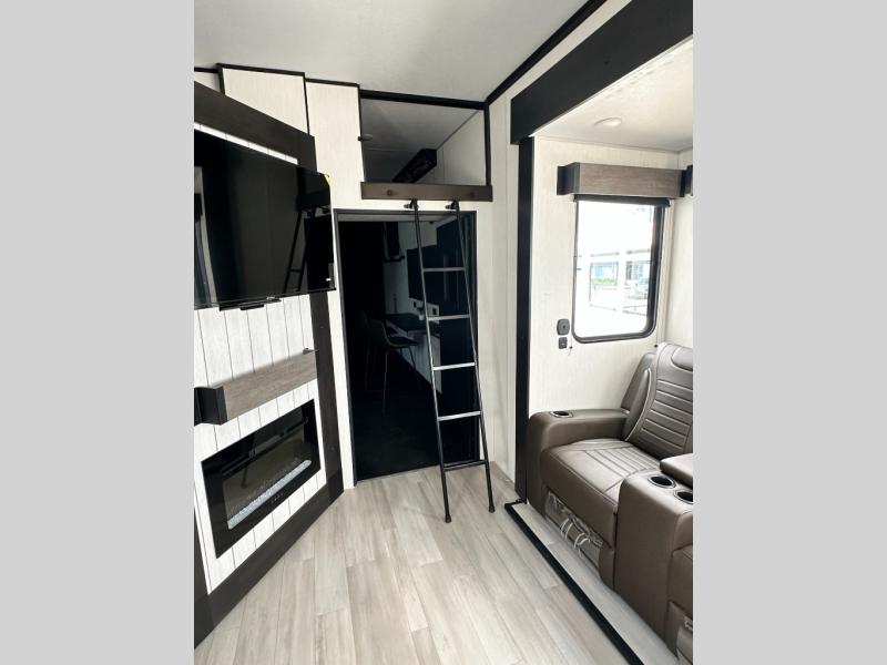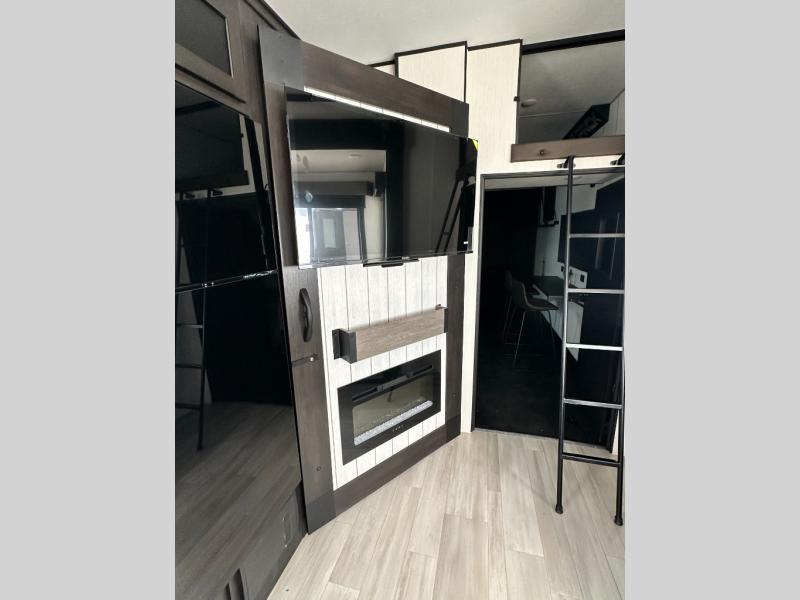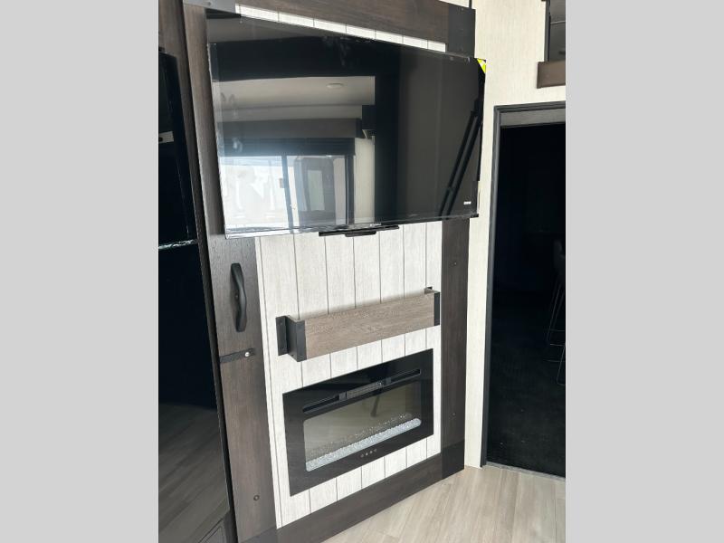 This toy hauler has everything you and your partner need to have a fantastic experience on the road! Unwind in the front bedroom, fitted with a large king bed, overhead cabinets, and wardrobes on each side of the bed, perfect for keeping all your clothes organized. A full bathroom is at your disposal boasting a washer and dryer prep ideal for keeping your best outfits nice and clean. In the kitchen area, you will find a 12V refrigerator, overhead cabinets, a pantry, a microwave, a TV with a fireplace, and a flip-up top within stools, best for having breakfast each morning. This unit also boast a half bathroom adding convenience to the piece.