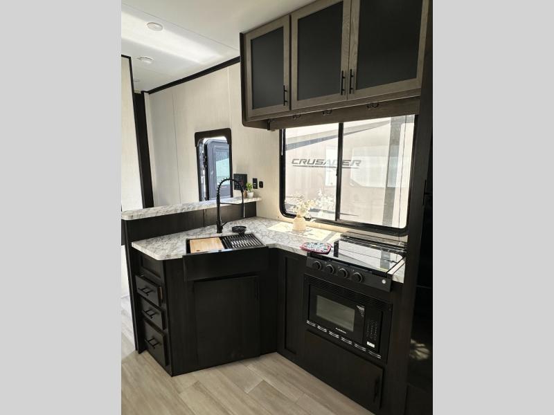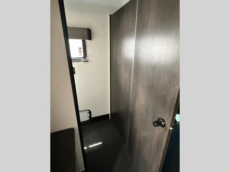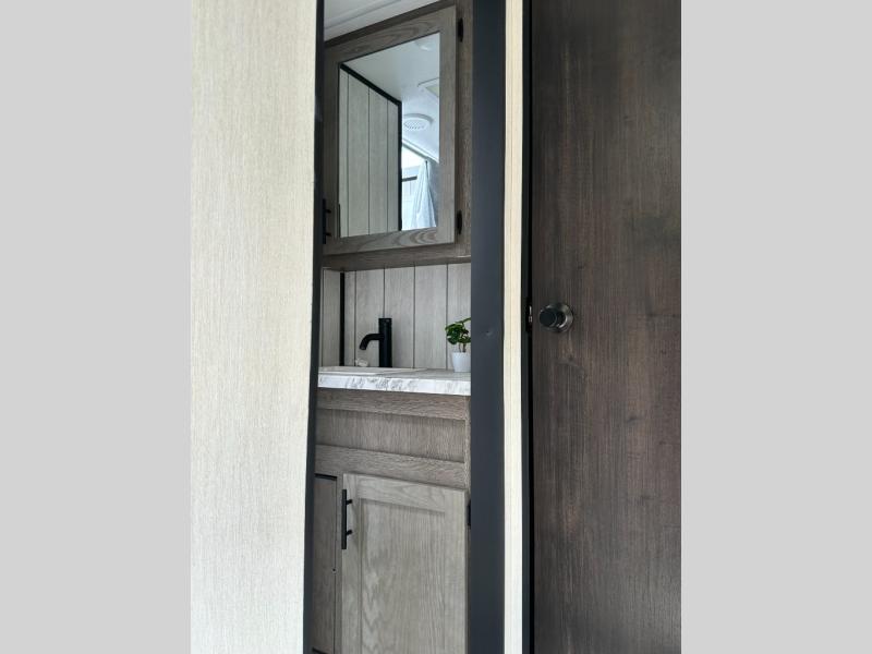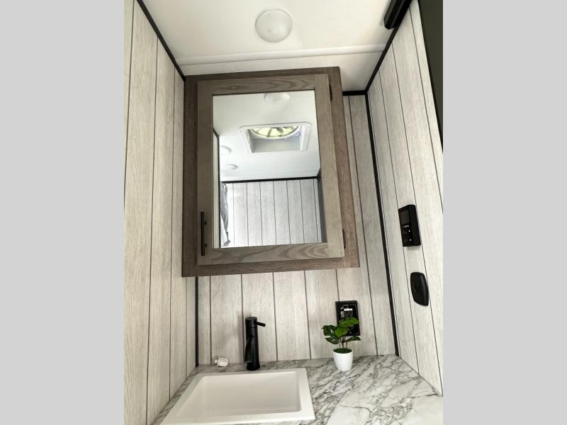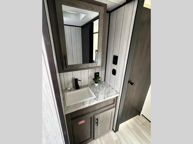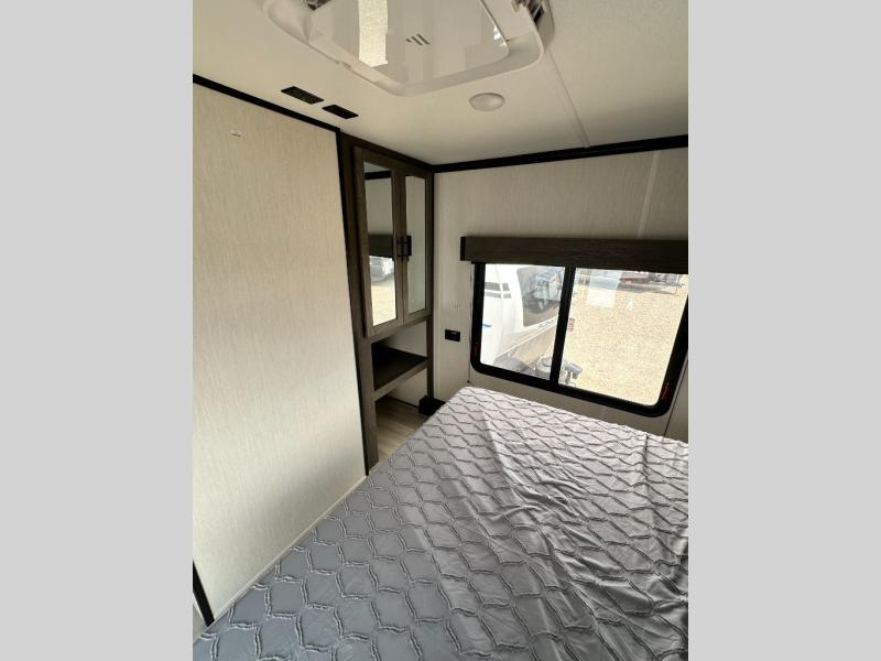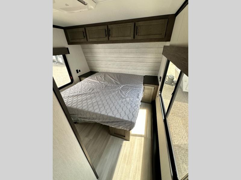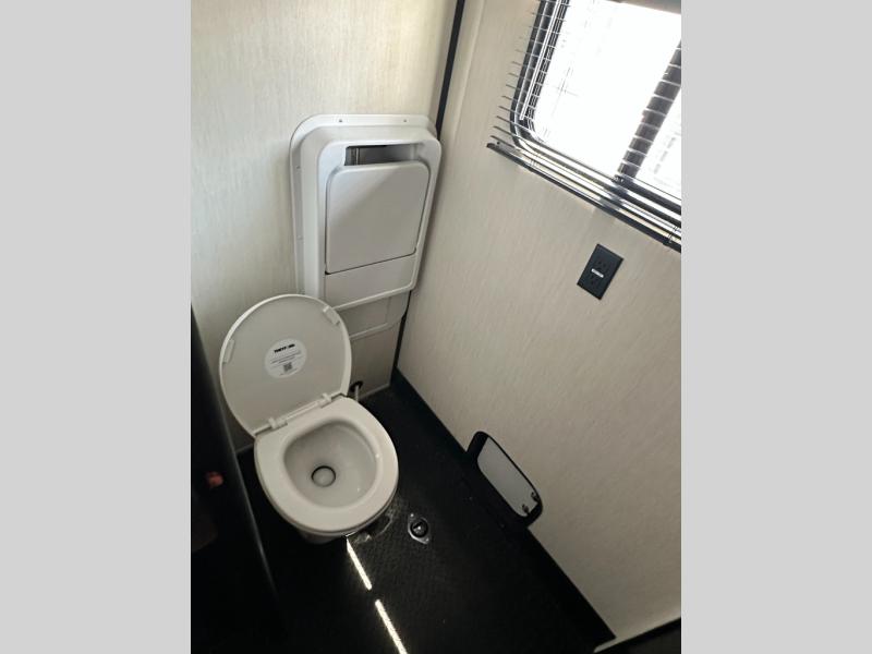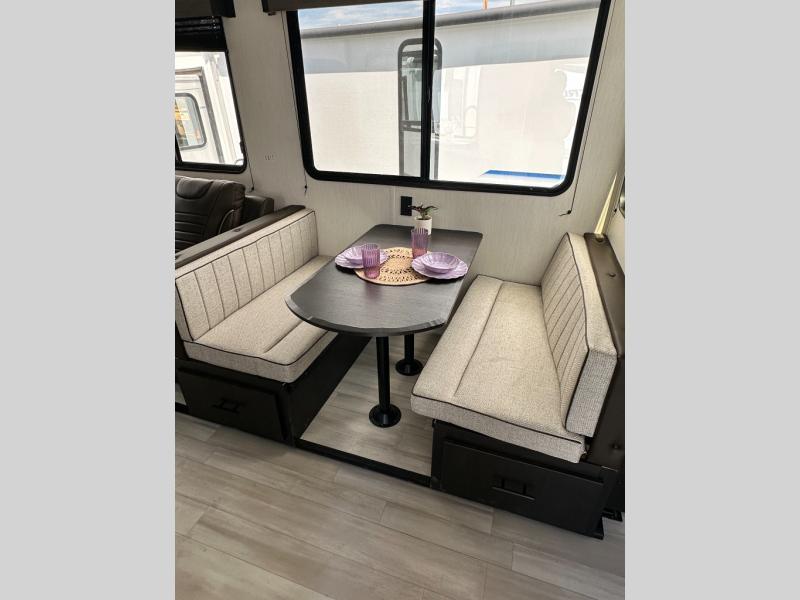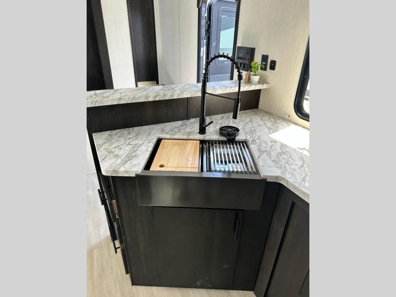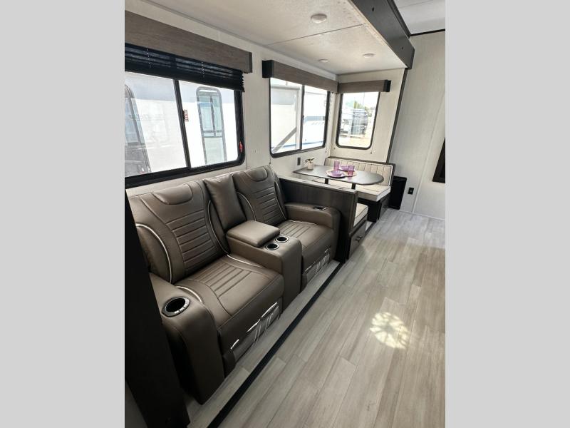 This toy hauler has everything you and your partner need to have a fantastic experience on the road! Unwind in the front bedroom, fitted with a large king bed, overhead cabinets, and wardrobes on each side of the bed, perfect for keeping all your clothes organized. A full bathroom is at your disposal boasting a washer and dryer prep ideal for keeping your best outfits nice and clean. In the kitchen area, you will find a 12V refrigerator, overhead cabinets, a pantry, a microwave, a TV with a fireplace, and a flip-up top within stools, best for having breakfast each morning. This unit also boast a half bathroom adding convenience to the piece.