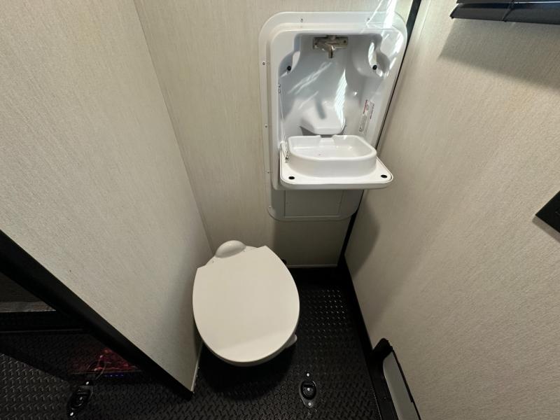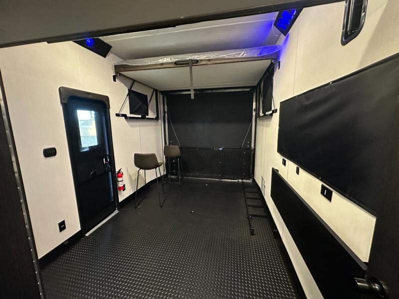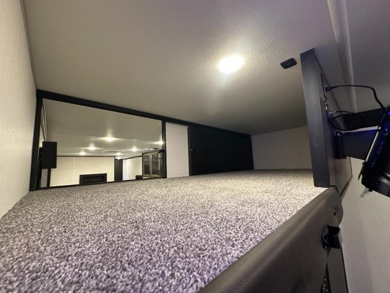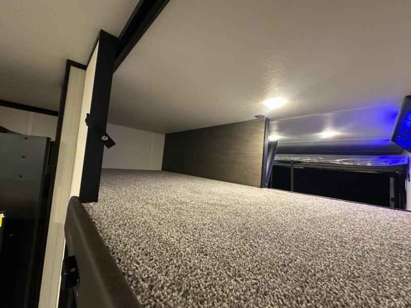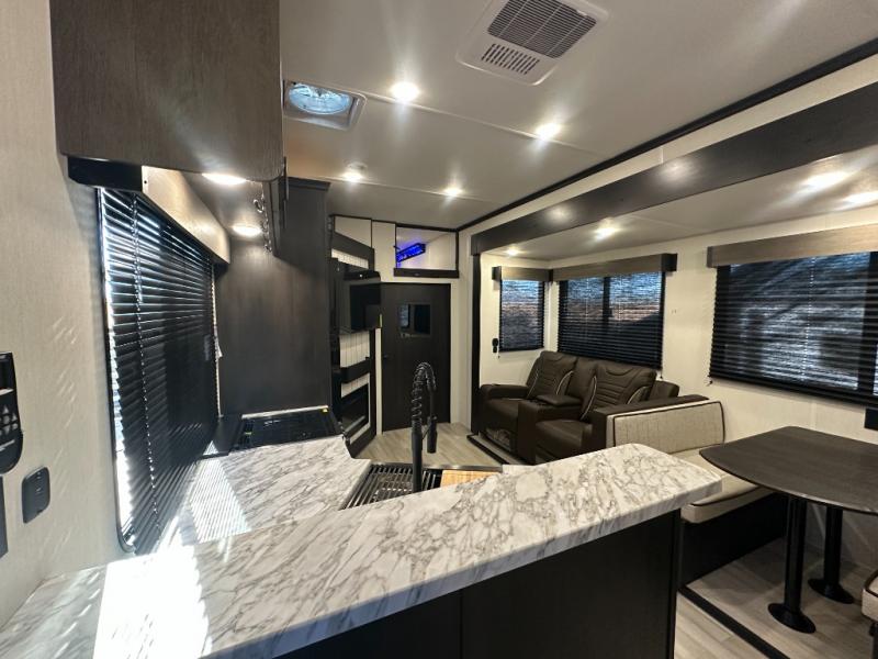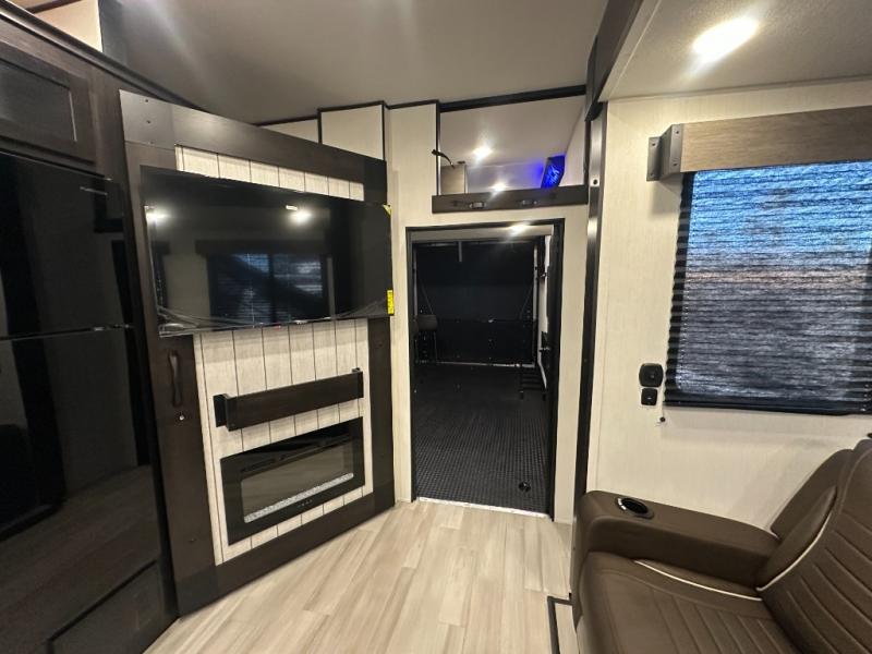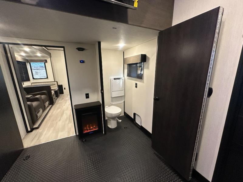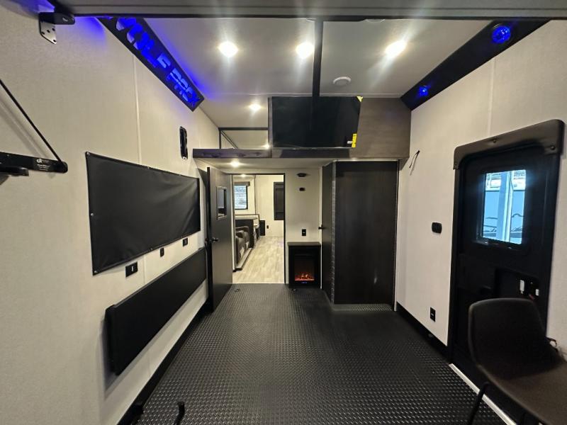 This toy hauler has everything you and your partner need to have a fantastic experience on the road! Unwind in the front bedroom, fitted with a large RV king bed, overhead cabinets, and nightstands on each side of the bed, perfect for keeping all your clothes organized. In the kitchen area, you will find a 12V refrigerator, overhead cabinets, an XL pantry, a microwave, and a TV with a fireplace. Your guests can turn the garage into their bedroom at night since there is a quick set bed system above, a loft/storage, a flip-up top with stools, plus a half bath with folding walls and a flip-down recessed sink!