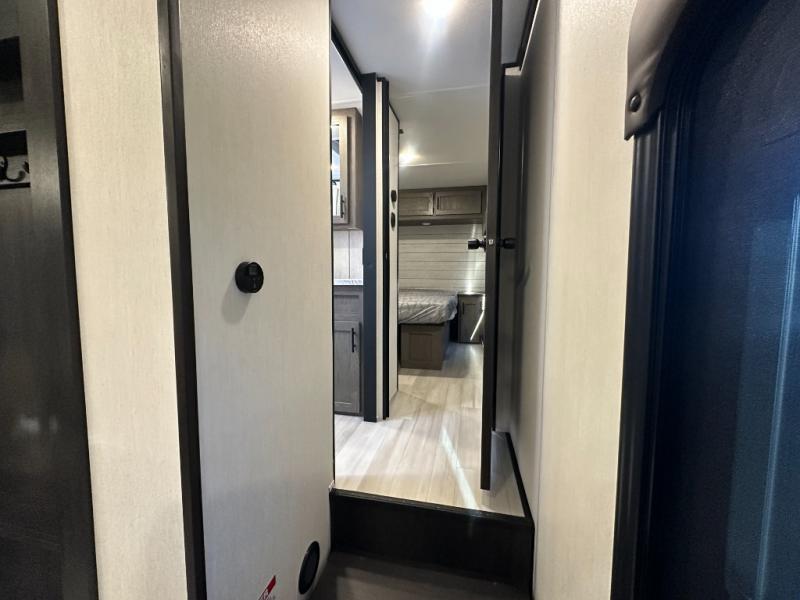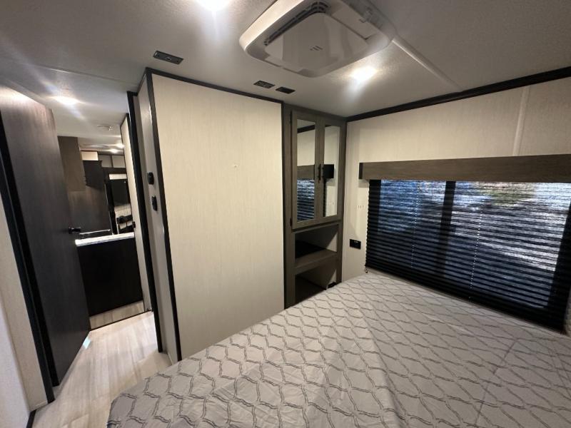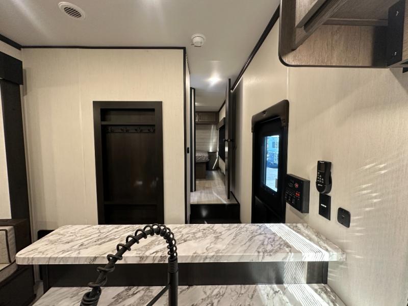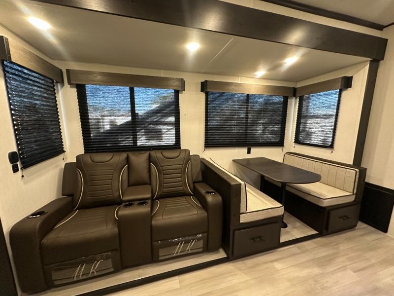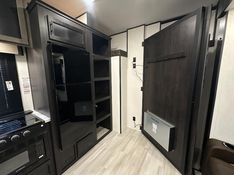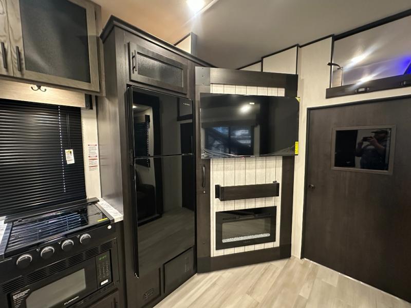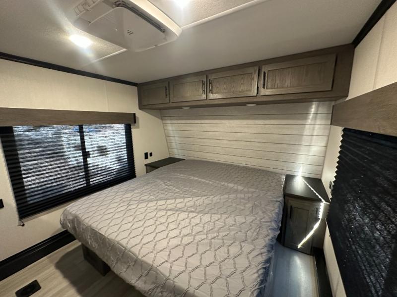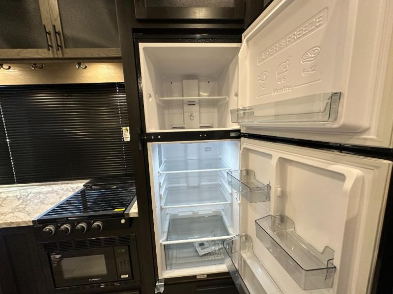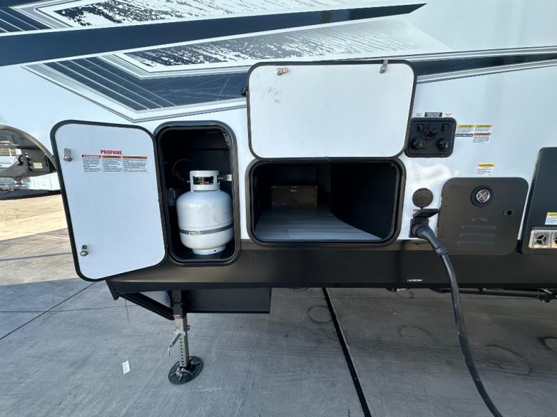 This toy hauler has everything you and your partner need to have a fantastic experience on the road! Unwind in the front bedroom, fitted with a large RV king bed, overhead cabinets, and nightstands on each side of the bed, perfect for keeping all your clothes organized. In the kitchen area, you will find a 12V refrigerator, overhead cabinets, an XL pantry, a microwave, and a TV with a fireplace. Your guests can turn the garage into their bedroom at night since there is a quick set bed system above, a loft/storage, a flip-up top with stools, plus a half bath with folding walls and a flip-down recessed sink!