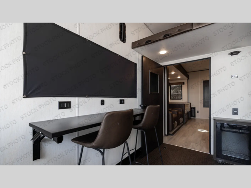 This toy hauler has everything you and your partner need to have a fantastic experience on the road! Unwind in the front bedroom, fitted with a large RV king bed, overhead cabinets, and nightstands on each side of the bed, perfect for keeping all your clothes organized. In the kitchen area, you will find a 12V refrigerator, overhead cabinets, an XL pantry, a microwave, and a TV with a fireplace. Your guests can turn the garage into their bedroom at night since there is a quick set bed system above, a loft/storage, a flip-up top with stools, plus a half bath with folding walls and a flip-down recessed sink!