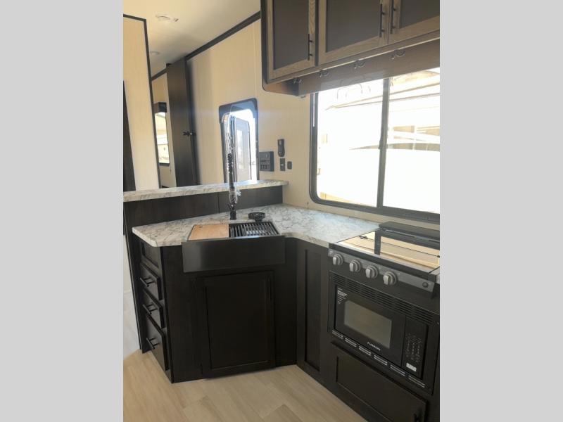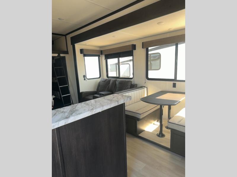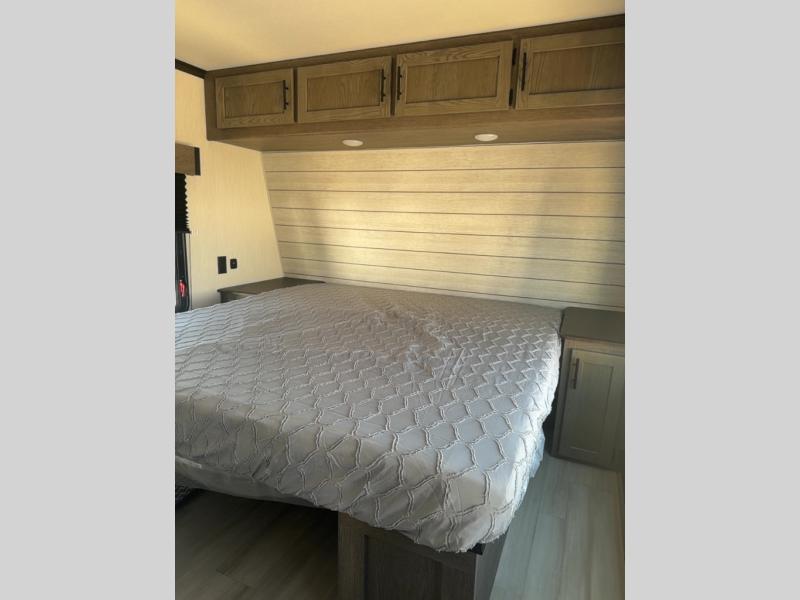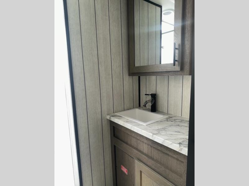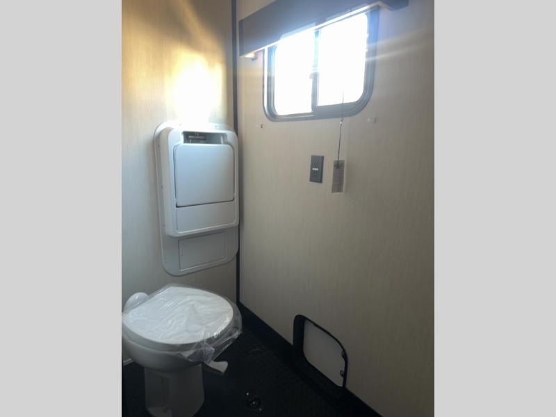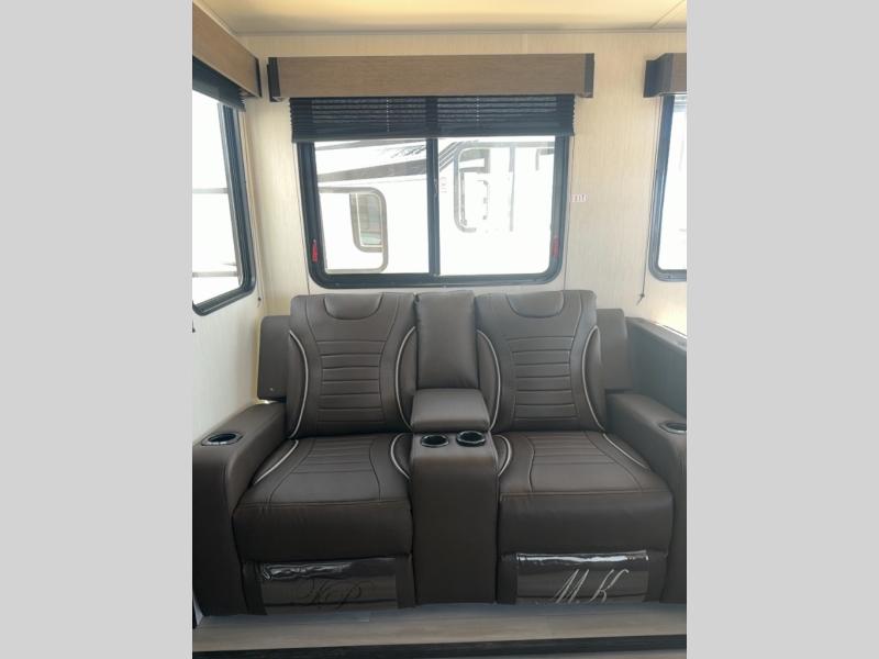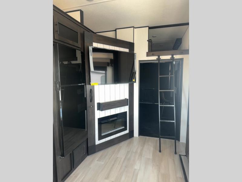 This toy hauler has everything you and your partner need to have a fantastic experience on the road! Unwind in the front bedroom, fitted with a large RV king bed, overhead cabinets, and nightstands on each side of the bed, perfect for keeping all your clothes organized. In the kitchen area, you will find a 12V refrigerator, overhead cabinets, an XL pantry, a microwave, and a TV with a fireplace. Your guests can turn the garage into their bedroom at night since there is a quick set bed system above, a loft/storage, a flip-up top with stools, plus a half bath with folding walls and a flip-down recessed sink!