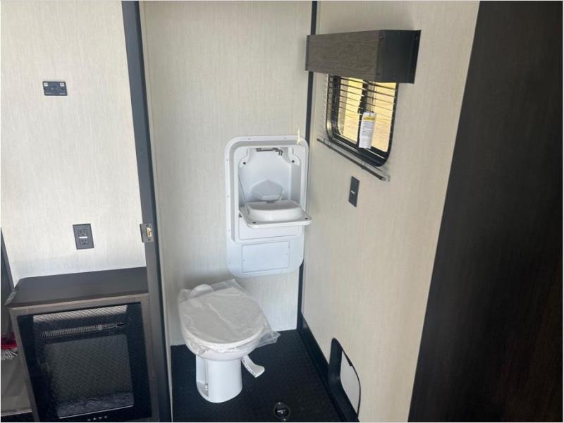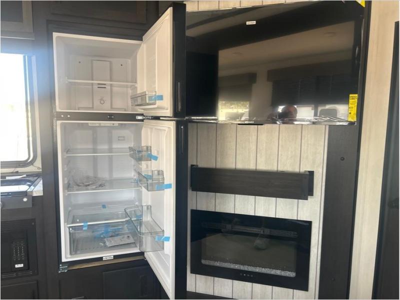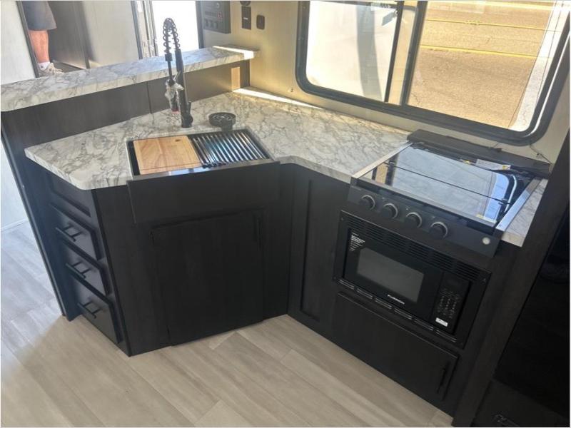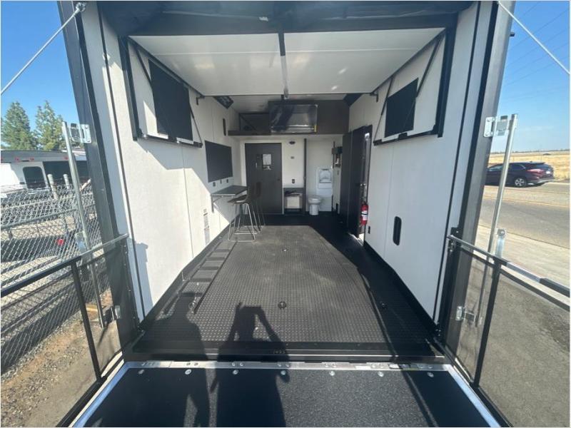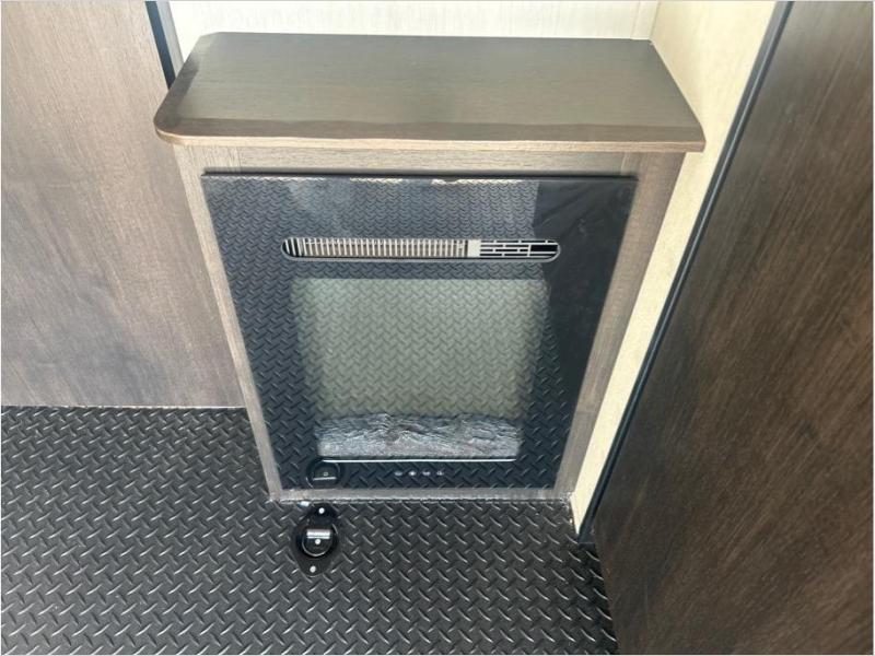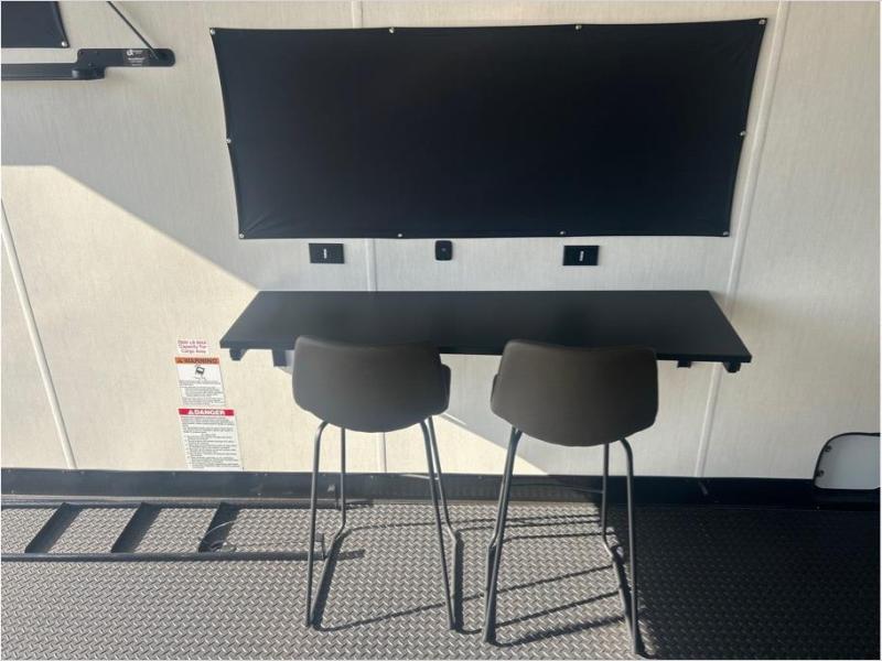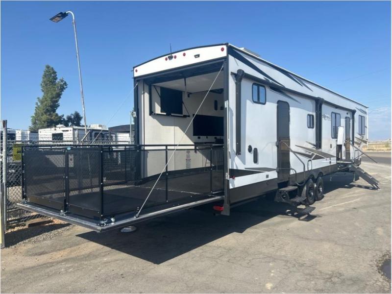 This toy hauler has everything you and your partner need to have a fantastic experience on the road! Unwind in the front bedroom, fitted with a large RV king bed, overhead cabinets, and nightstands on each side of the bed, perfect for keeping all your clothes organized. In the kitchen area, you will find a 12V refrigerator, overhead cabinets, an XL pantry, a microwave, and a TV with a fireplace. Your guests can turn the garage into their bedroom at night since there is a quick set bed system above, a loft/storage, a flip-up top with stools, plus a half bath with folding walls and a flip-down recessed sink!