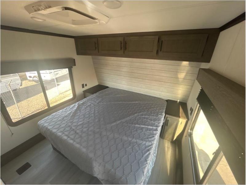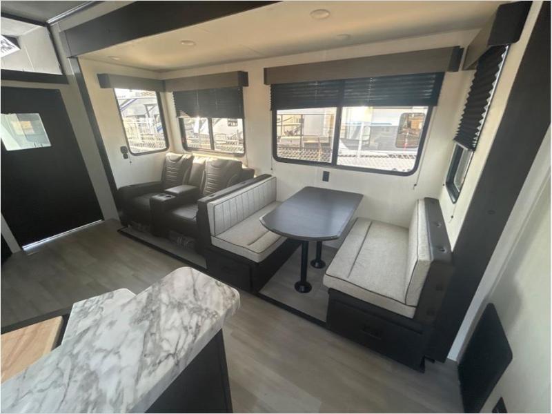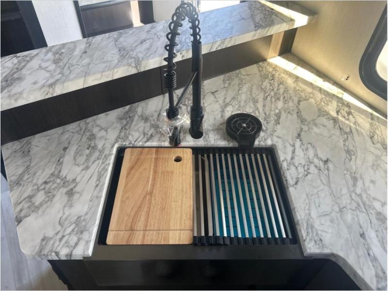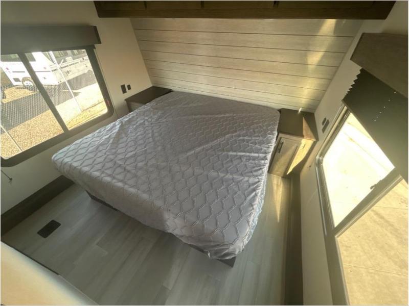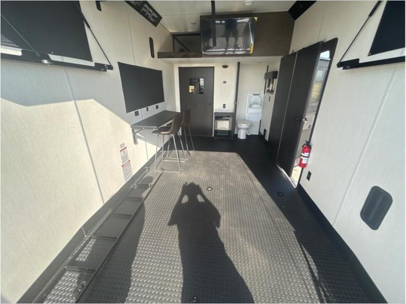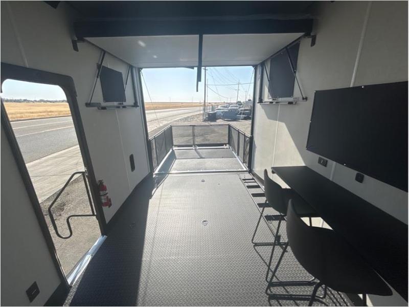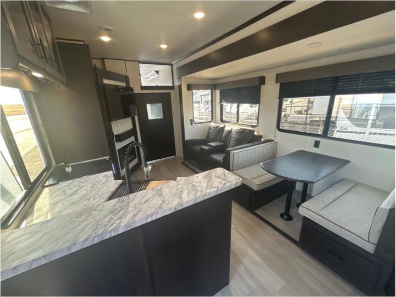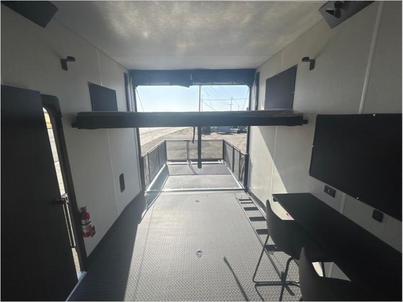 This toy hauler has everything you and your partner need to have a fantastic experience on the road! Unwind in the front bedroom, fitted with a large RV king bed, overhead cabinets, and nightstands on each side of the bed, perfect for keeping all your clothes organized. In the kitchen area, you will find a 12V refrigerator, overhead cabinets, an XL pantry, a microwave, and a TV with a fireplace. Your guests can turn the garage into their bedroom at night since there is a quick set bed system above, a loft/storage, a flip-up top with stools, plus a half bath with folding walls and a flip-down recessed sink!