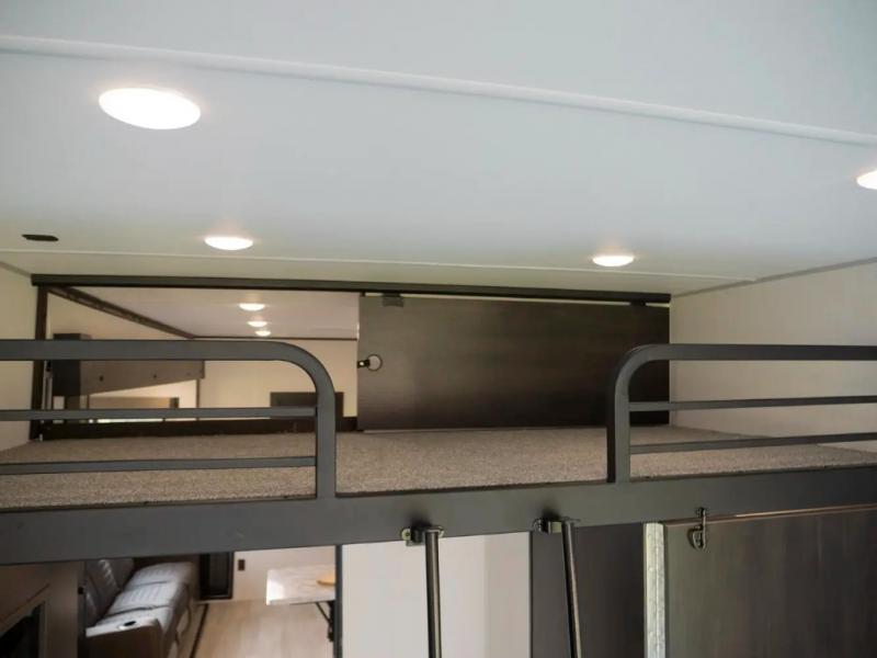 Fun at the campground begins with this dual entry toy hauler in tow! There is a 15' 6" separate garage with glass patio doors, a loft above for guests, a half bath with folding walls and a flip-down recessed bath sink. The combined kitchen and living room features a U-shaped kitchen with a flip-up countertop, a sofa slide out, and a bartop. There is even an outdoor kitchen on the other side of this counter so you can make breakfast as the sun comes up. A full bath lets you freshen up after a trail ride, and the front private bedroom gives you your own space at night. This unit also features washer and dryer prep in the bedroom so you can add those appliances if you wish. Your guests can sleep on the quick set bed system in the garage or in the loft if it's not being used for storage!