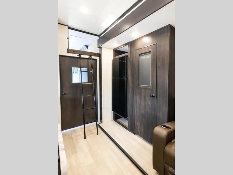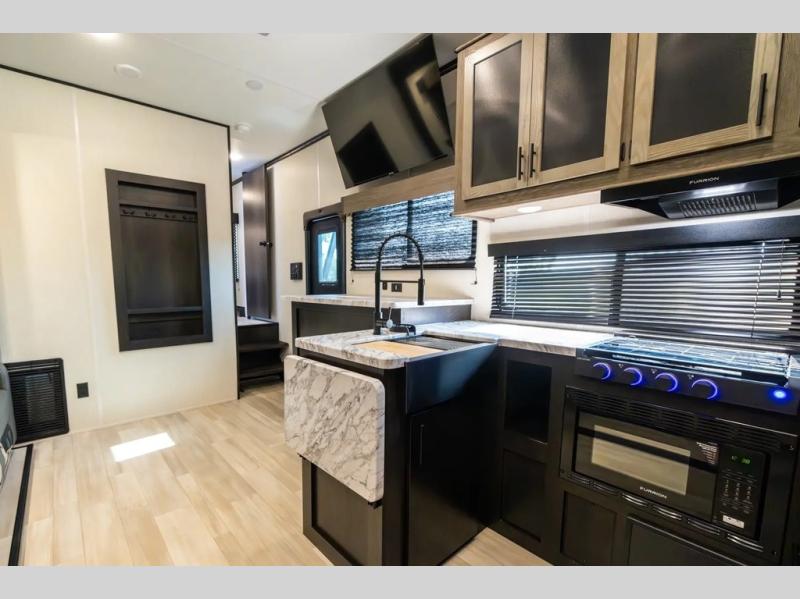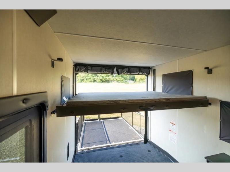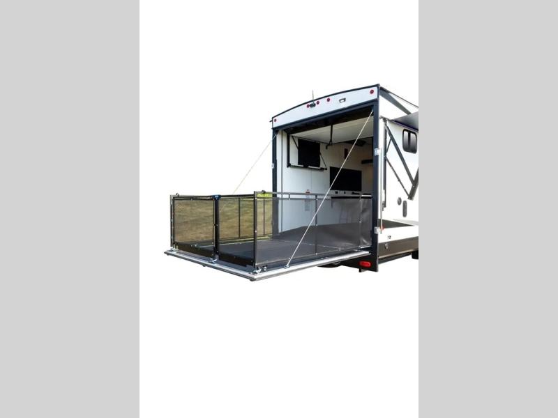 Fun at the campground begins with this dual entry toy hauler in tow! There is a 15' 6" separate garage with glass patio doors, a loft above for guests, a half bath with folding walls and a flip-down recessed bath sink. The combined kitchen and living room features a U-shaped kitchen with a flip-up countertop, a sofa slide out, and a bartop. There is even an outdoor kitchen on the other side of this counter so you can make breakfast as the sun comes up. A full bath lets you freshen up after a trail ride, and the front private bedroom gives you your own space at night. This unit also features washer and dryer prep in the bedroom so you can add those appliances if you wish. Your guests can sleep on the quick set bed system in the garage or in the loft if it's not being used for storage!
