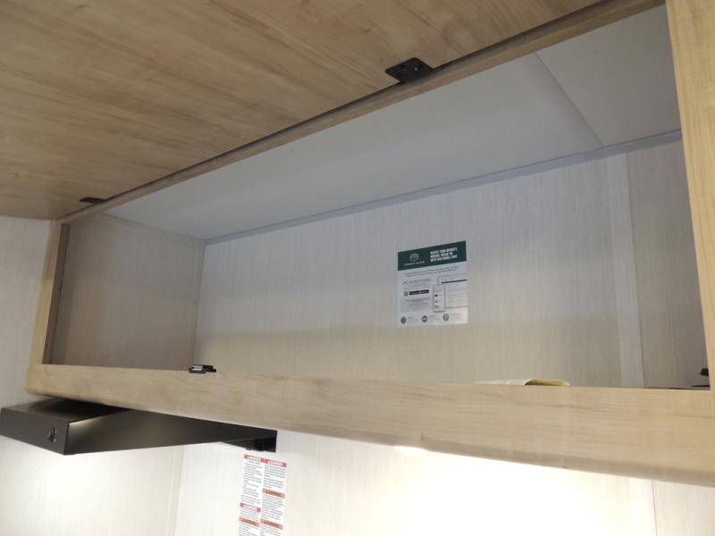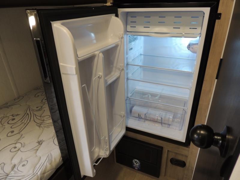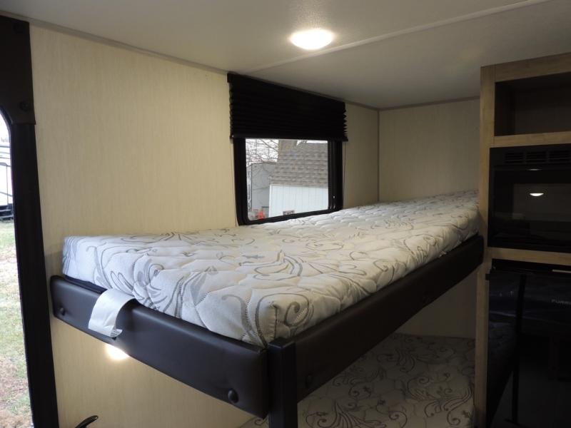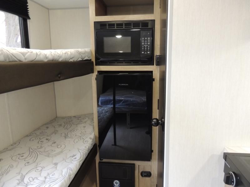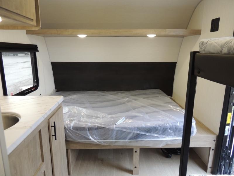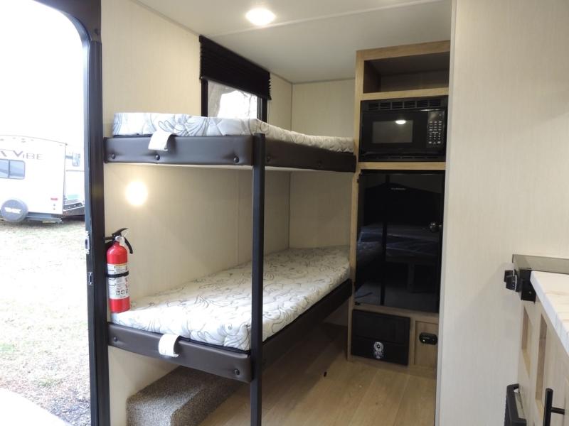 This travel trailer is perfect for epic road trips, memorable camping excursions, or rejuvenating getaways. The private bathroom is equipped with everything you need for a comfortable stay, providing a convenient spot to freshen up after a long day of exploring. The kitchen is equipped with a refrigerator for keeping drinks and ingredients fresh, and a microwave for quick reheating. The bunk beds are a great spot to take a nap or a kid's sleeping space. Overhead cabinets provide additional storage for cookware, dishes, and other essentials. In addition, the queen-sized bed provides a comfortable sleeping space, perfect for relaxing after a long day.