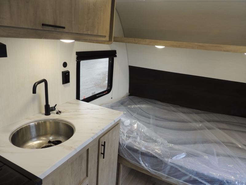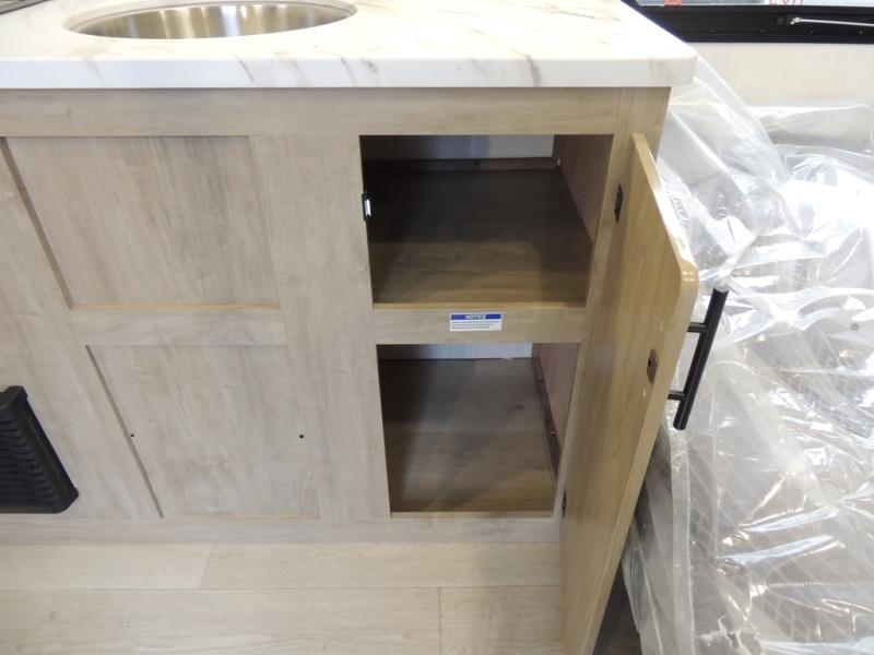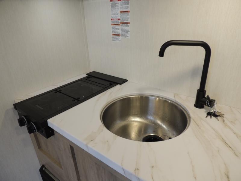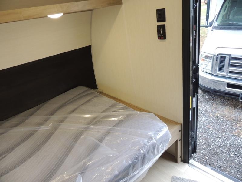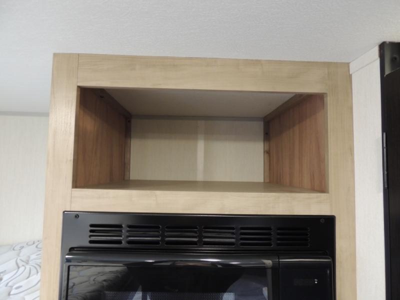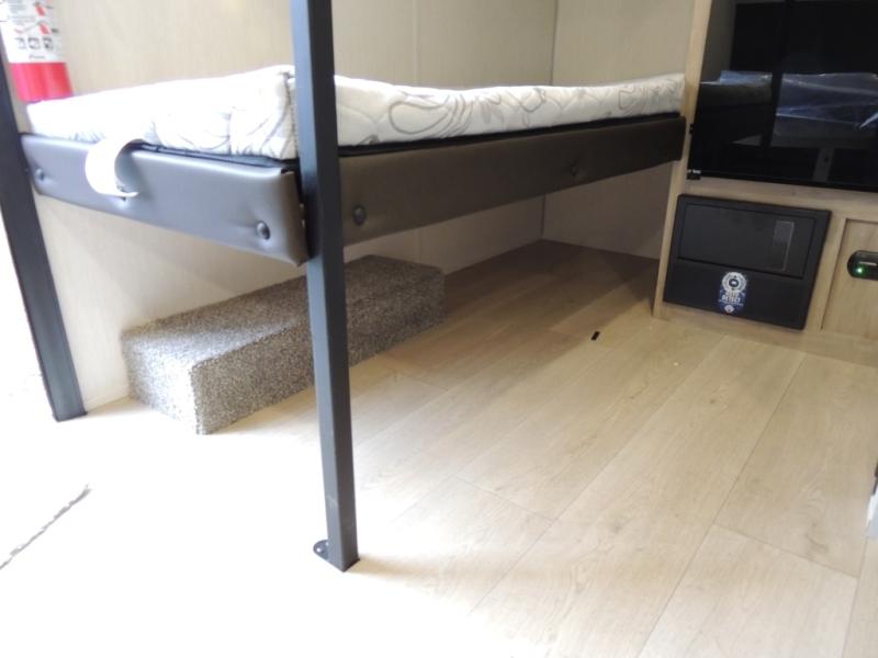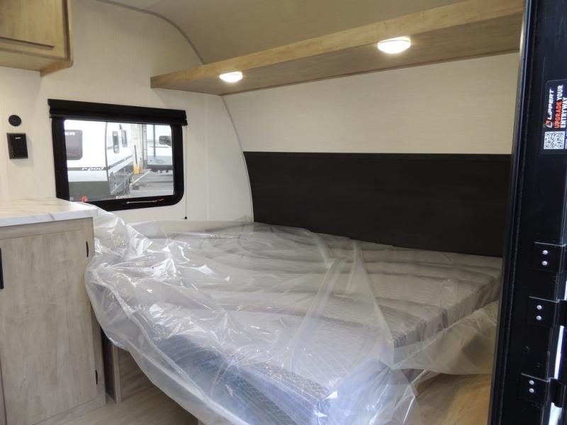 This travel trailer is perfect for epic road trips, memorable camping excursions, or rejuvenating getaways. The private bathroom is equipped with everything you need for a comfortable stay, providing a convenient spot to freshen up after a long day of exploring. The kitchen is equipped with a refrigerator for keeping drinks and ingredients fresh, and a microwave for quick reheating. The bunk beds are a great spot to take a nap or a kid's sleeping space. Overhead cabinets provide additional storage for cookware, dishes, and other essentials. In addition, the queen-sized bed provides a comfortable sleeping space, perfect for relaxing after a long day.