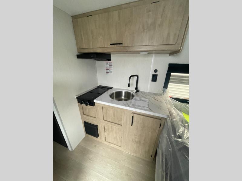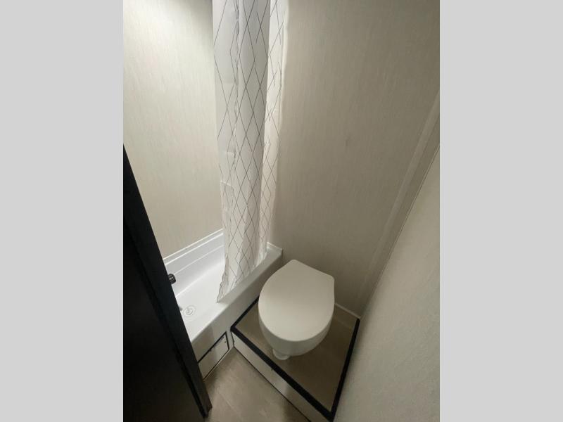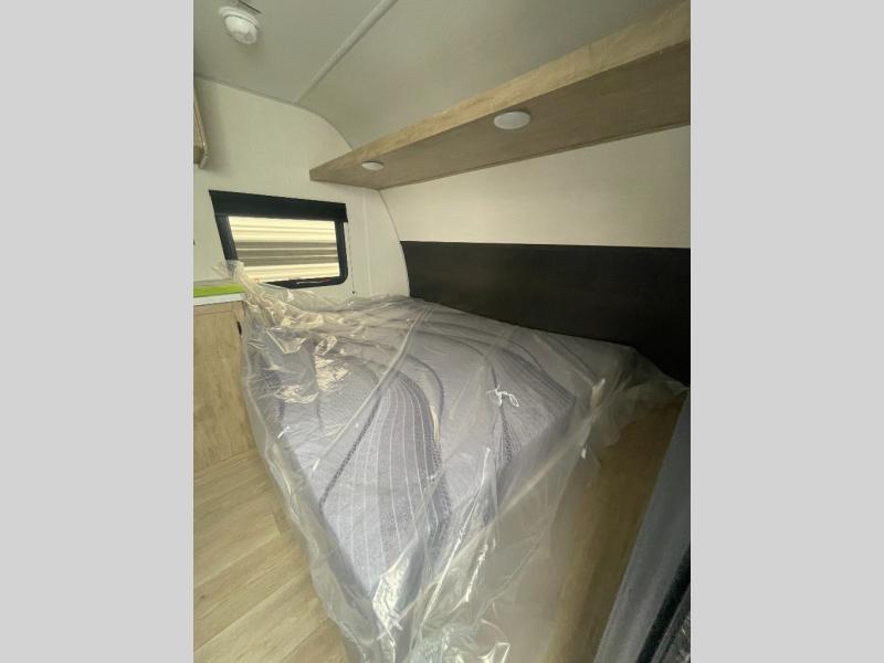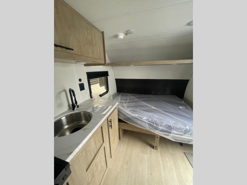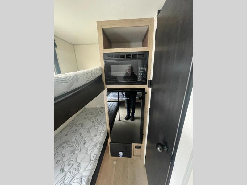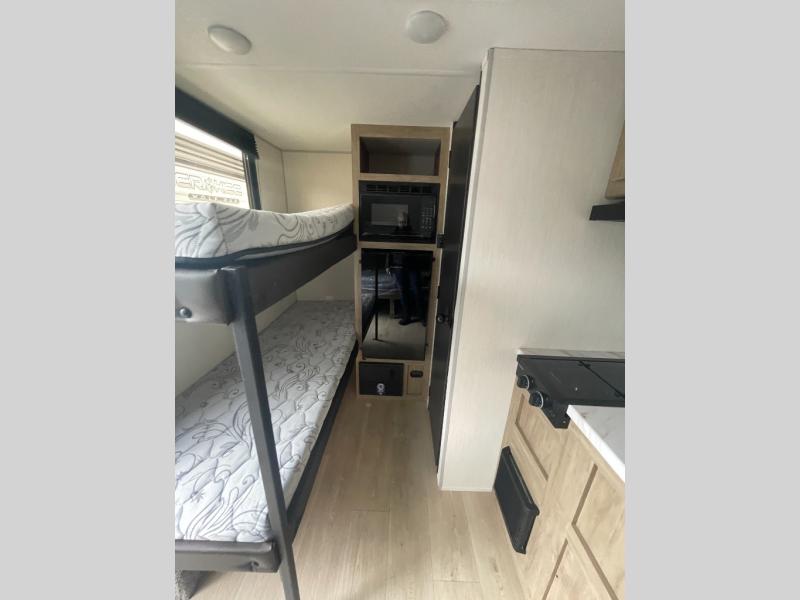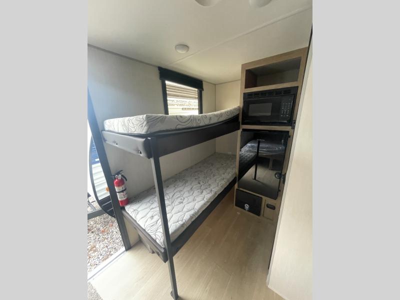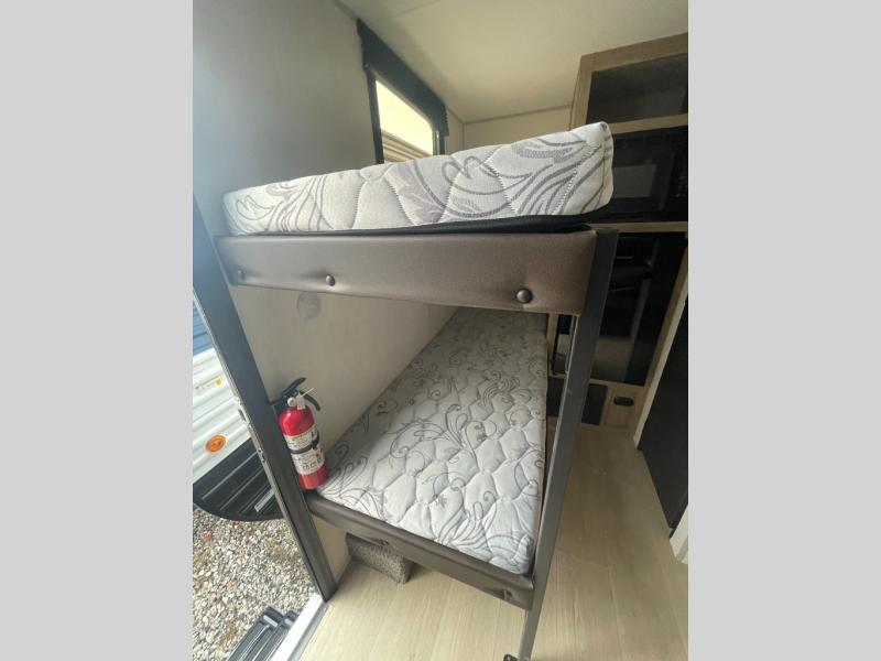 This travel trailer is perfect for epic road trips, memorable camping excursions, or rejuvenating getaways. The private bathroom is equipped with everything you need for a comfortable stay, providing a convenient spot to freshen up after a long day of exploring. The kitchen is equipped with a refrigerator for keeping drinks and ingredients fresh, and a microwave for quick reheating. The bunk beds are a great spot to take a nap or a kid's sleeping space. Overhead cabinets provide additional storage for cookware, dishes, and other essentials. In addition, the queen-sized bed provides a comfortable sleeping space, perfect for relaxing after a long day.