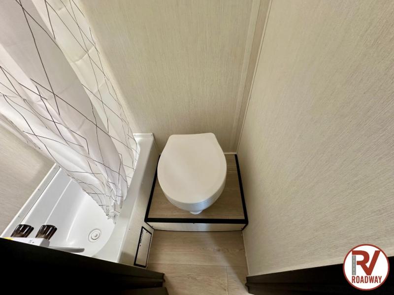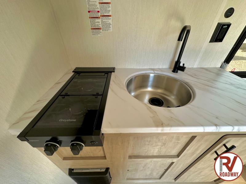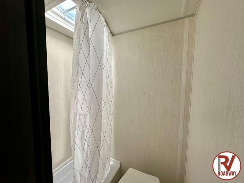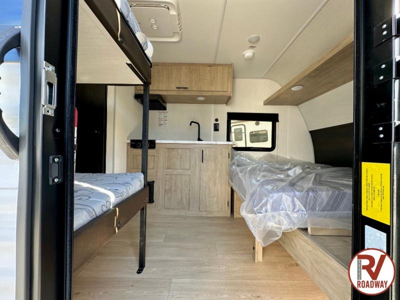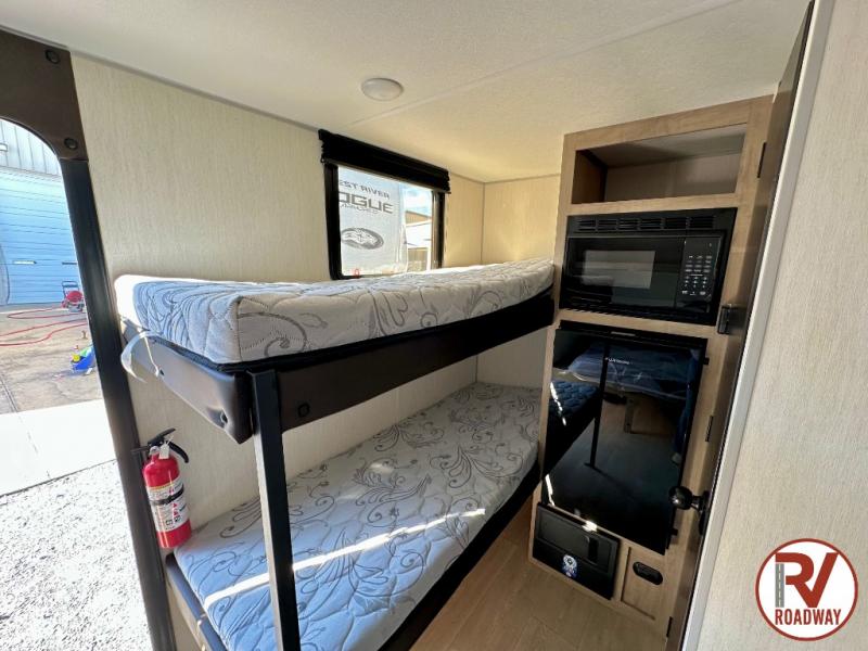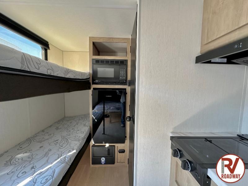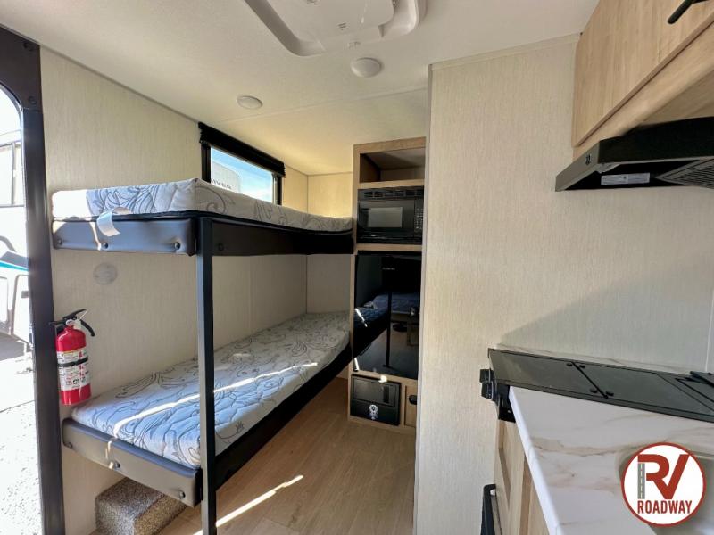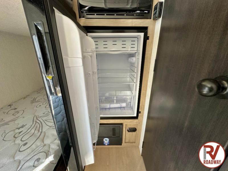 This travel trailer is perfect for epic road trips, memorable camping excursions, or rejuvenating getaways. The private bathroom is equipped with everything you need for a comfortable stay, providing a convenient spot to freshen up after a long day of exploring. The kitchen is equipped with a refrigerator for keeping drinks and ingredients fresh, and a microwave for quick reheating. The bunk beds are a great spot to take a nap or a kid's sleeping space. Overhead cabinets provide additional storage for cookware, dishes, and other essentials. In addition, the queen-sized bed provides a comfortable sleeping space, perfect for relaxing after a long day.