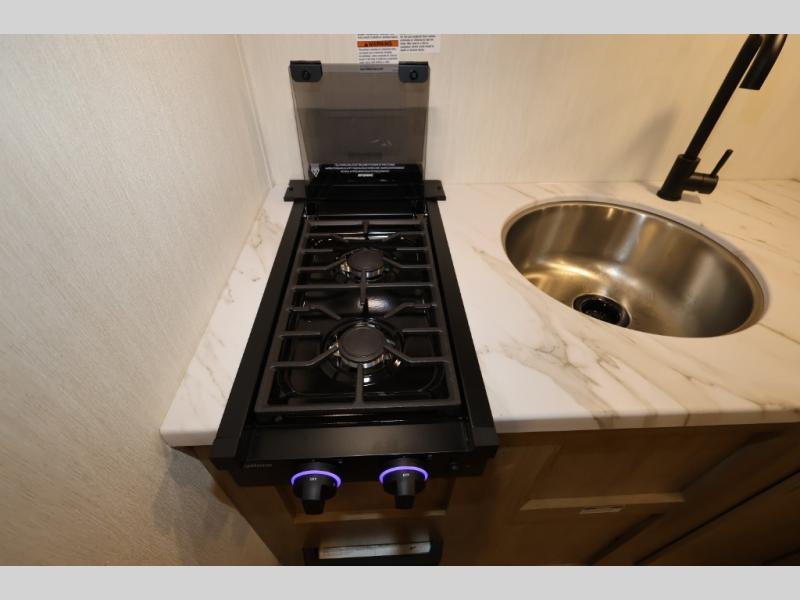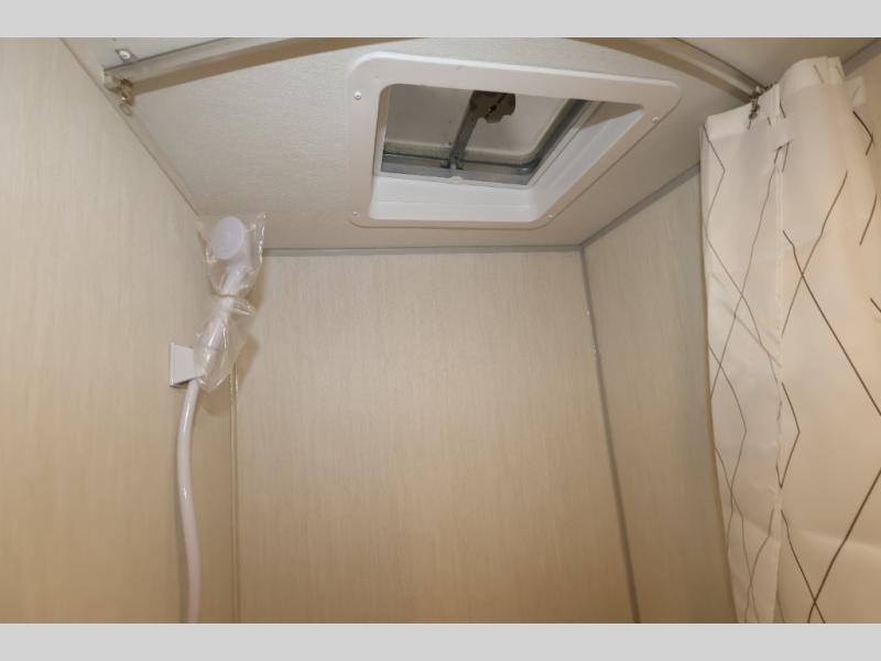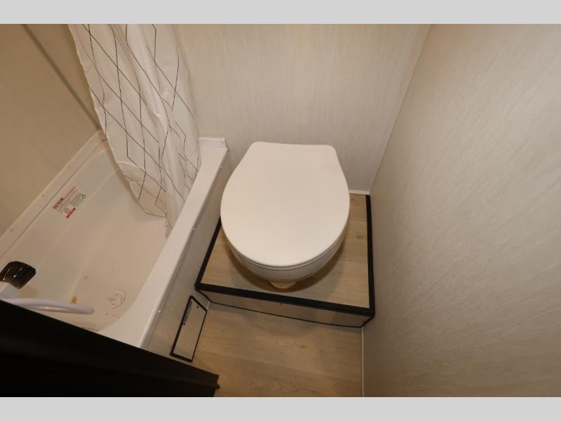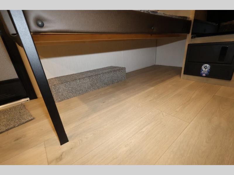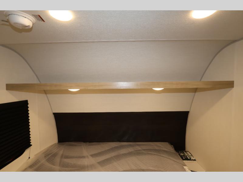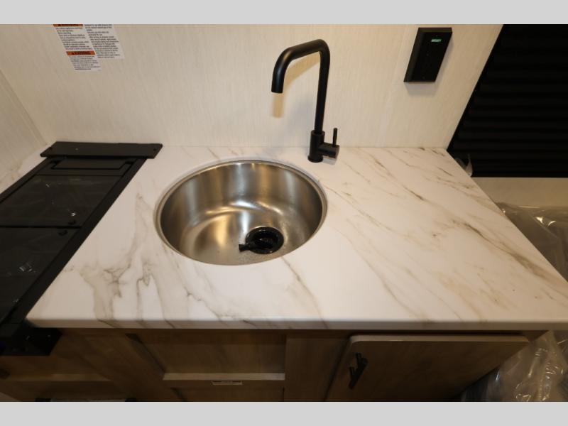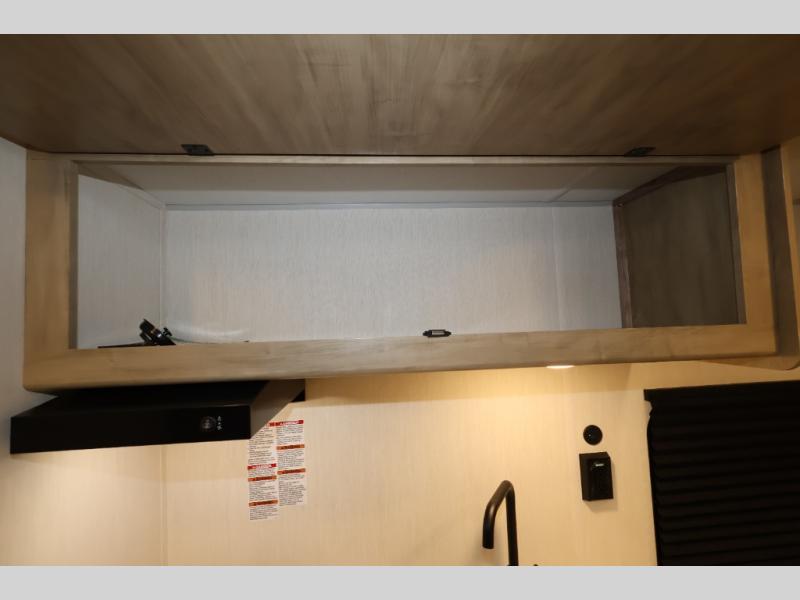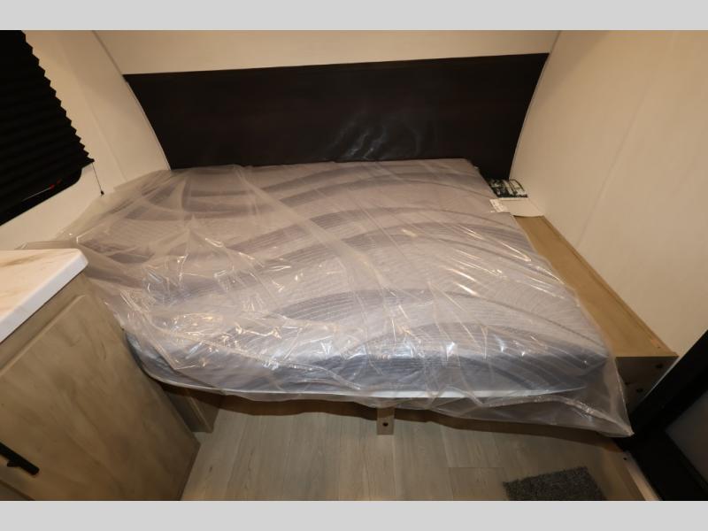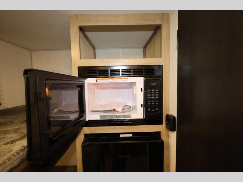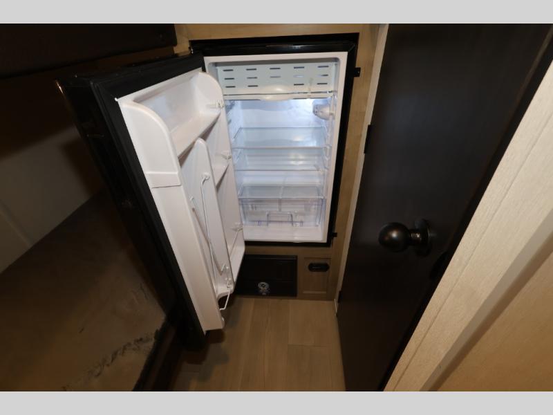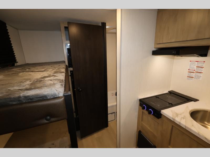 This travel trailer is perfect for epic road trips, memorable camping excursions, or rejuvenating getaways. The private bathroom is equipped with everything you need for a comfortable stay, providing a convenient spot to freshen up after a long day of exploring. The kitchen is equipped with a refrigerator for keeping drinks and ingredients fresh, and a microwave for quick reheating. The bunk beds are a great spot to take a nap or a kid's sleeping space. Overhead cabinets provide additional storage for cookware, dishes, and other essentials. In addition, the queen-sized bed provides a comfortable sleeping space, perfect for relaxing after a long day.