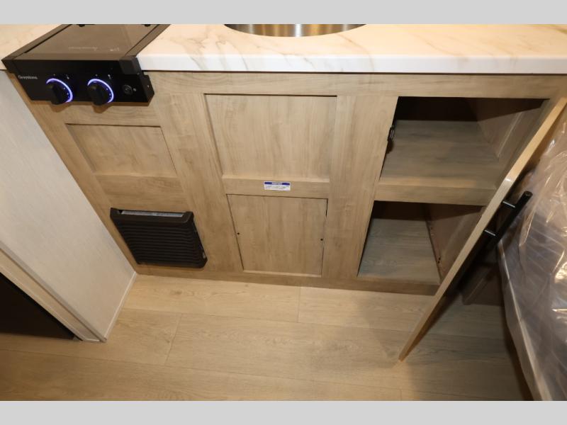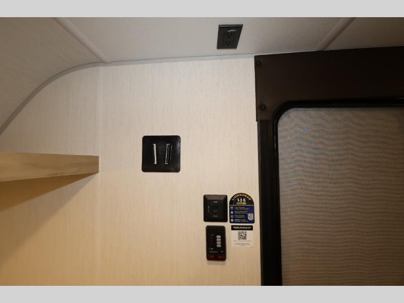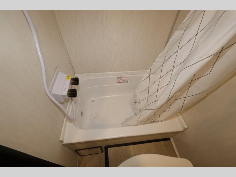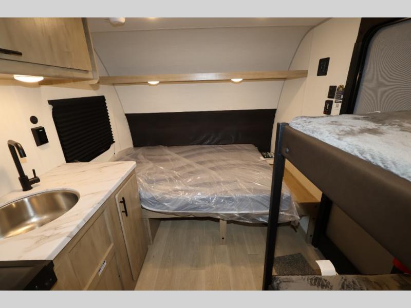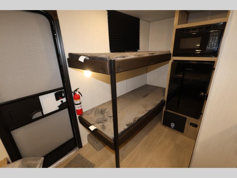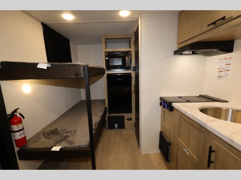 This travel trailer is perfect for epic road trips, memorable camping excursions, or rejuvenating getaways. The private bathroom is equipped with everything you need for a comfortable stay, providing a convenient spot to freshen up after a long day of exploring. The kitchen is equipped with a refrigerator for keeping drinks and ingredients fresh, and a microwave for quick reheating. The bunk beds are a great spot to take a nap or a kid's sleeping space. Overhead cabinets provide additional storage for cookware, dishes, and other essentials. In addition, the queen-sized bed provides a comfortable sleeping space, perfect for relaxing after a long day.
