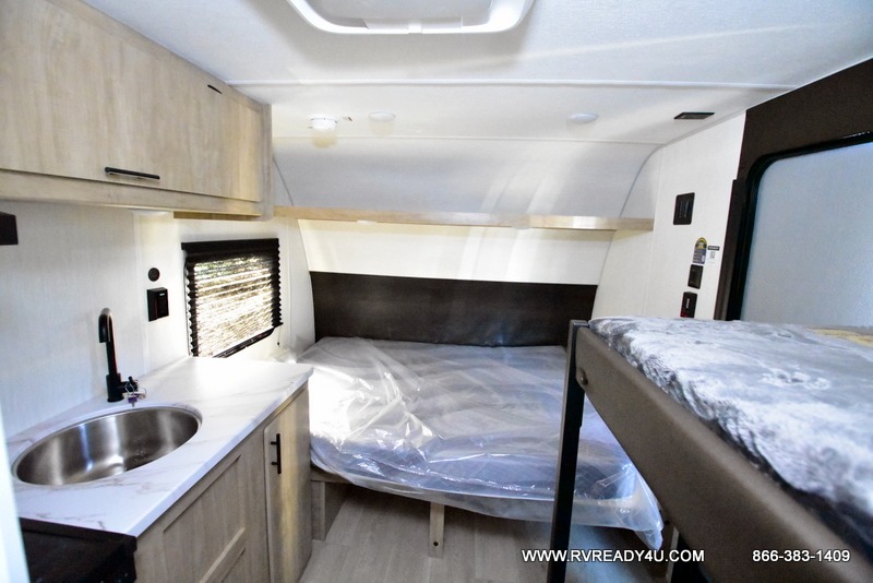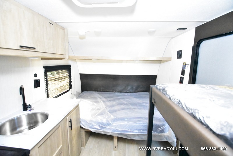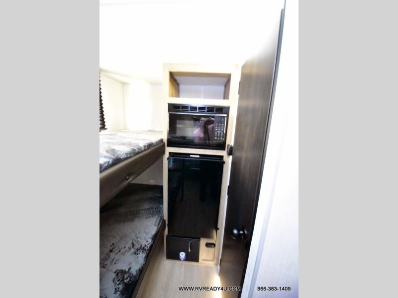 This travel trailer is perfect for epic road trips, memorable camping excursions, or rejuvenating getaways. The private bathroom is equipped with everything you need for a comfortable stay, providing a convenient spot to freshen up after a long day of exploring. The kitchen is equipped with a refrigerator for keeping drinks and ingredients fresh, and a microwave for quick reheating. The bunk beds are a great spot to take a nap or a kid's sleeping space. Overhead cabinets provide additional storage for cookware, dishes, and other essentials. In addition, the queen-sized bed provides a comfortable sleeping space, perfect for relaxing after a long day.