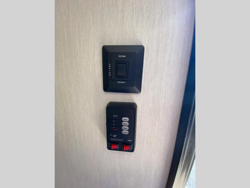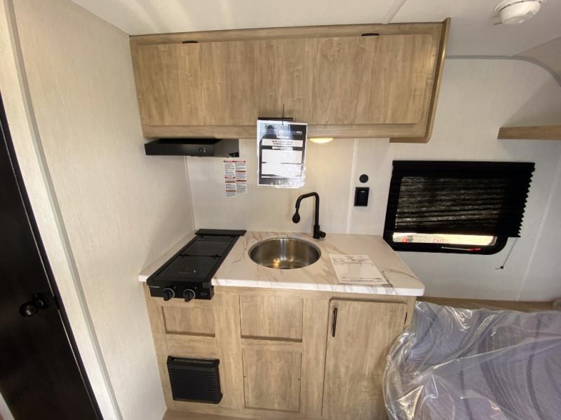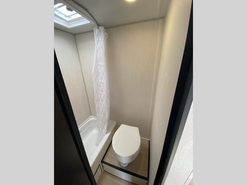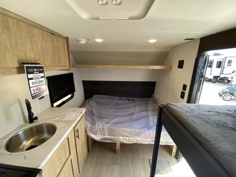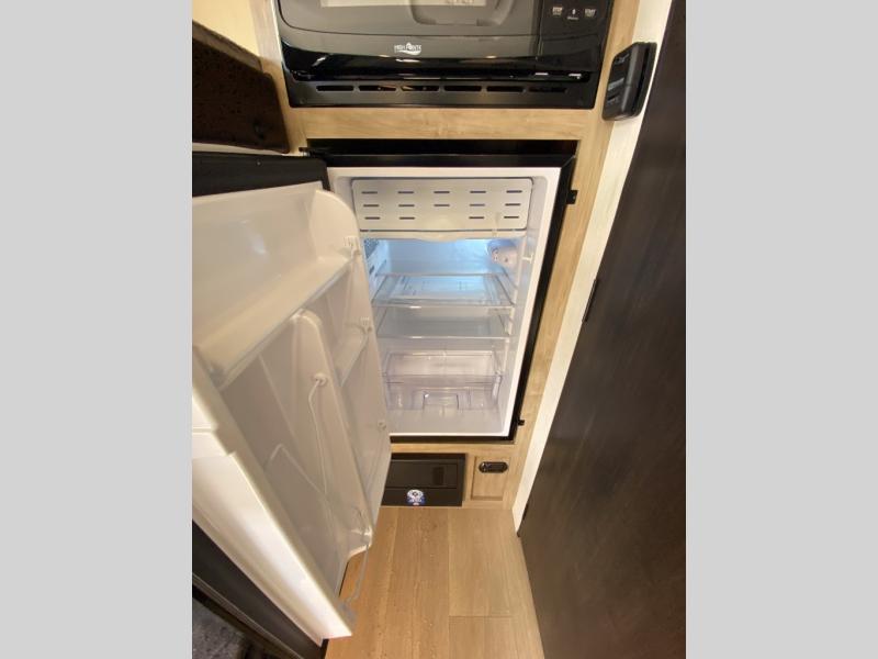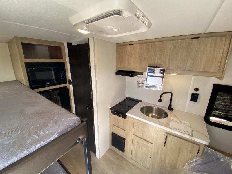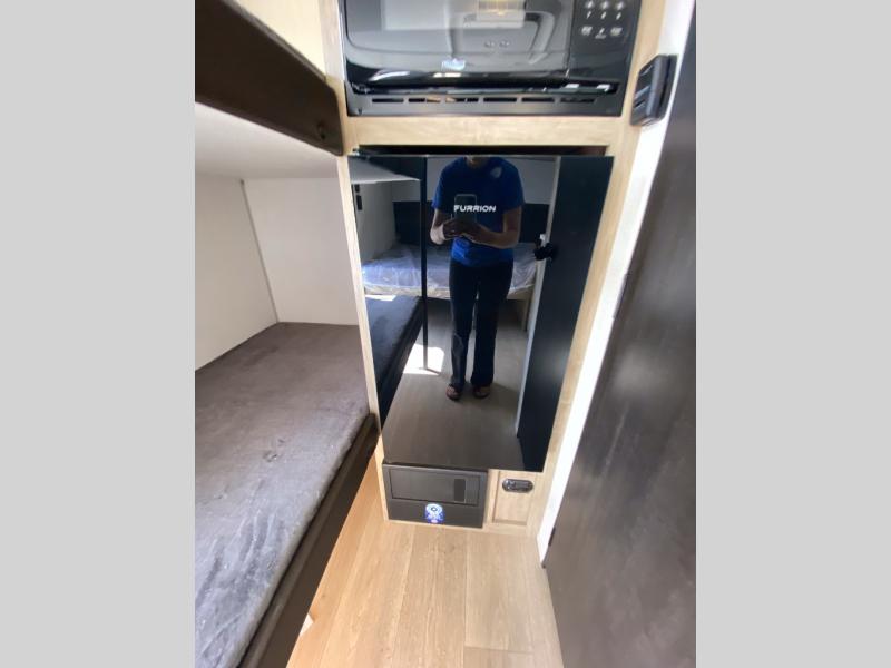 This travel trailer is perfect for epic road trips, memorable camping excursions, or rejuvenating getaways. The private bathroom is equipped with everything you need for a comfortable stay, providing a convenient spot to freshen up after a long day of exploring. The kitchen is equipped with a refrigerator for keeping drinks and ingredients fresh, and a microwave for quick reheating. The bunk beds are a great spot to take a nap or a kid's sleeping space. Overhead cabinets provide additional storage for cookware, dishes, and other essentials. In addition, the queen-sized bed provides a comfortable sleeping space, perfect for relaxing after a long day.