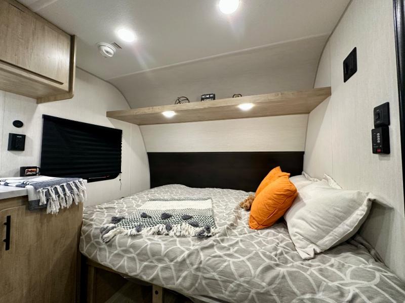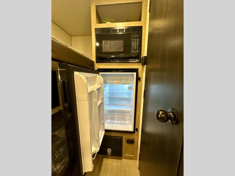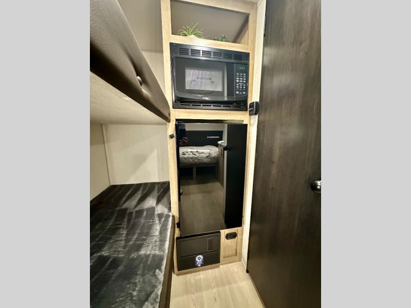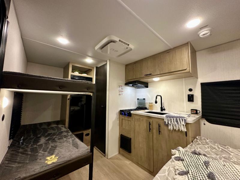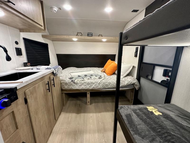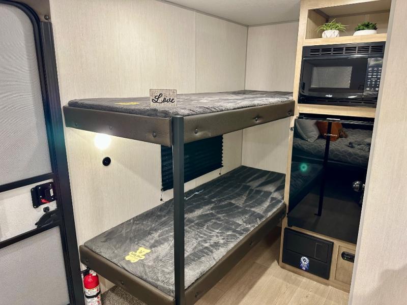 This travel trailer is perfect for epic road trips, memorable camping excursions, or rejuvenating getaways. The private bathroom is equipped with everything you need for a comfortable stay, providing a convenient spot to freshen up after a long day of exploring. The kitchen is equipped with a refrigerator for keeping drinks and ingredients fresh, and a microwave for quick reheating. The bunk beds are a great spot to take a nap or a kid's sleeping space. Overhead cabinets provide additional storage for cookware, dishes, and other essentials. In addition, the queen-sized bed provides a comfortable sleeping space, perfect for relaxing after a long day.