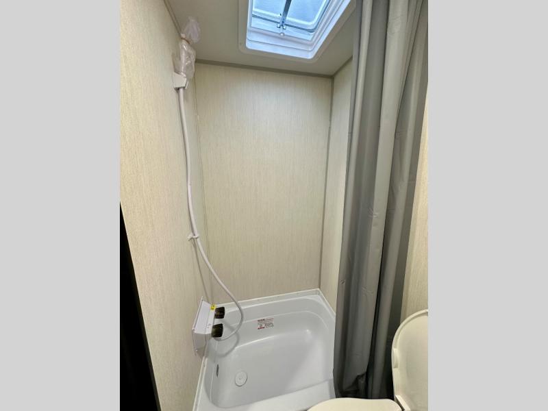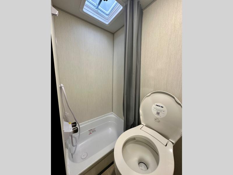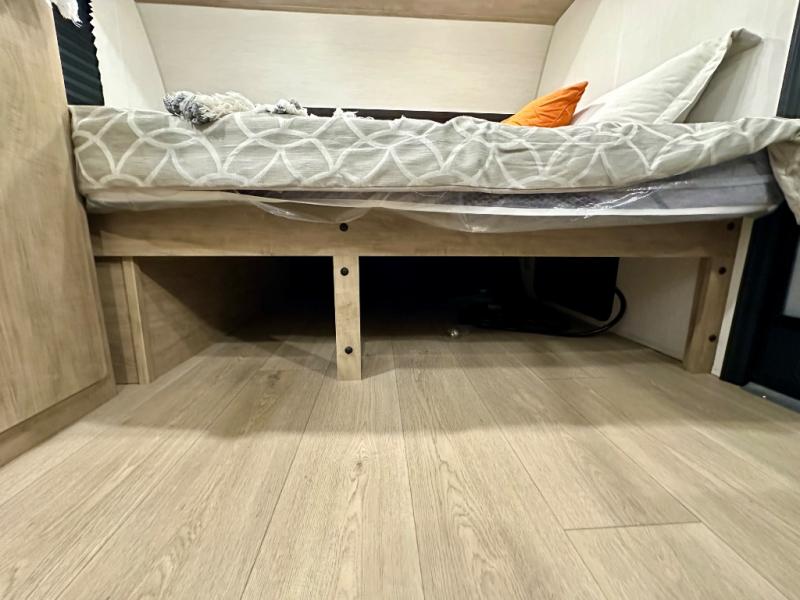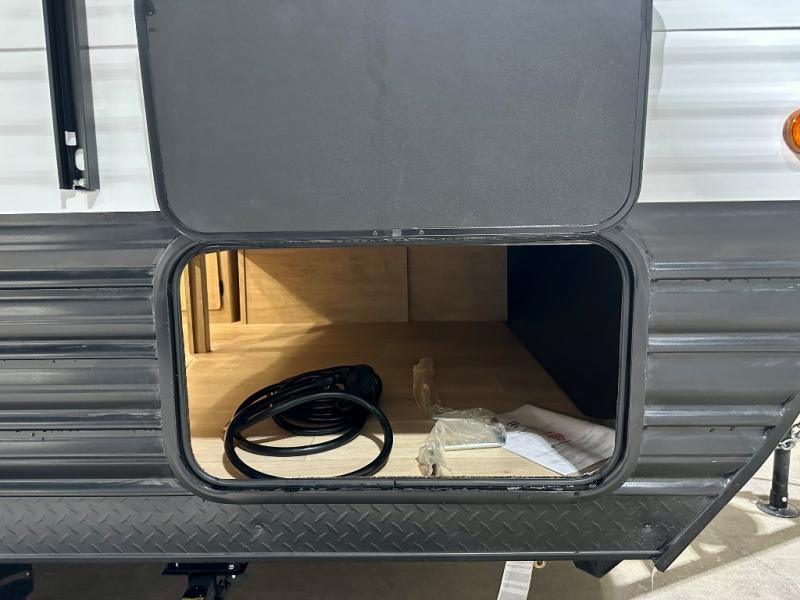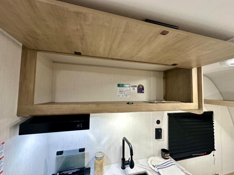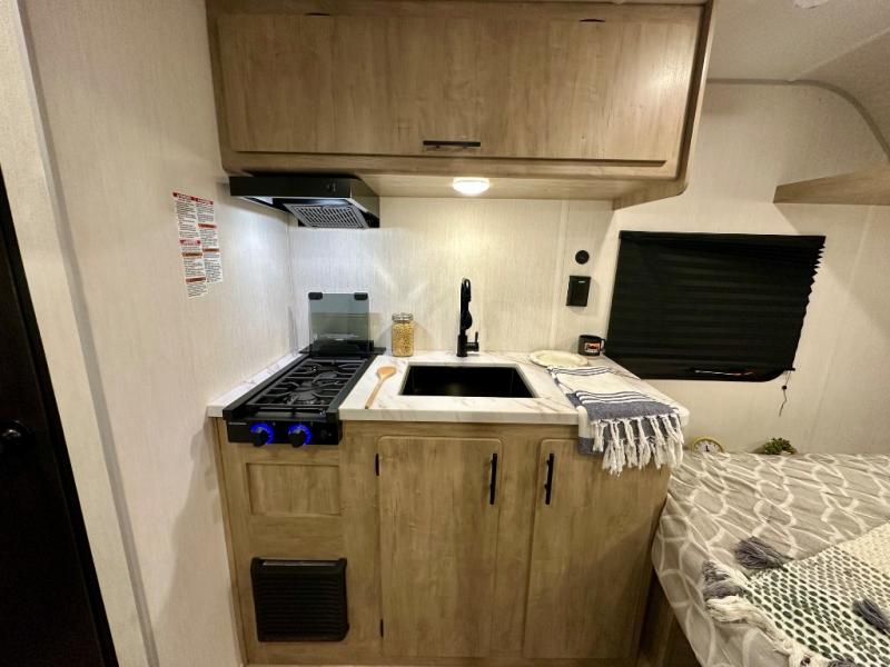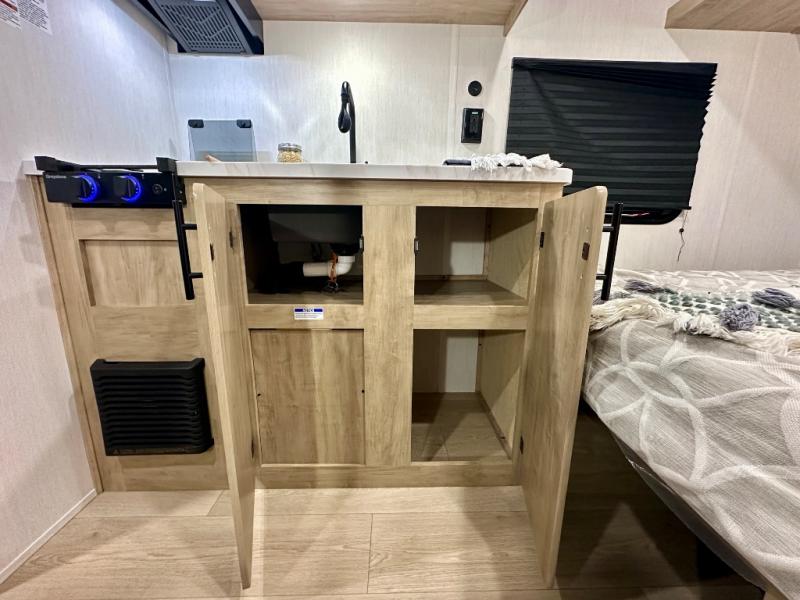 This travel trailer is perfect for epic road trips, memorable camping excursions, or rejuvenating getaways. The private bathroom is equipped with everything you need for a comfortable stay, providing a convenient spot to freshen up after a long day of exploring. The kitchen is equipped with a refrigerator for keeping drinks and ingredients fresh, and a microwave for quick reheating. The bunk beds are a great spot to take a nap or a kid's sleeping space. Overhead cabinets provide additional storage for cookware, dishes, and other essentials. In addition, the queen-sized bed provides a comfortable sleeping space, perfect for relaxing after a long day.