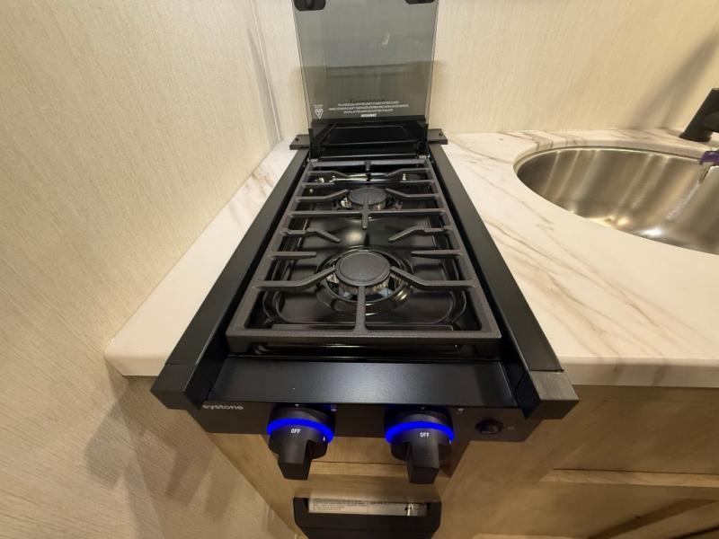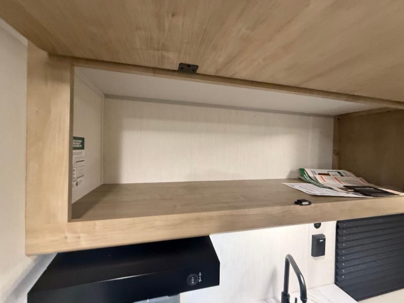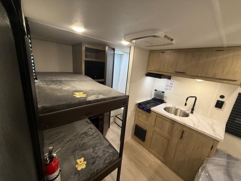 This travel trailer is perfect for epic road trips, memorable camping excursions, or rejuvenating getaways. The full bathroom is equipped with everything you need for a comfortable stay, providing a convenient spot to freshen up after a long day of exploring. The kitchen is equipped with a refrigerator for keeping drinks and ingredients fresh, and a microwave for quick reheating. The bunk beds are a great spot to take a nap or a kid's sleeping space. Overhead cabinets provide additional storage for cookware, dishes, and other essentials. In addition, the queen-sized bed provides a comfortable sleeping space, perfect for relaxing after a long day.