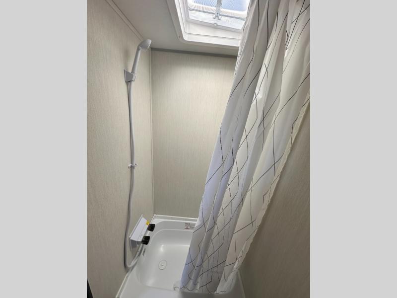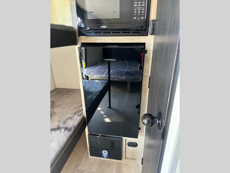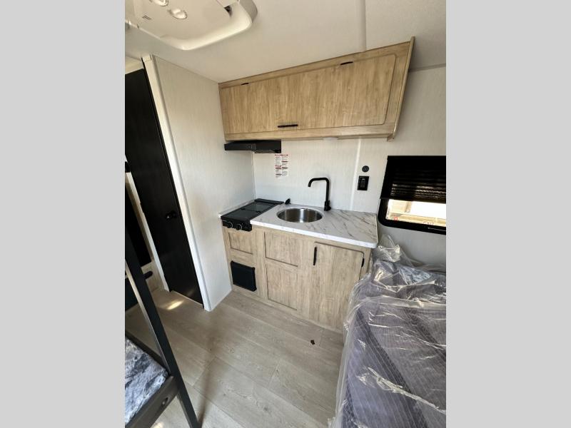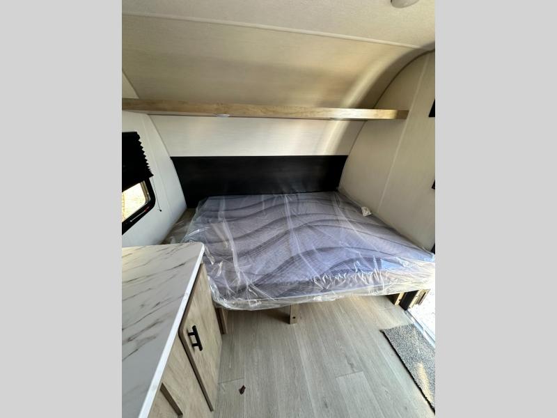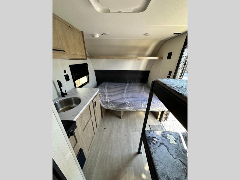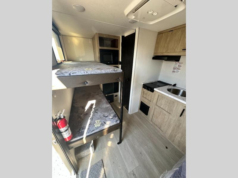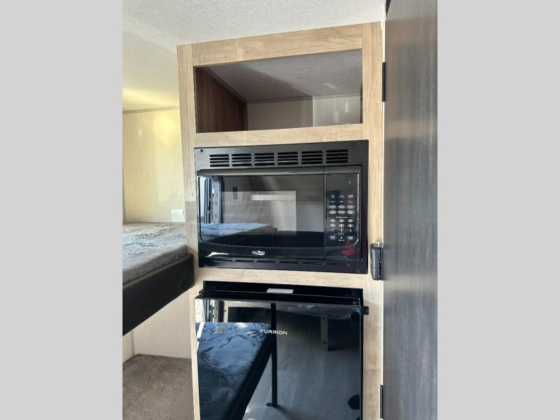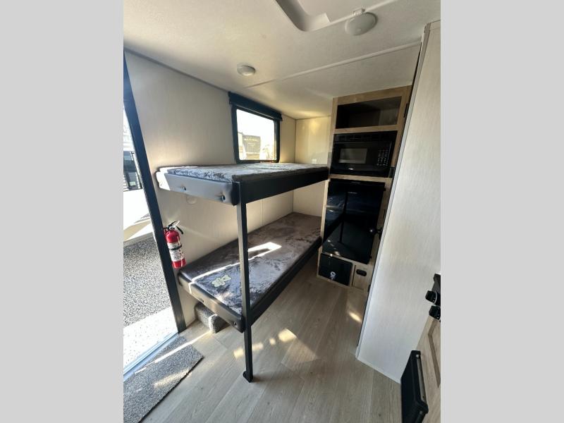 This travel trailer is perfect for epic road trips, memorable camping excursions, or rejuvenating getaways. The private bathroom is equipped with everything you need for a comfortable stay, providing a convenient spot to freshen up after a long day of exploring. The kitchen is equipped with a refrigerator for keeping drinks and ingredients fresh, and a microwave for quick reheating. The bunk beds are a great spot to take a nap or a kid's sleeping space. Overhead cabinets provide additional storage for cookware, dishes, and other essentials. In addition, the queen-sized bed provides a comfortable sleeping space, perfect for relaxing after a long day.