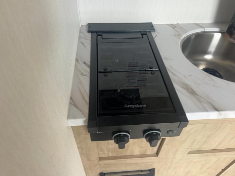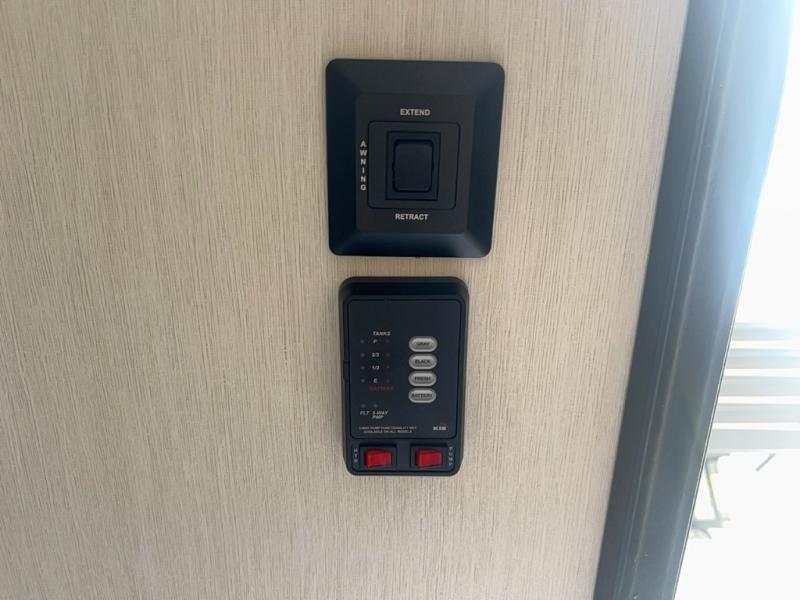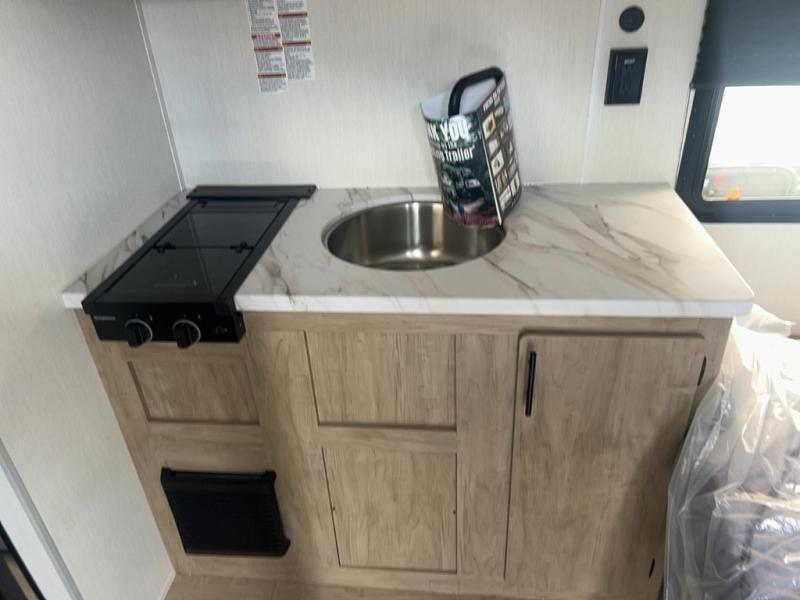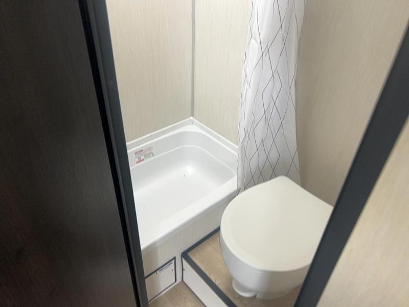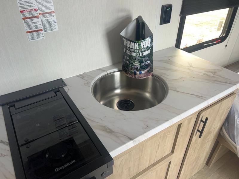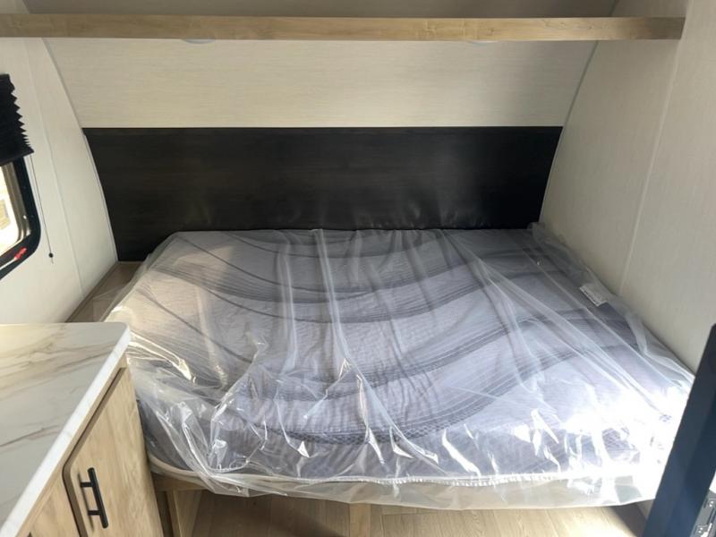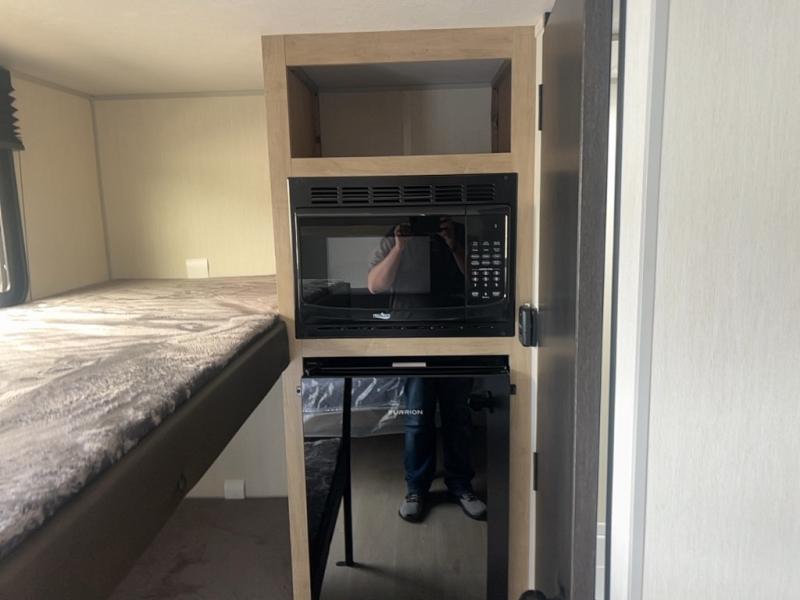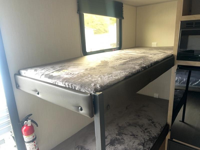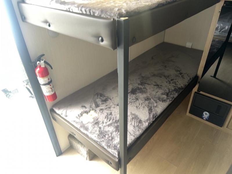 This travel trailer is perfect for epic road trips, memorable camping excursions, or rejuvenating getaways. The full bathroom is equipped with everything you need for a comfortable stay, providing a convenient spot to freshen up after a long day of exploring. The kitchen is equipped with a refrigerator for keeping drinks and ingredients fresh, and a microwave for quick reheating. The bunk beds are a great spot to take a nap or a kid's sleeping space. Overhead cabinets provide additional storage for cookware, dishes, and other essentials. In addition, the queen-sized bed provides a comfortable sleeping space, perfect for relaxing after a long day.