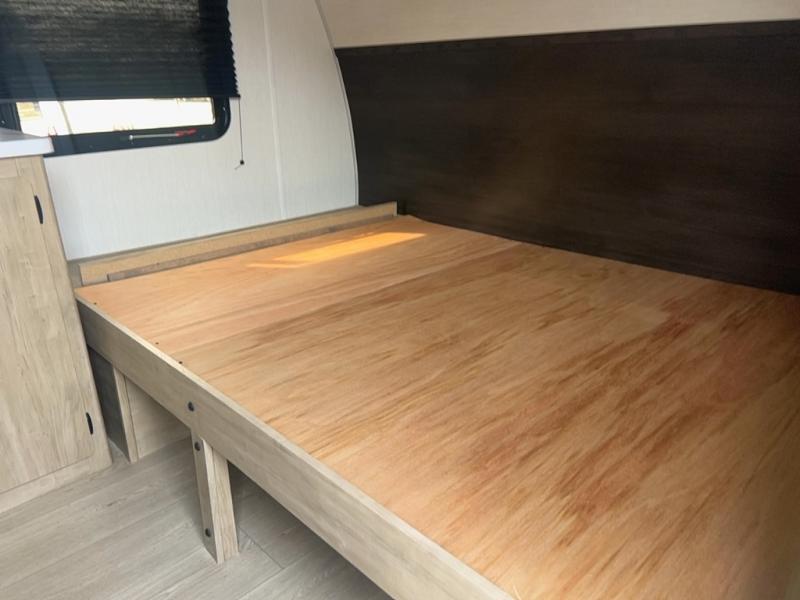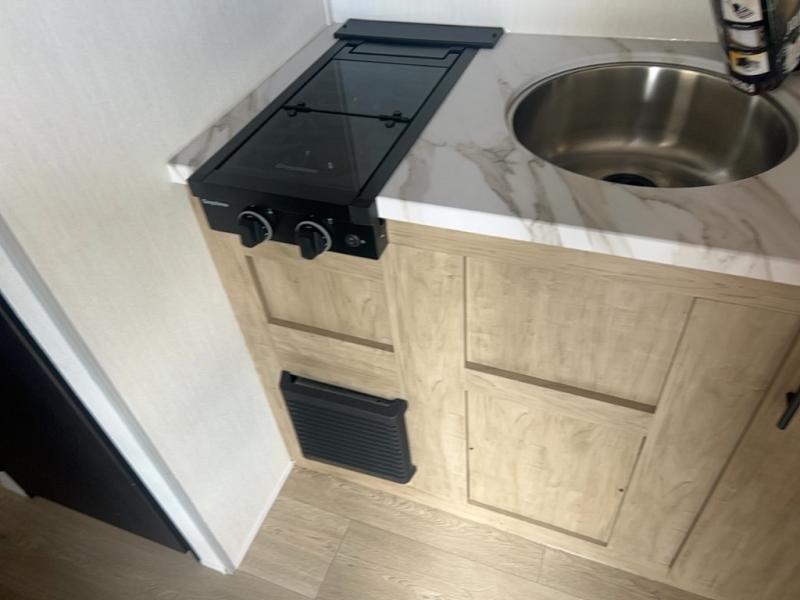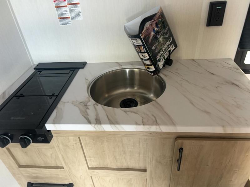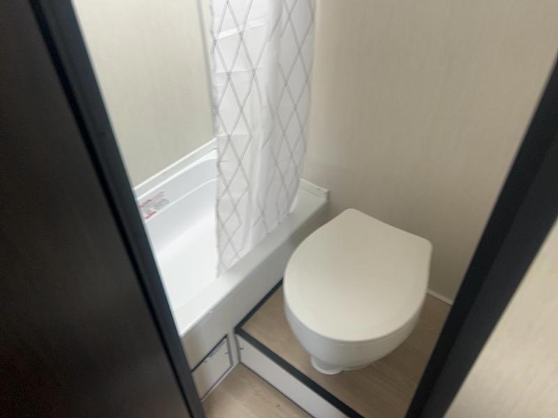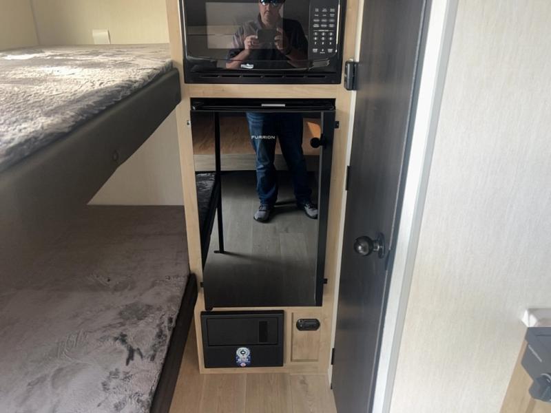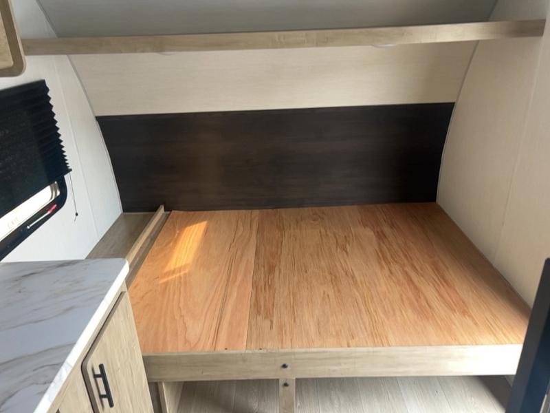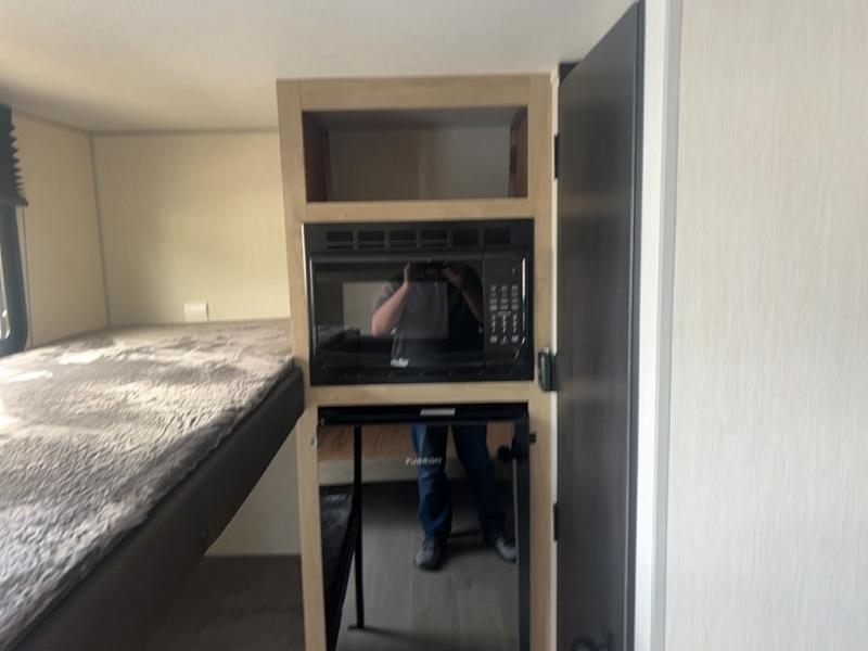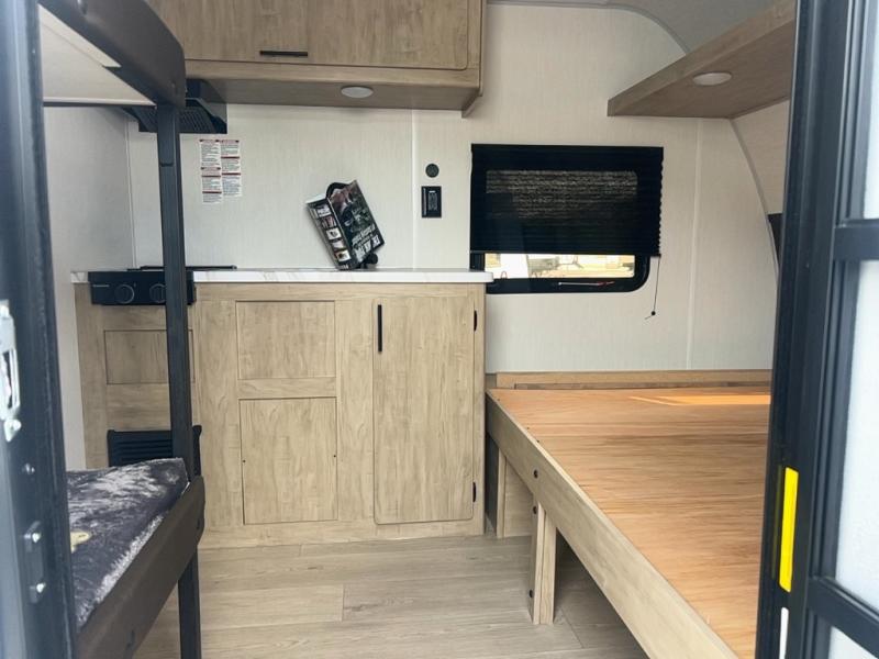 This travel trailer is perfect for epic road trips, memorable camping excursions, or rejuvenating getaways. The full bathroom is equipped with everything you need for a comfortable stay, providing a convenient spot to freshen up after a long day of exploring. The kitchen is equipped with a refrigerator for keeping drinks and ingredients fresh, and a microwave for quick reheating. The bunk beds are a great spot to take a nap or a kid's sleeping space. Overhead cabinets provide additional storage for cookware, dishes, and other essentials. In addition, the queen-sized bed provides a comfortable sleeping space, perfect for relaxing after a long day.