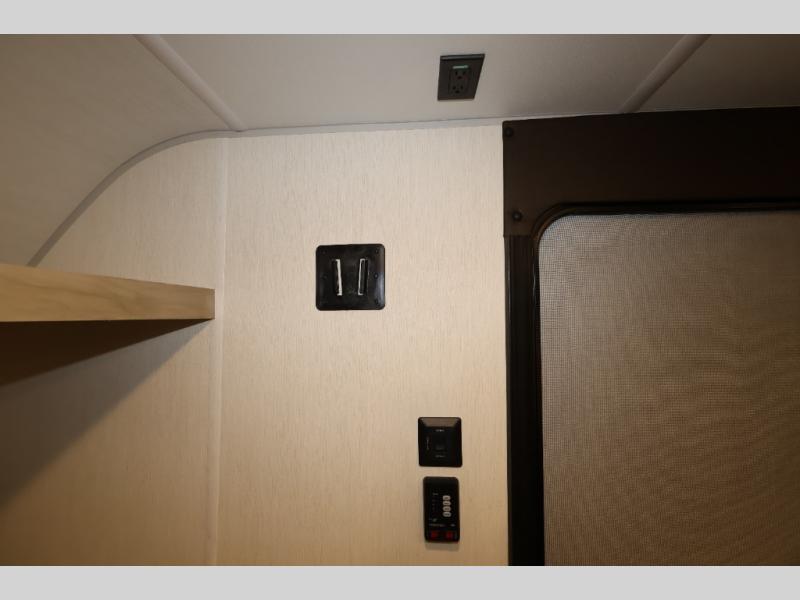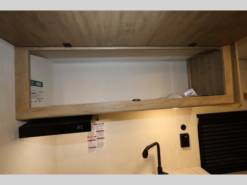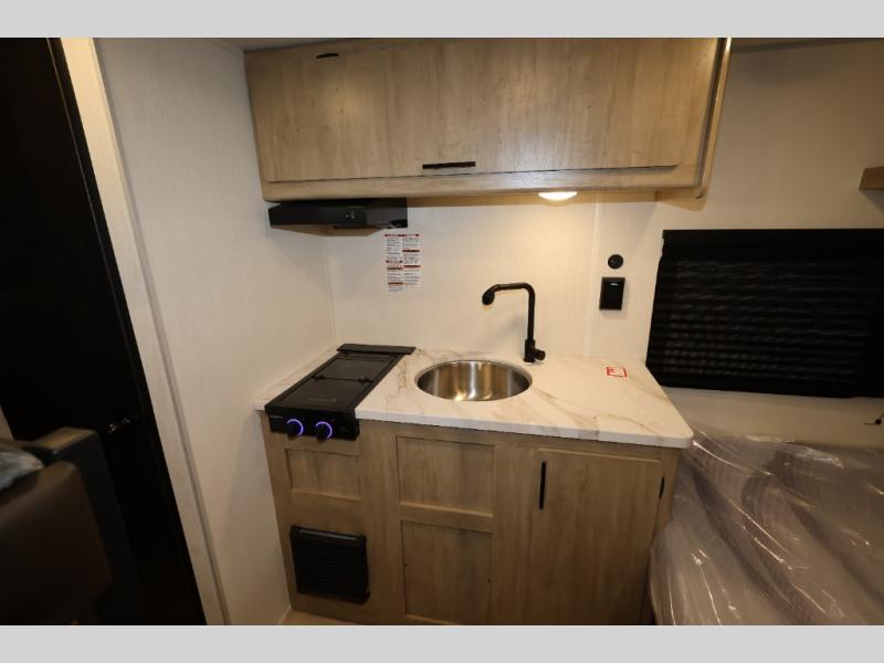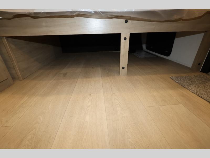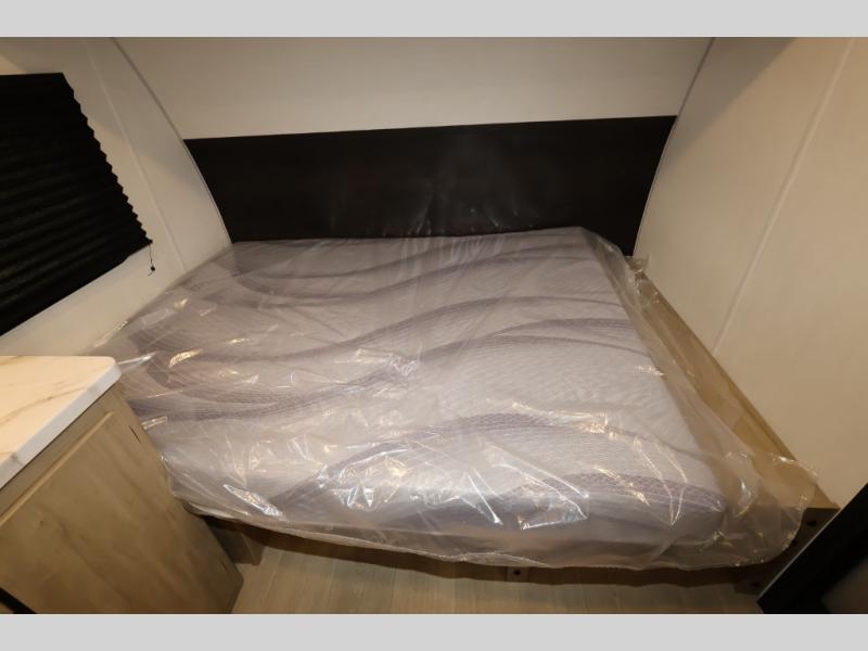 This travel trailer is perfect for epic road trips, memorable camping excursions, or rejuvenating getaways. The private bathroom is equipped with everything you need for a comfortable stay, providing a convenient spot to freshen up after a long day of exploring. The kitchen is equipped with a refrigerator for keeping drinks and ingredients fresh, and a microwave for quick reheating. The bunk beds are a great spot to take a nap or a kid's sleeping space. Overhead cabinets provide additional storage for cookware, dishes, and other essentials. In addition, the queen-sized bed provides a comfortable sleeping space, perfect for relaxing after a long day.