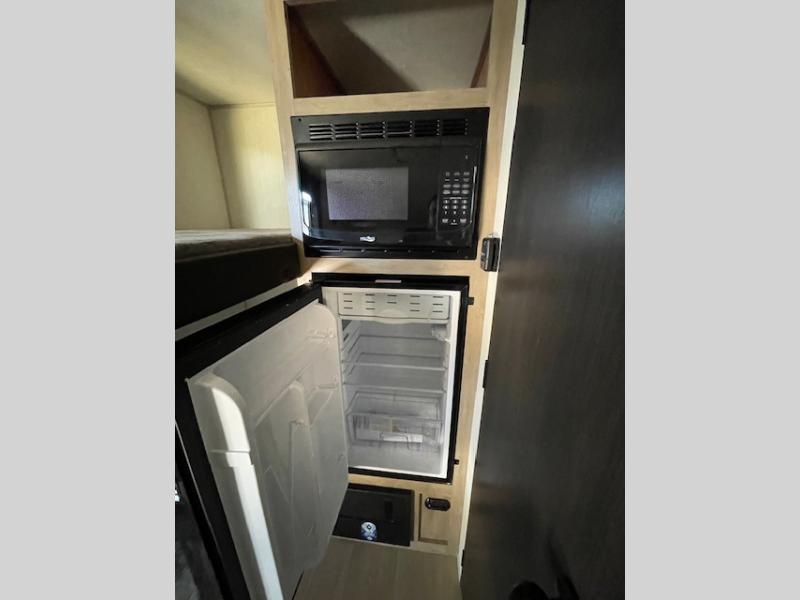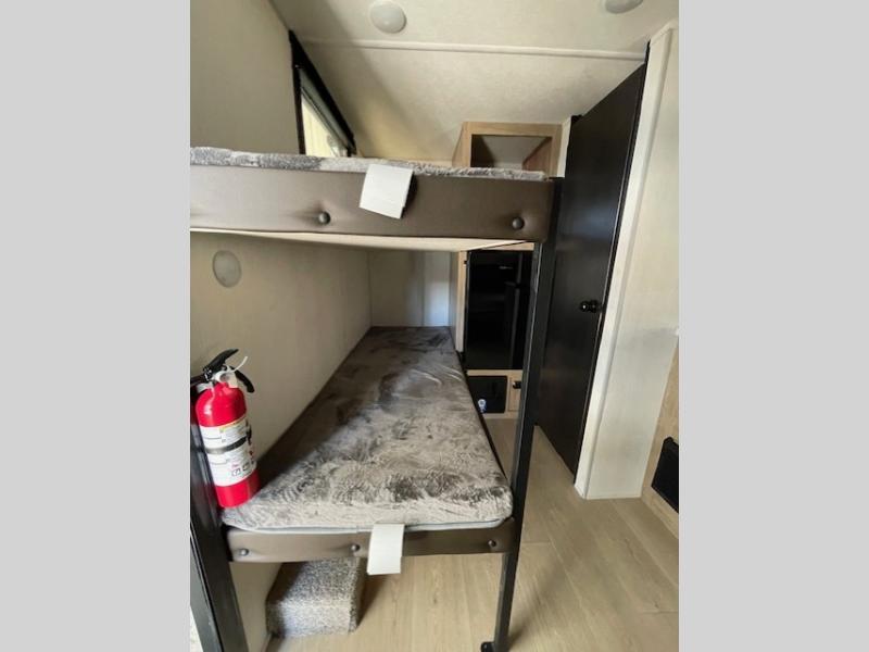 This travel trailer is perfect for epic road trips, memorable camping excursions, or rejuvenating getaways. The private bathroom is equipped with everything you need for a comfortable stay, providing a convenient spot to freshen up after a long day of exploring. The kitchen is equipped with a refrigerator for keeping drinks and ingredients fresh, and a microwave for quick reheating. The bunk beds are a great spot to take a nap or a kid's sleeping space. Overhead cabinets provide additional storage for cookware, dishes, and other essentials. In addition, the queen-sized bed provides a comfortable sleeping space, perfect for relaxing after a long day.
