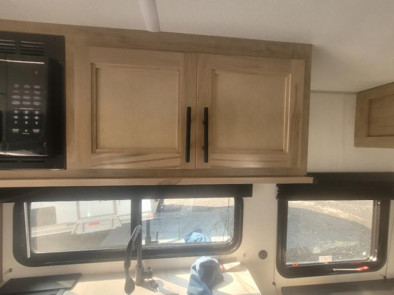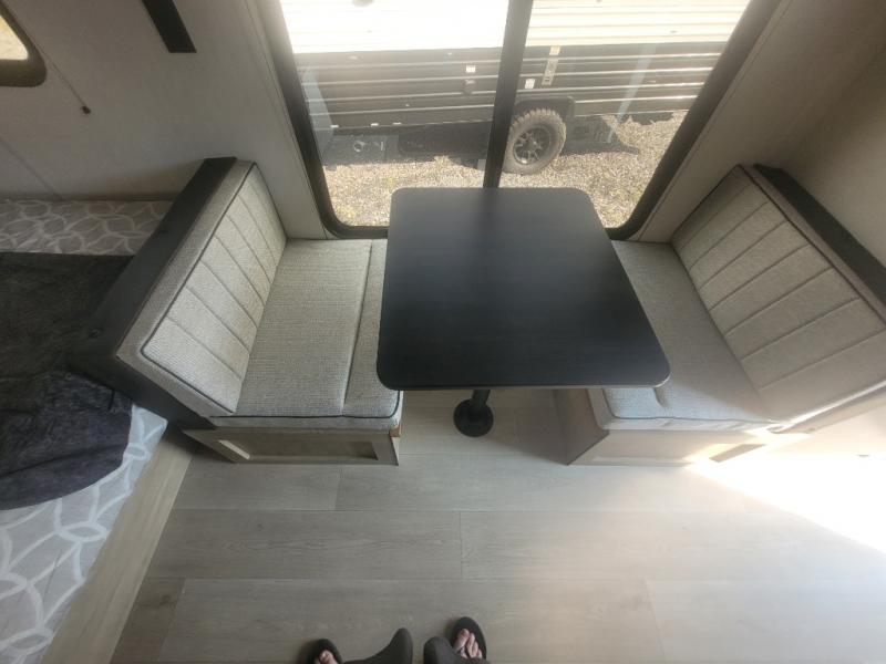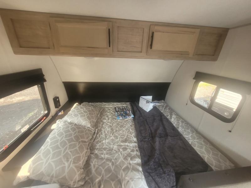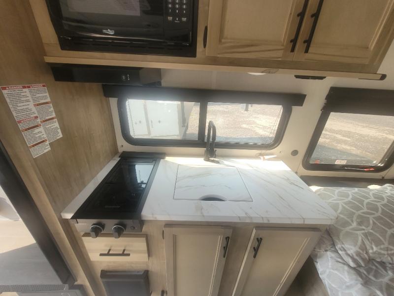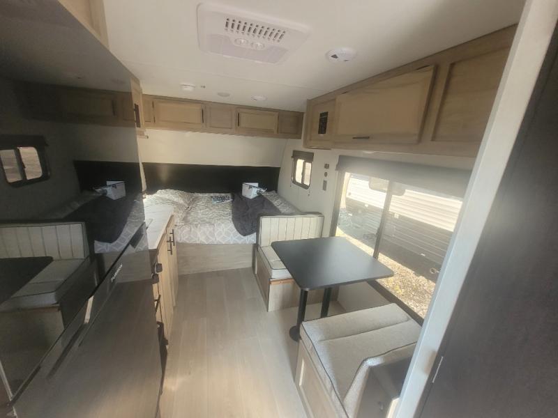 There are lots of features packed into this 19' travel trailer! The rear entry design creates a split bathroom for one person to use the private toilet while another freshens up in the private shower. You can prepare your best home cooked meals with the high output cooktop, the 12V high efficiency refrigerator, and a sink to make clean up easier, plus you can comfortably enjoy your meals at the booth dinette with a TV mount location. The front queen bed provides a comfortable place to lay your head at night. Store your outdoor gear in the outside storage area, rinse the mud off your feet with the outside shower, and watch the big game outdoors with the outside TV mount!