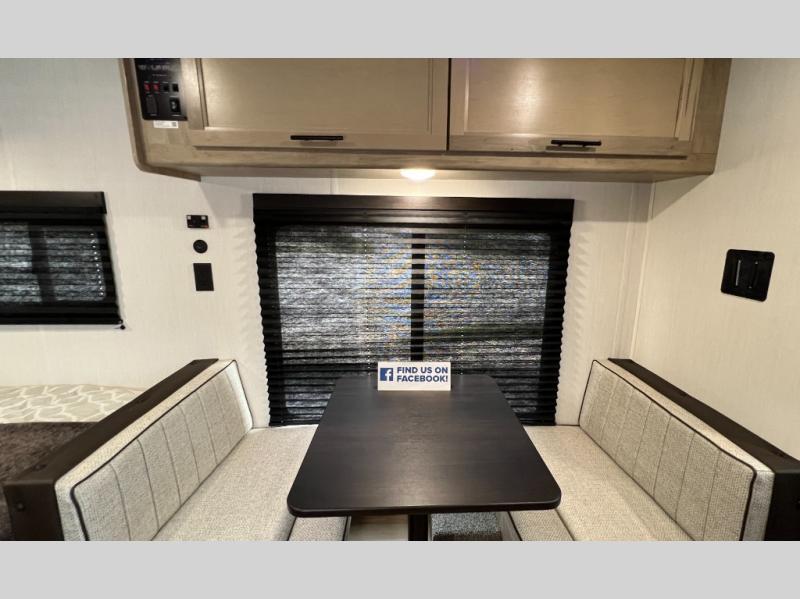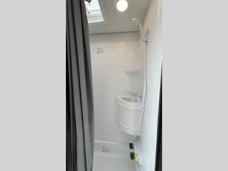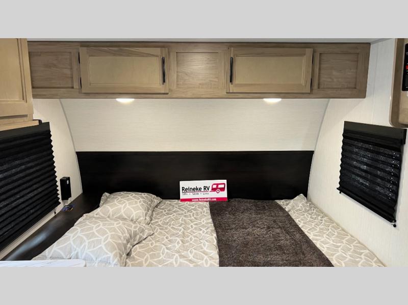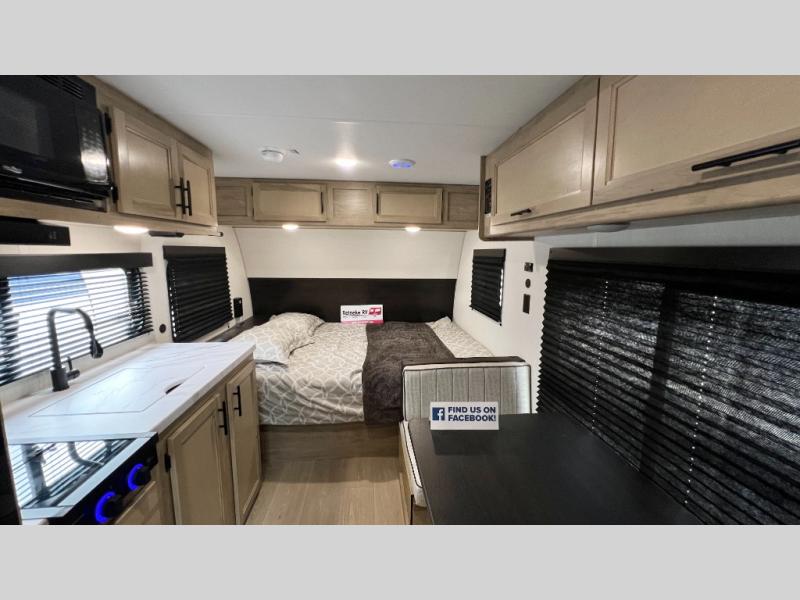 There are lots of features packed into this 19' travel trailer! The rear entry design creates a split bathroom for one person to use the private toilet while another freshens up in the private shower. You can prepare your best home cooked meals with the high output cooktop, the 12V high efficiency refrigerator, and a sink to make clean up easier, plus you can comfortably enjoy your meals at the booth dinette with a TV mount location. The front queen bed provides a comfortable place to lay your head at night. Store your outdoor gear in the outside storage area, rinse the mud off your feet with the outside shower, and watch the big game outdoors with the outside TV mount!