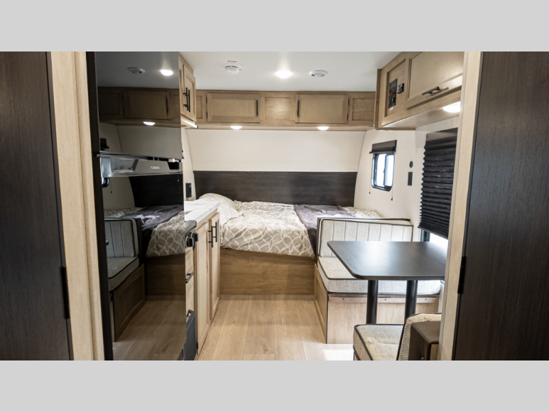 A: The 14CCW packs a front queen bed, booth dinette, and split bathroom into a tow-friendly 19' 3", 3,314 lb layout—with budget-saving MSRP and high-value amenities.