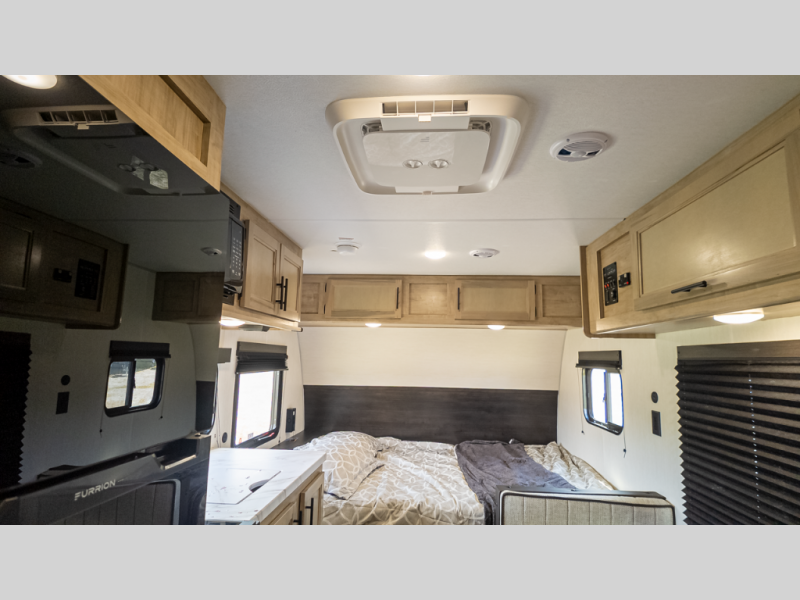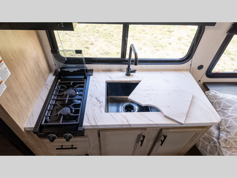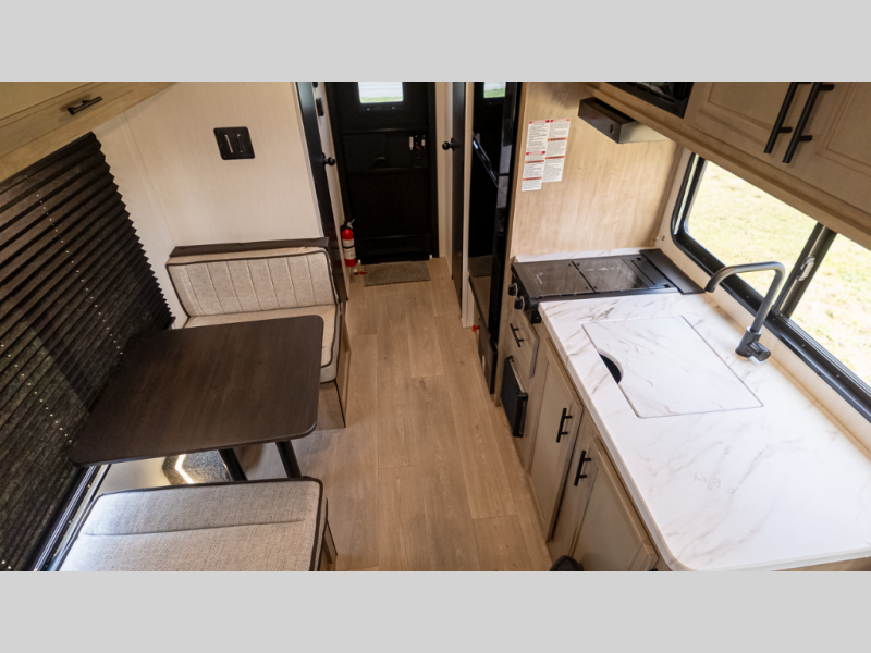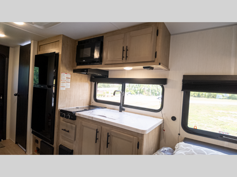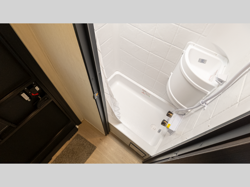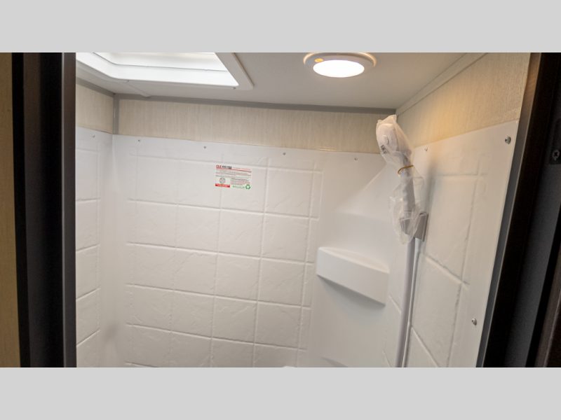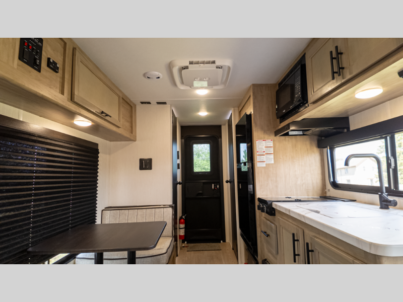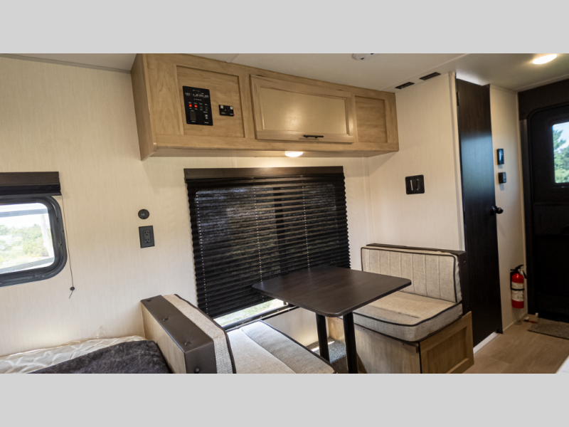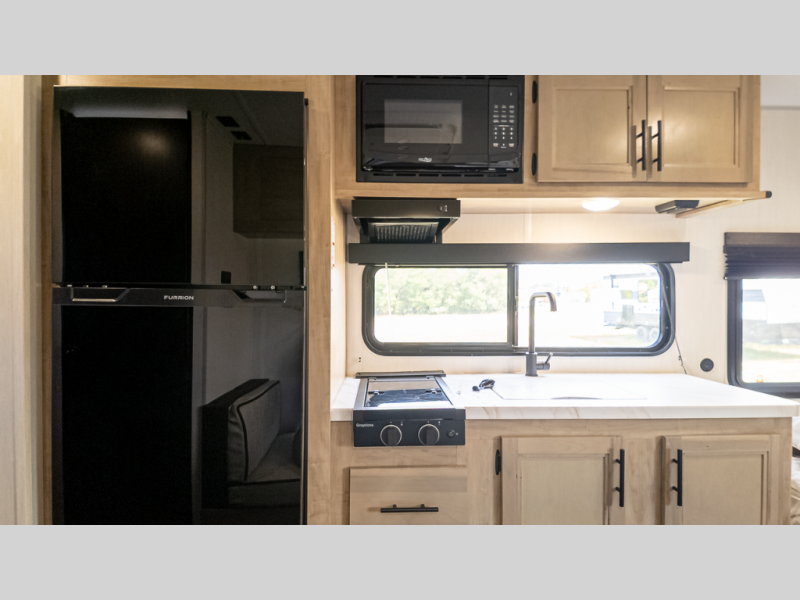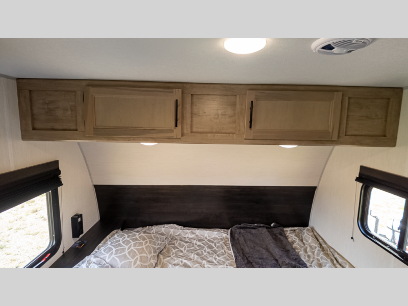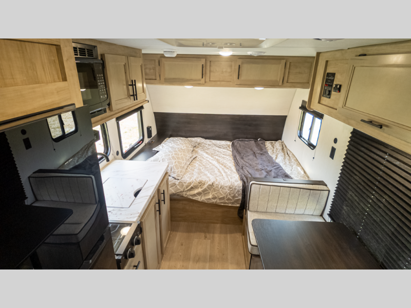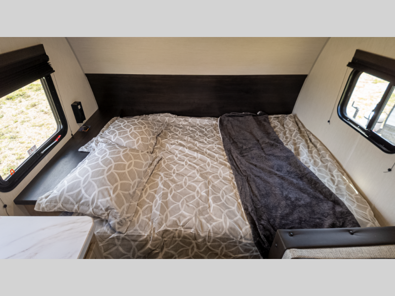There are lots of features packed into this 19' travel trailer! The rear entry design creates a split bathroom for one person to use the private toilet while another freshens up in the private shower. You can prepare your best home cooked meals with the high output cooktop, the 12V high efficiency refrigerator, and a sink to make clean up easier, plus you can comfortably enjoy your meals at the booth dinette with a TV mount location. The front queen bed provides a comfortable place to lay your head at night. Store your outdoor gear in the outside storage area, rinse the mud off your feet with the outside shower, and watch the big game outdoors with the outside TV mount!