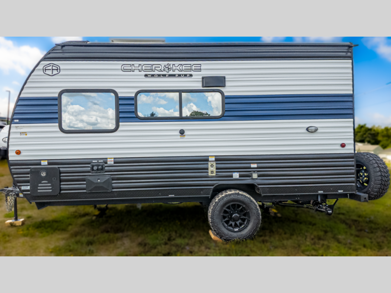 Each one of these Forest River Cherokee Wolf Pup travel trailers are lightweight and easy to tow! They are fully self contained with ample tank capacities, an abundance of storage space, and filled with at home amenities. The aerodynamic smooth radius front profile, the Power Gear frame technology, and the space saver rail design make them easier to maneuver. You will also appreciate the seamless roofing membrane with heat reflectivity to keep the sun from making your unit a hot box. The tongue and groove plywood flooring will hold up for years of fun and the USB charging stations help to keep your electronics at 100% while you're away. Come find the best model for you today!