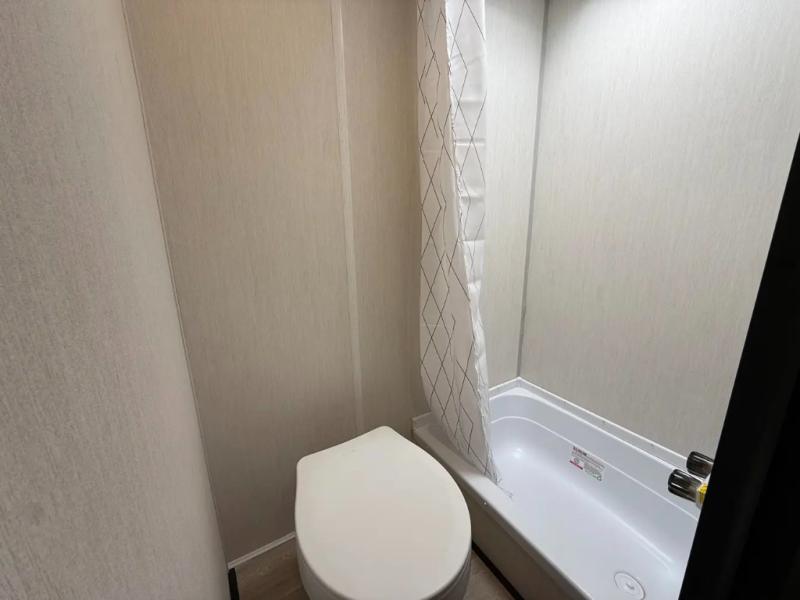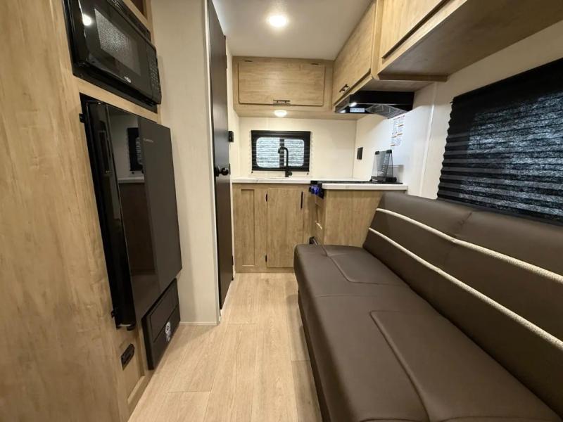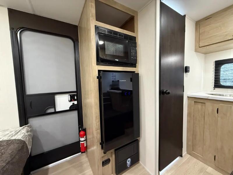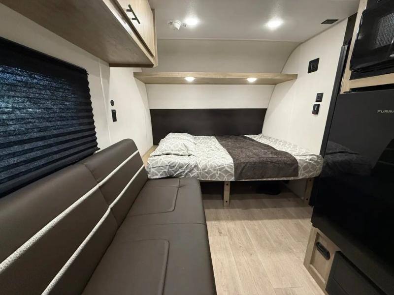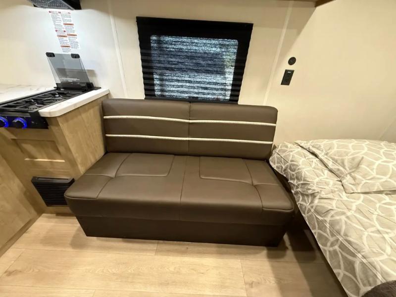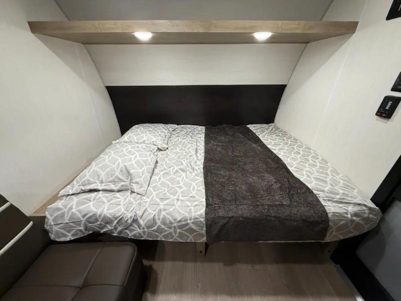 You will be enchanted by this travel trailer! The bathroom is equipped with everything you need for a comfortable stay. The kitchen is equipped with a refrigerator for keeping drinks and perishables fresh, a microwave for quick reheating, and a cooktop for preparing meals. The sofa provides a comfortable seating area for relaxation and an extra sleeping area. Overhead cabinets and a shelf provide additional storage for essentials, cookware, and dishes. The queen-sized bed allows a comfortable sleeping space, perfect for unwinding after a long day.