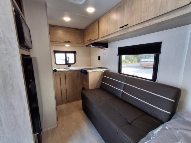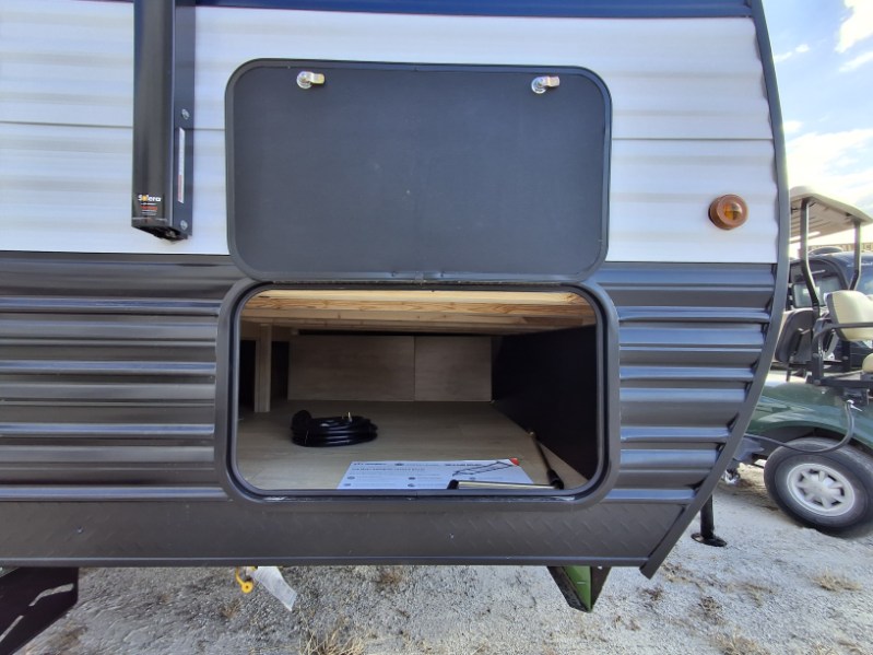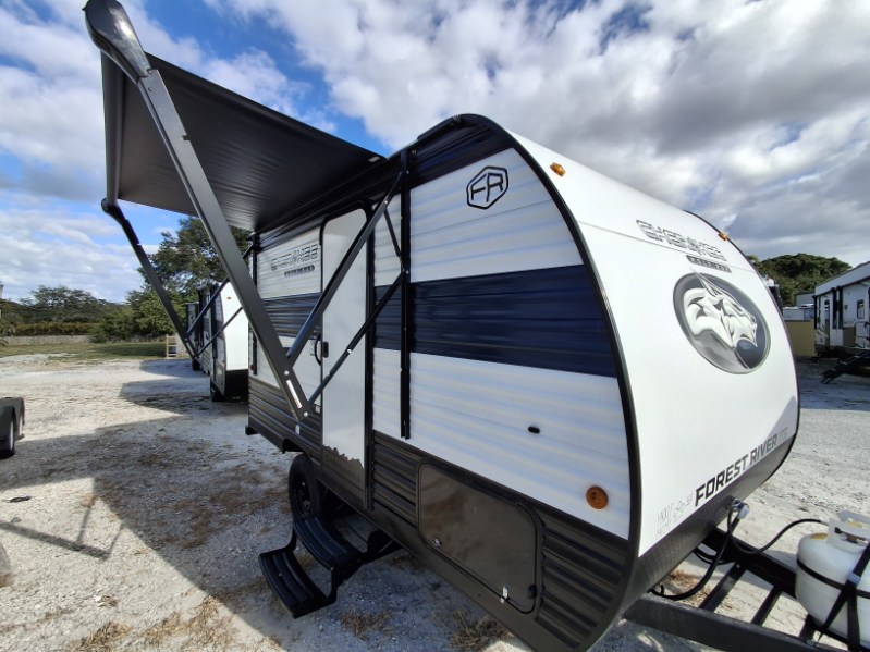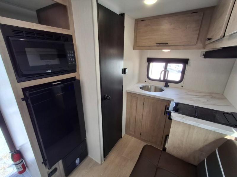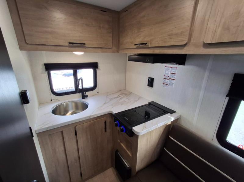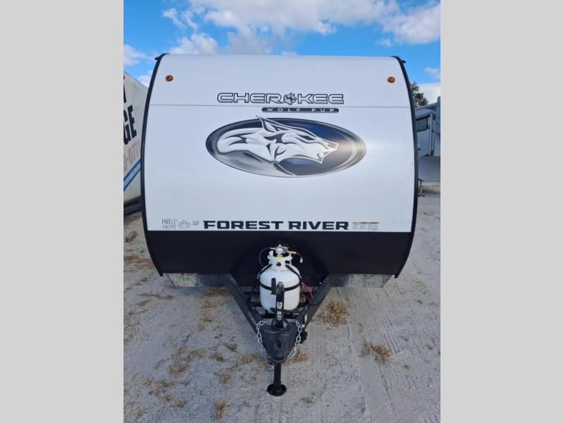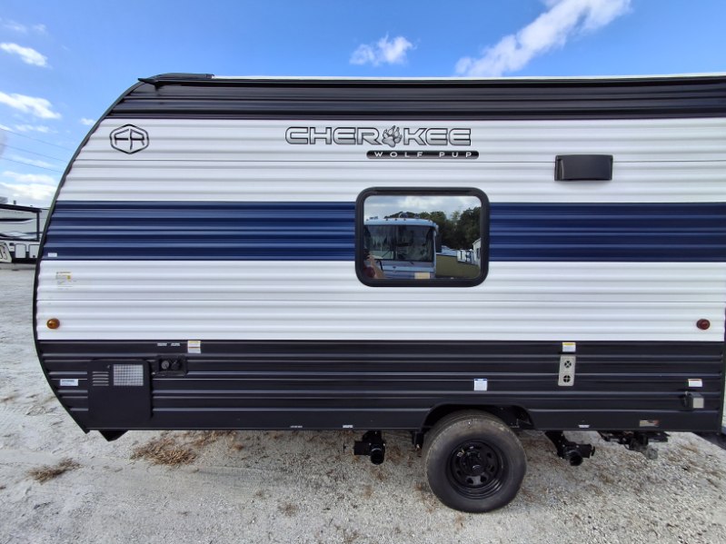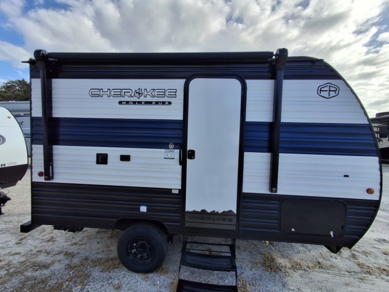 The 2026 Forest River Cherokee Wolf Pup 14CC is a lightweight, easily towable travel trailer that is approximately 19' 3" long, sleeps up to 4 people, and features a rear entrance. It includes a queen bed with under-bed storage, a kitchen with a flush-mount glass cooktop and a large 10.3 cu. ft. refrigerator, and a "split-style" bathroom with separate shower and toilet facilities. Key amenities are its off-road tires, power awning, solar prep, and outdoor features like a pet/bike leash latch and speakers.