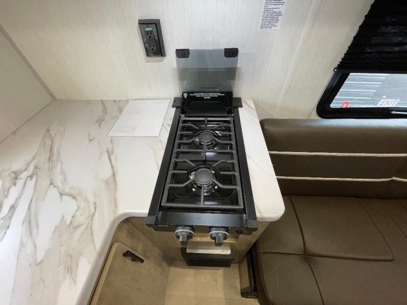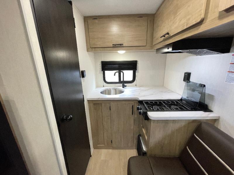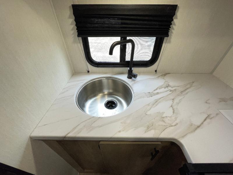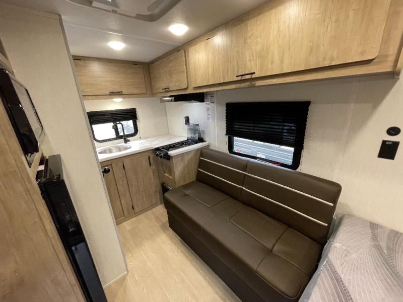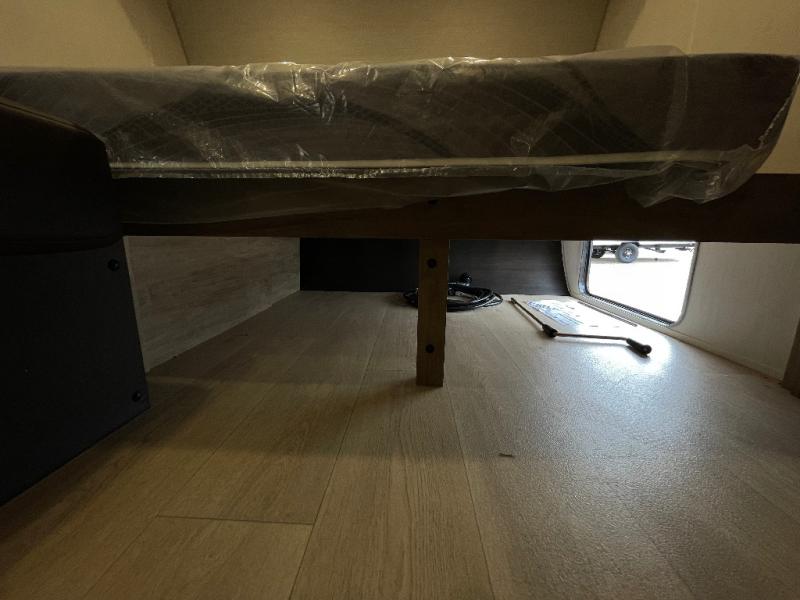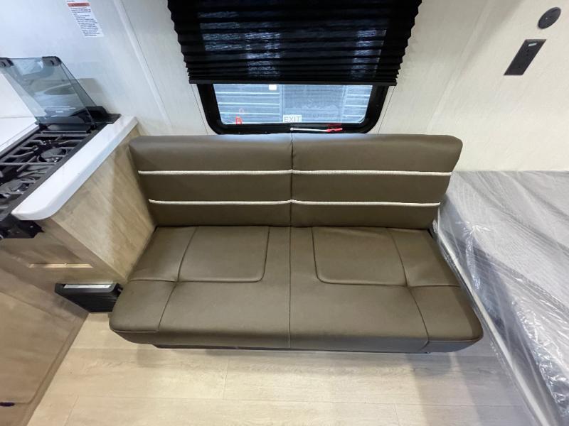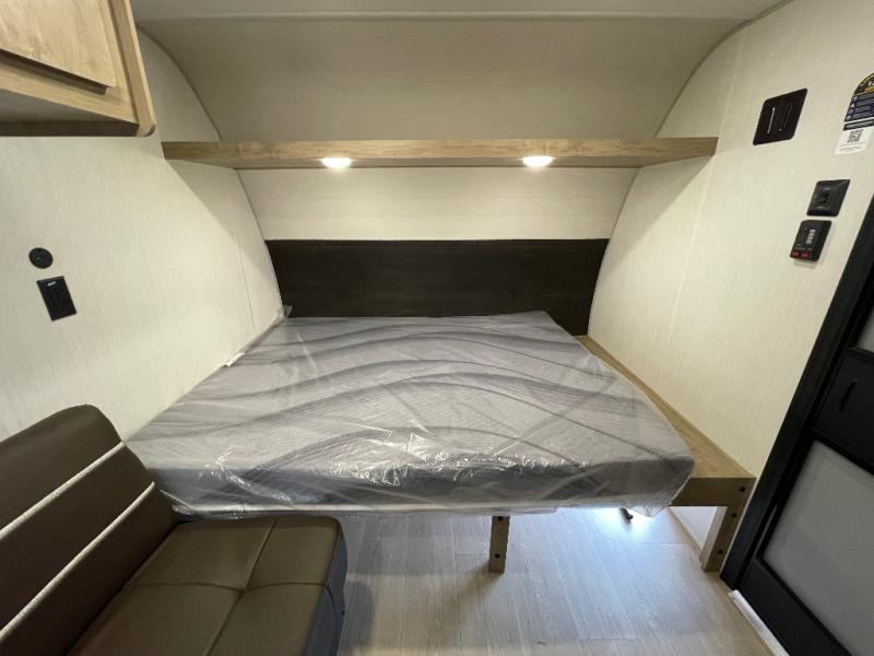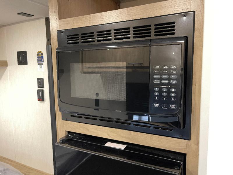 You will be enchanted by this travel trailer! The bathroom is equipped with everything you need for a comfortable stay. The kitchen is equipped with a refrigerator for keeping drinks and perishables fresh, a microwave for quick reheating, and a cooktop for preparing meals. The sofa provides a comfortable seating area for relaxation and an extra sleeping area. Overhead cabinets and a shelf provide additional storage for essentials, cookware, and dishes. The queen-sized bed allows a comfortable sleeping space, perfect for unwinding after a long day.
